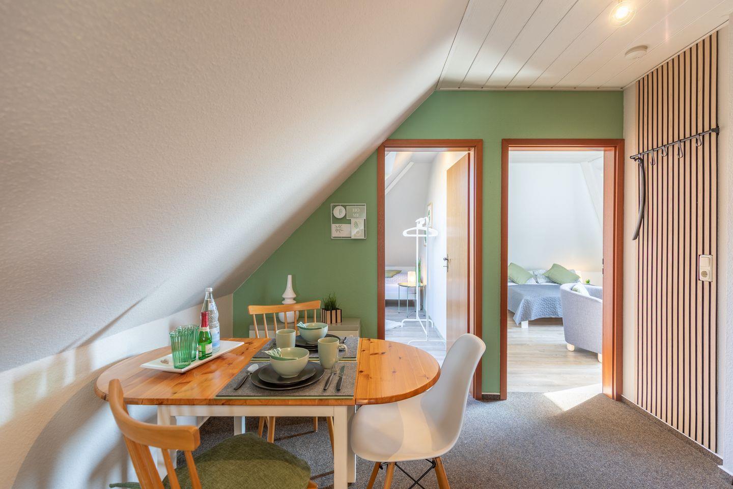 Die ca. 50 Quadratmeter große Ferienwohnung „Grachtennest“ befindet sich im ersten Obergeschoss eines Wohnhauses und ist über eine innenliegende Treppe erreichbar. Die Wohnung verfügt über zwei separate Schlafzimmer: Das größere Zimmer ist mit einem Doppelbett (160 × 200 cm) und einer Sitzecke mit Flachbildfernseher ausgestattet. Im zweiten Schlafzimmer befindet sich ein Einzelbett (80 × 200 cm). Die Küche ist vollständig eingerichtet und bietet unter anderem eine Kaffeemaschine, einen Kühlschrank, ein Kochfeld sowie Koch- und Essgeschirr – ideal für die Selbstverpflegung im Urlaub. Ein angrenzender Essbereich lädt zum gemeinsamen Essen ein. Das hell gestaltete Bad ist funktional ausgestattet und verfügt über eine Dusche, ein WC und ein Waschbecken.