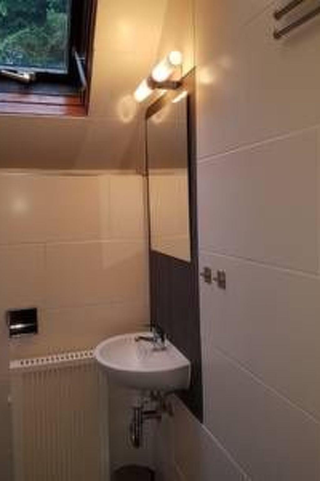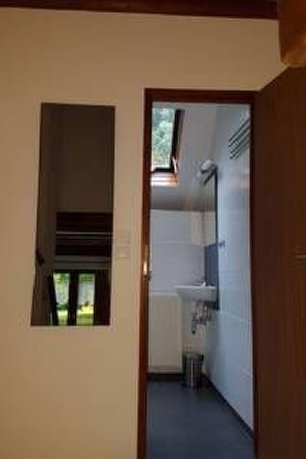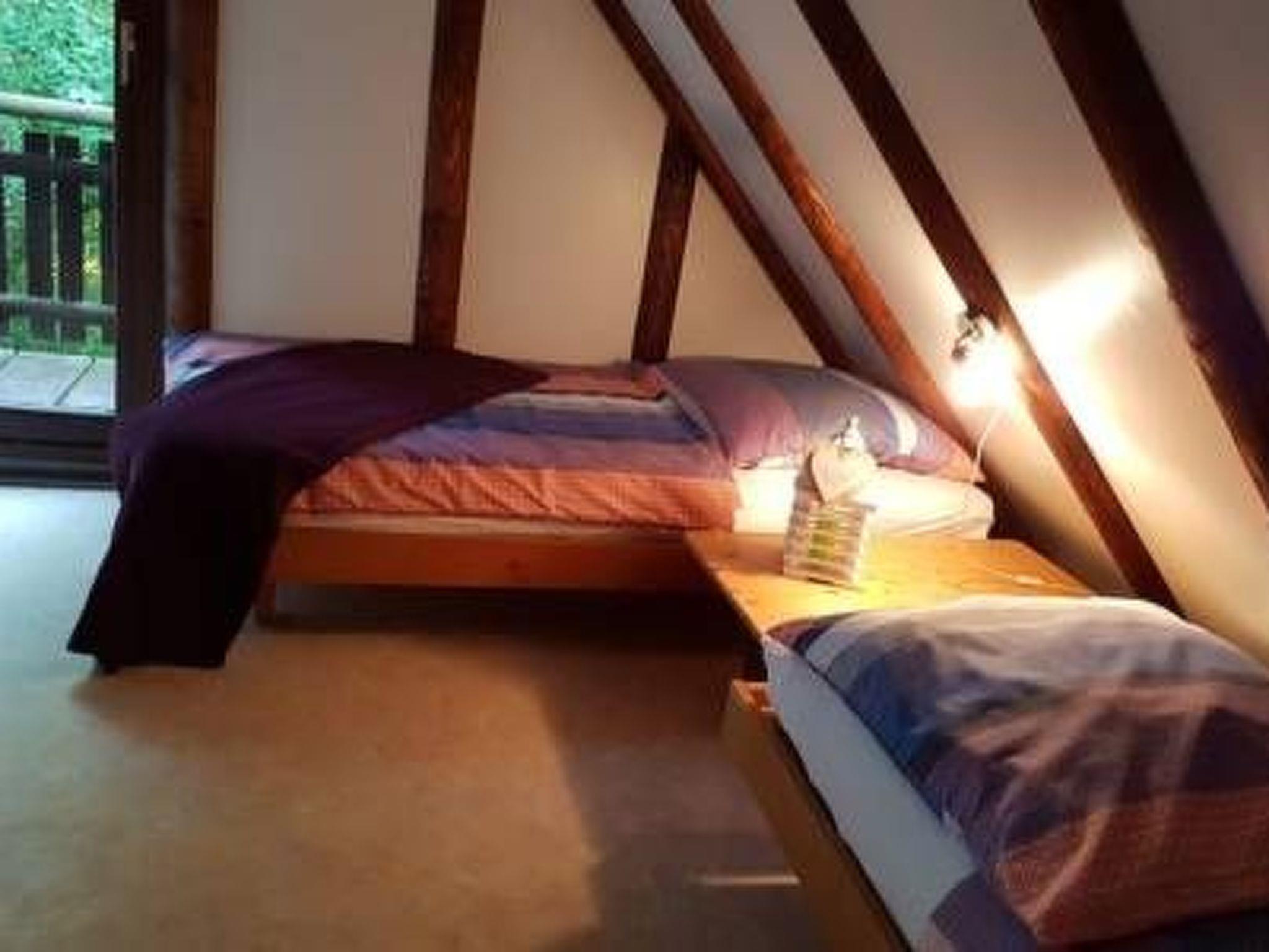 A charming wooden staircase leads to the top floor, where there are two further bedrooms. These are each equipped with a double bed and two single beds respectively and their own washbasins. The idyllic surroundings can be admired and enjoyed from the balcony.