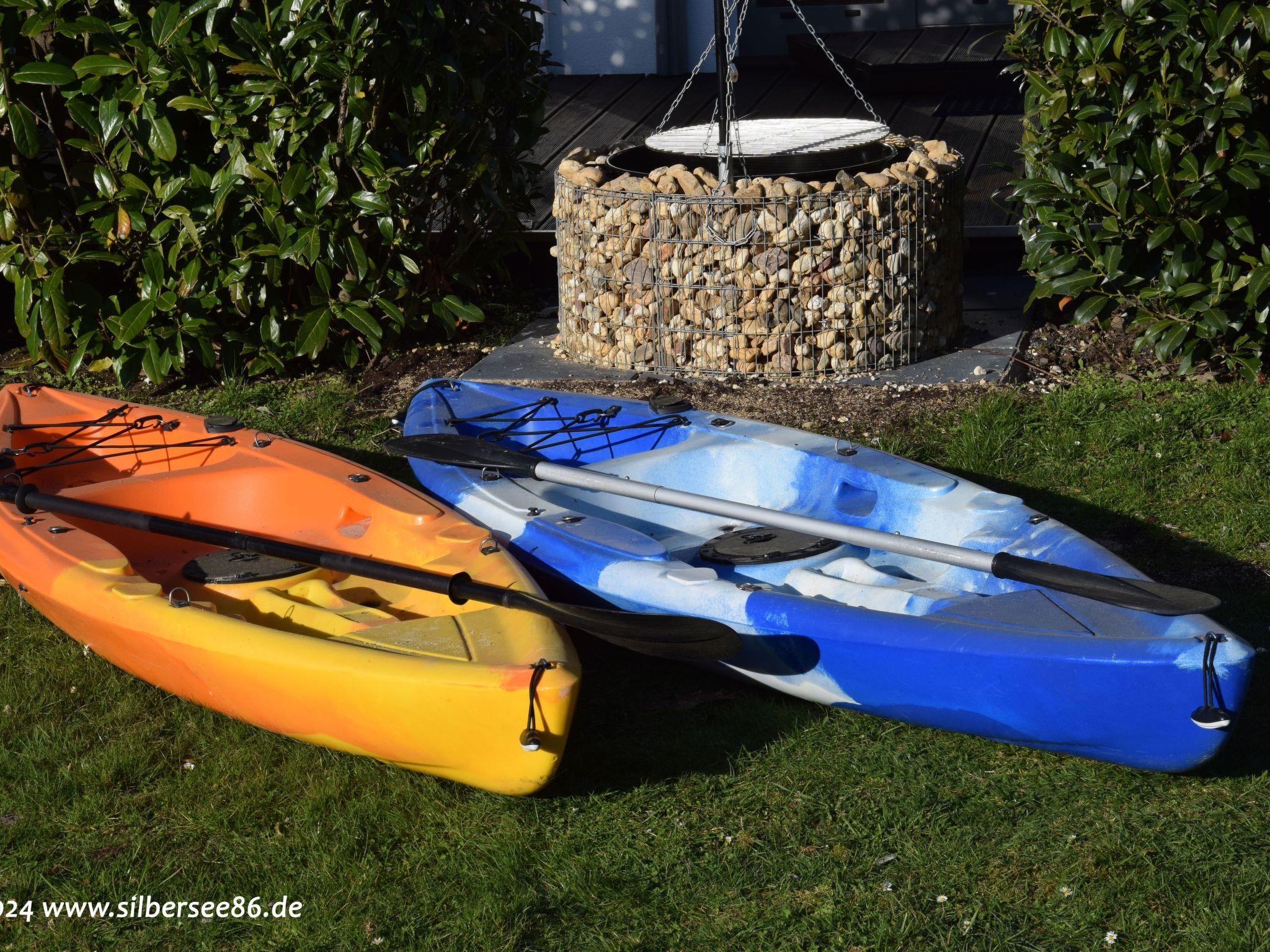 2 professional kayaks with paddles, life jackets and transport trolley.