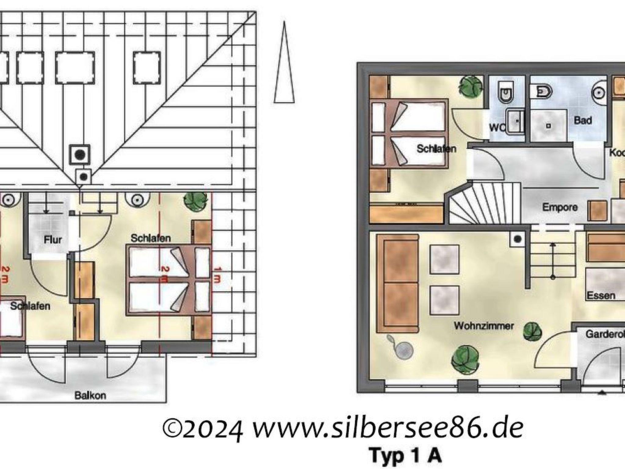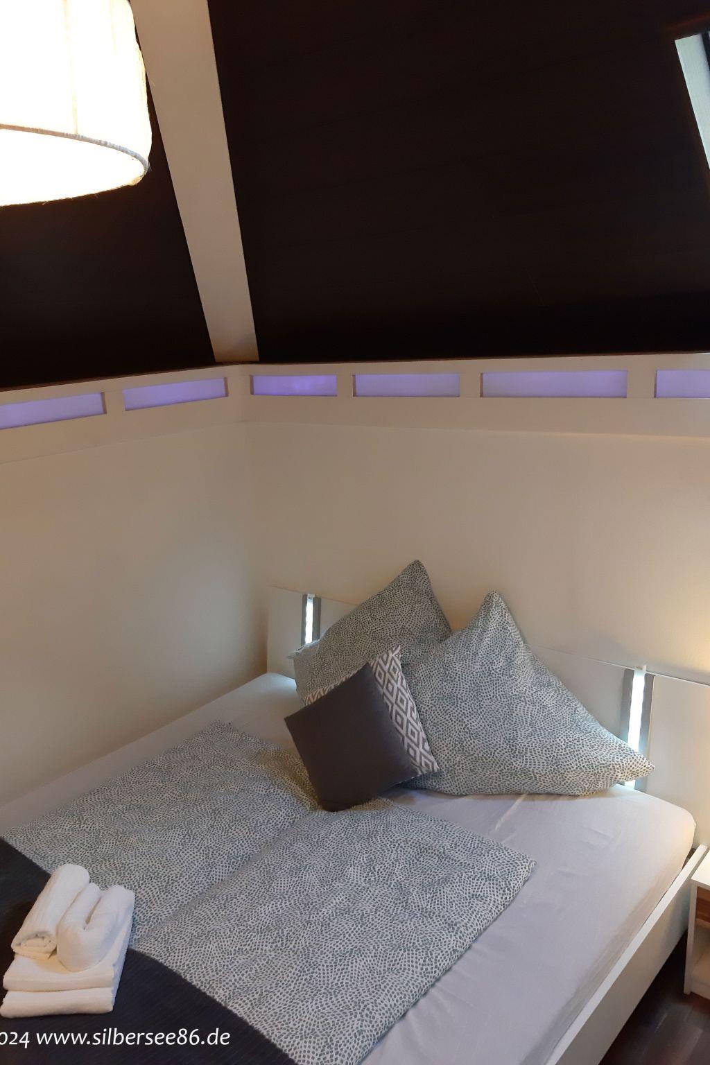 Cosy living room with L-shaped sofa bed (approx. 140 cm x 200 cm), two armchairs, wood-burning stove, large dining area, 42" LCD flatscreen TV with DVD player, satellite receiver, Dolby Surround System, floor-to-ceiling windows with direct access to the large, beautifully landscaped terrace, air-conditioned (!) living area with additional ceiling fan above the sofa bed. 3 bedrooms, each with a double bed (one of which has a double bed). Bedrooms each with a double bed (including 1 double bed with a large 1.60m x 2.00m mattress - please note: 1 large sheet required), LCD flatscreen TV with DVD player and satellite receiver, safe, indirect stylish lighting. The two bedrooms on the upper floor of the house have access to the balcony, one bedroom also has its own washbasin. The bedroom on the mezzanine floor of the house has its own toilet with washbasin. Fully equipped kitchen with ceramic hob, convection oven, microwave, dishwasher, fridge-freezer, kettle, toaster, coffee machine and crockery. Bathroom 1: shower, WC and washbasin Bathroom 2: WC with washbasin (next to the bedroom on the mezzanine floor) Balcony and terrace with seating; laundry can be done at reception or in the laundry room of the Silbersee holiday park for a fee.