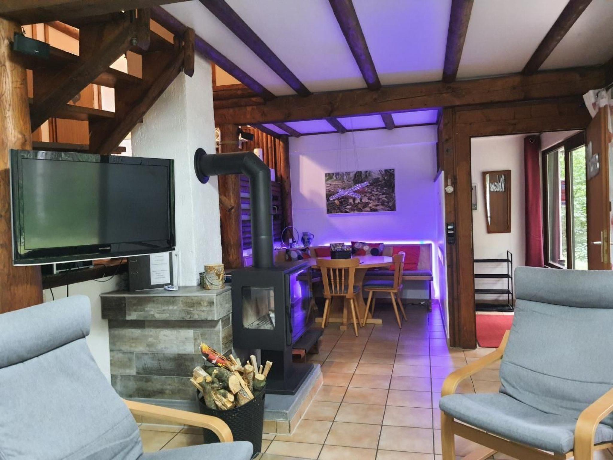 A living room with couch and two relaxing chairs, TV, DVD and Dolby surround system. The fireplace and modern infrared heating panels provide warmth and cosiness.