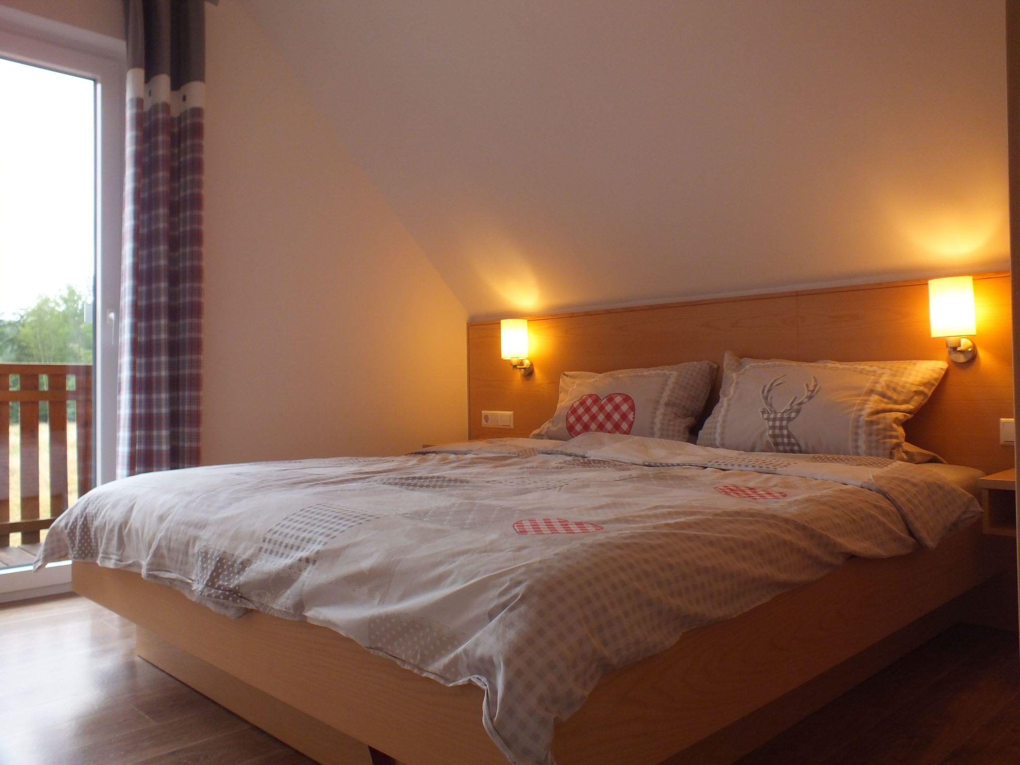 The ground floor flat "Fuchsbau" extends over 55 m² and boasts an adjoining sun terrace with a barbecue fireplace. A spacious living room, which flows into a modern fitted kitchen, offers the perfect setting for family life with its cosy sofa set and dining area. Large panoramic windows provide light-flooded rooms and direct access to the terrace. Two inviting bedrooms and a bright bathroom with shower round off the offer. The upper flat "Eulennest" impresses with similar furnishings, complemented by two charming balconies that invite you to linger at any time of day.