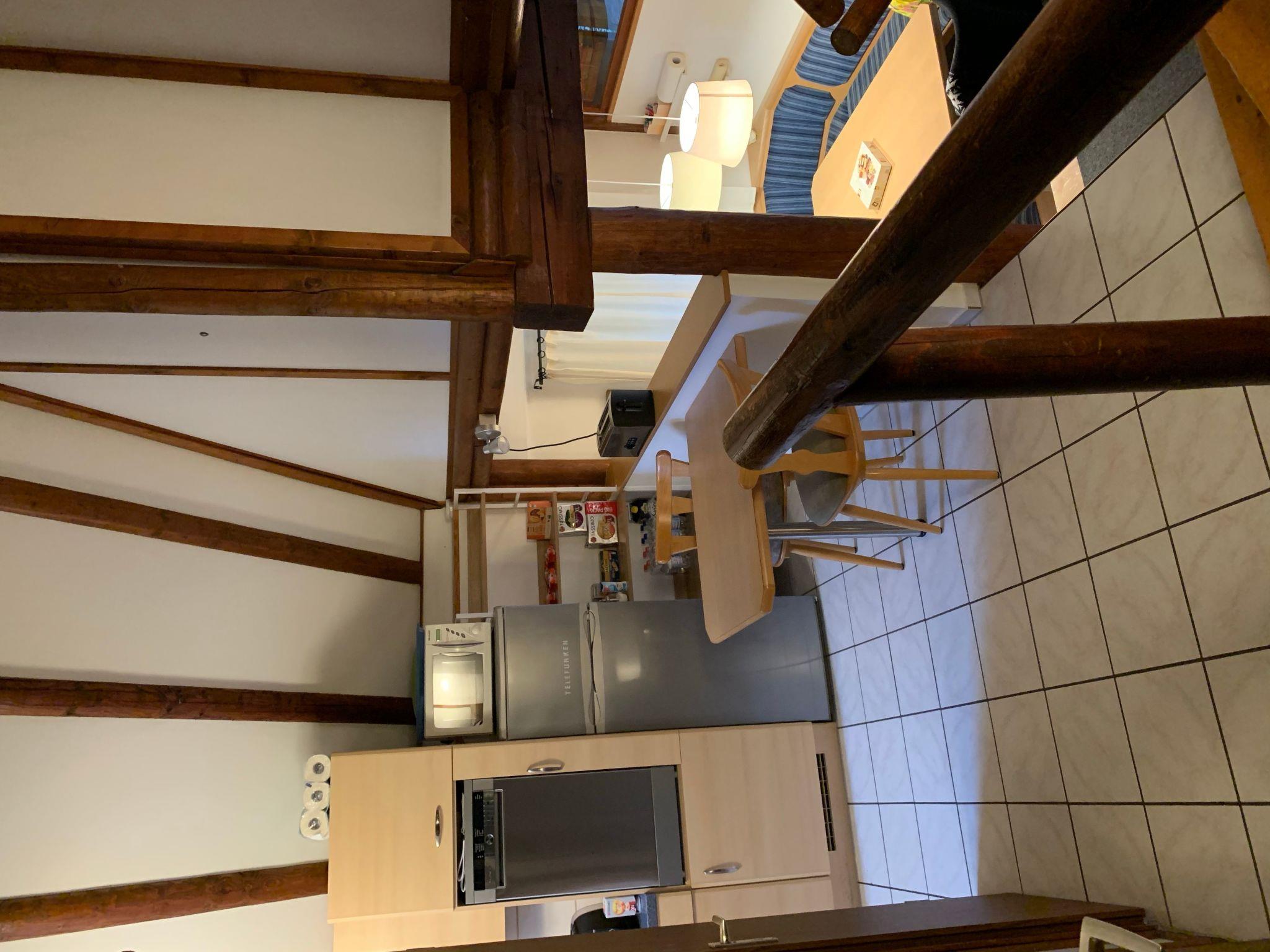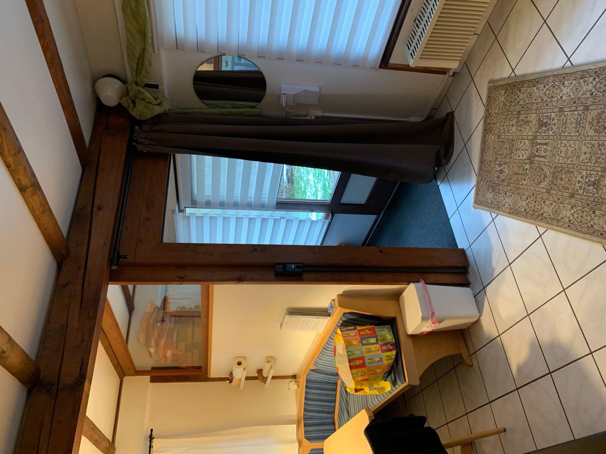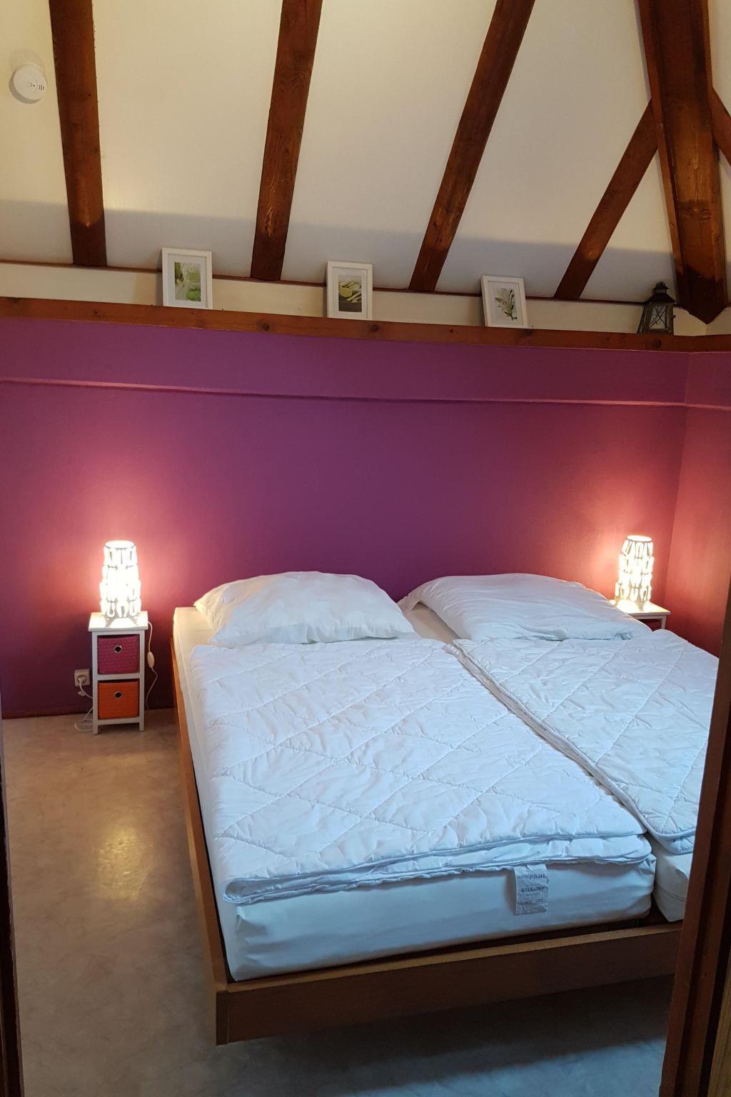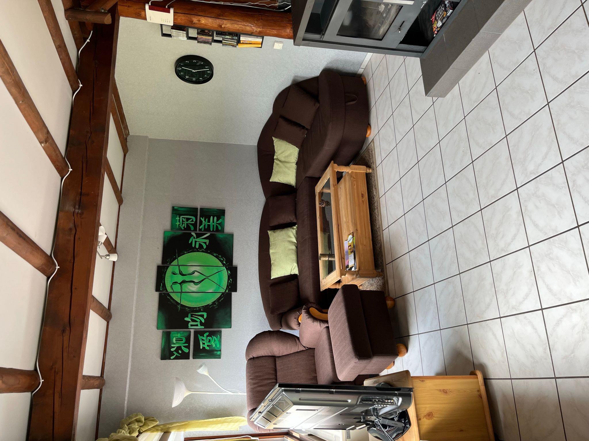 The approx. 75 m² house is spread over three levels and is ideal for a maximum of six people. You enter the open-plan living/dining area via a hallway, which has a sofa set, a coffee table, a flat screen with Sky TV (all packages), a music system with jack connection and Bluetooth for playing your mobile phone music, a fireplace and an adjoining cosy dining area. A small staircase leads to a gallery where you will find the fitted kitchen with an oven, an electric hob, a fridge, a microwave, a toaster, a kettle, a coffee machine and another small seating area. Next to this is a shower room with a shower, washbasin and toilet. There is also a bedroom on the same floor, which is furnished with a double bed (1.80 m wide) and from where you have direct access to an adjoining separate toilet room with washbasin and WC. A wooden staircase takes you to the top floor, where there are two further bedrooms. One has a double bed (1.80 m wide) and the other bedroom has two single beds (each 0.90 m wide) and its own washbasin. The house has heating, two fans and children's toys.