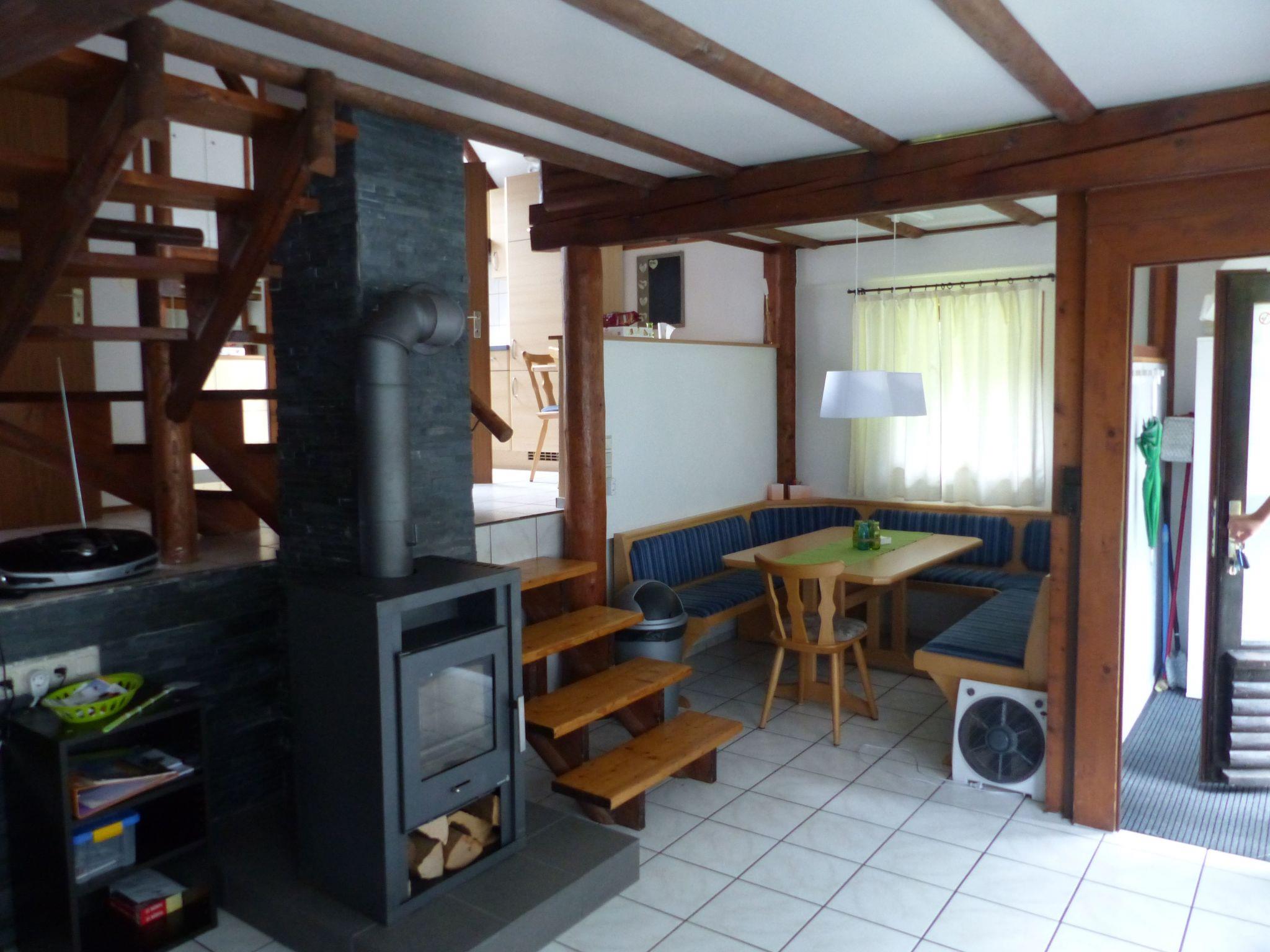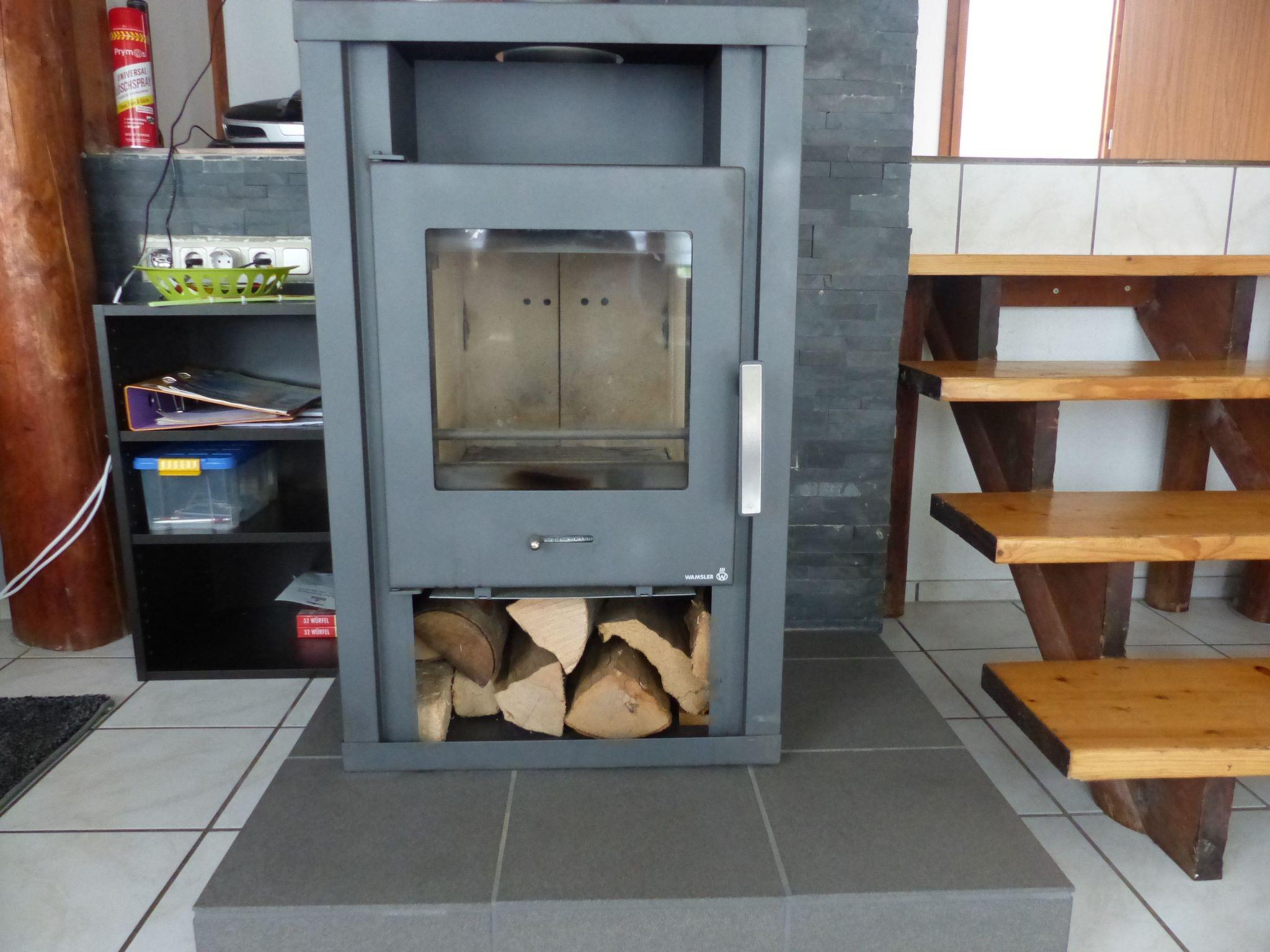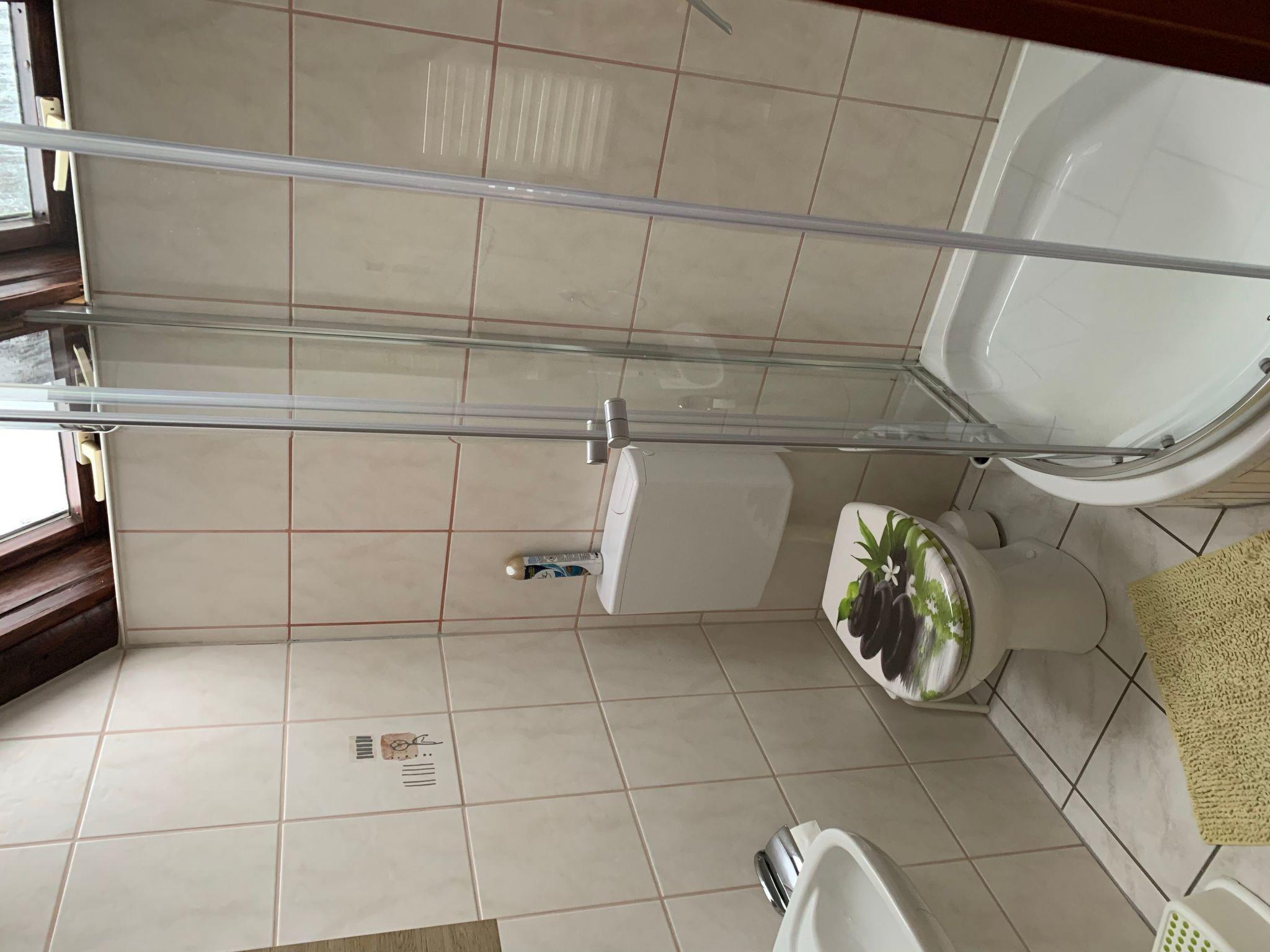 The approx. 75 m² house is spread over three levels and is ideal for a maximum of six people. You enter the open-plan living/dining area via a hallway, which has a sofa set, a coffee table, a flat screen with Sky TV (all packages), a music system with jack connection and Bluetooth for playing your mobile phone music, a fireplace and an adjoining cosy dining area. A small staircase leads to a gallery where you will find the fitted kitchen with an oven, an electric hob, a fridge, a microwave, a toaster, a kettle, a coffee machine and another small seating area. Next to this is a shower room with a shower, washbasin and toilet. There is also a bedroom on the same floor, which is furnished with a double bed (1.80 m wide) and from where you have direct access to an adjoining separate toilet room with washbasin and WC. A wooden staircase takes you to the top floor, where there are two further bedrooms. One has a double bed (1.80 m wide) and the other bedroom has two single beds (each 0.90 m wide) and its own washbasin. The house has heating, two fans and children's toys.