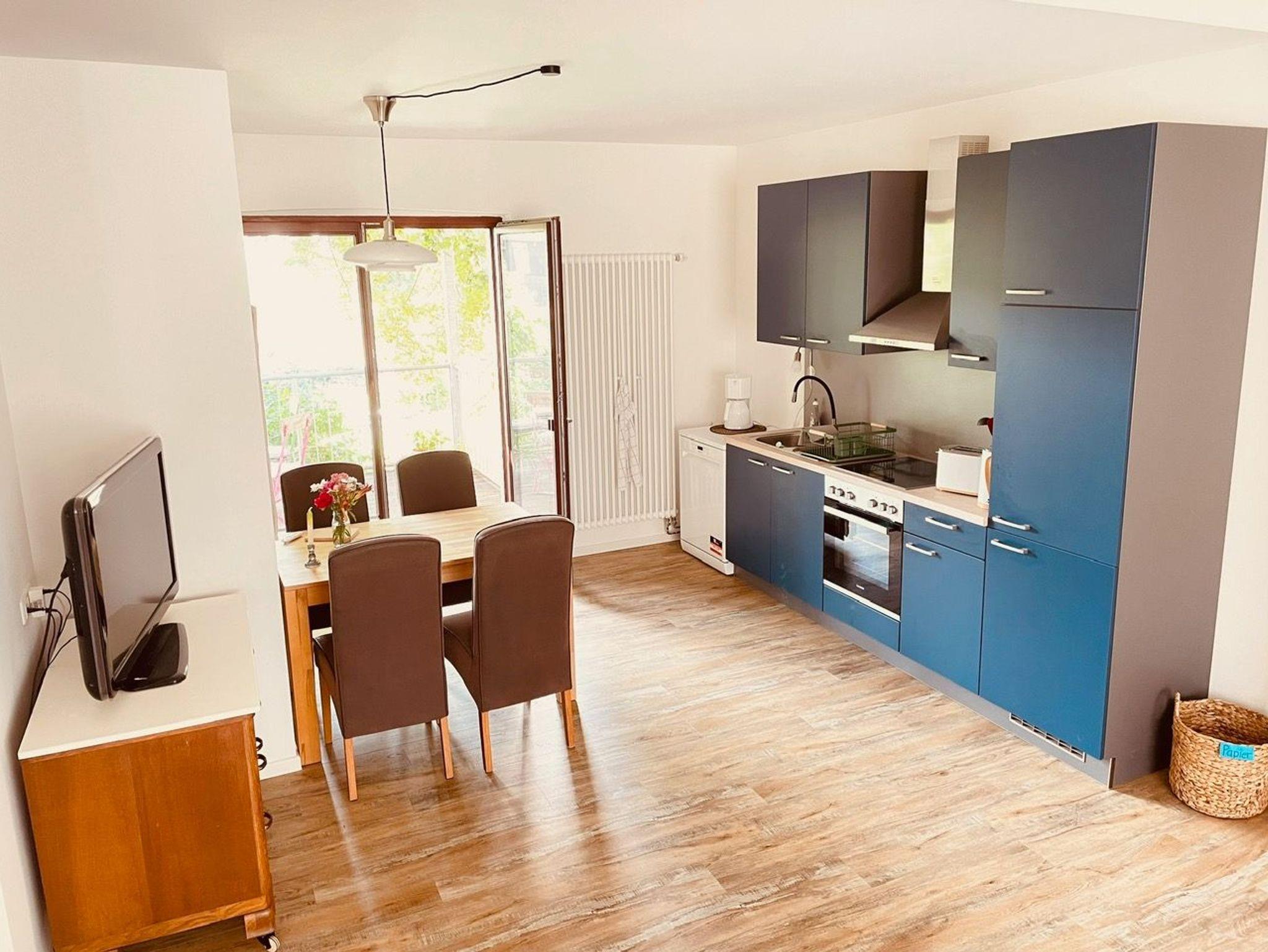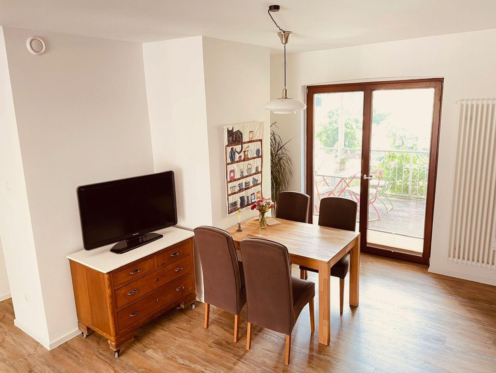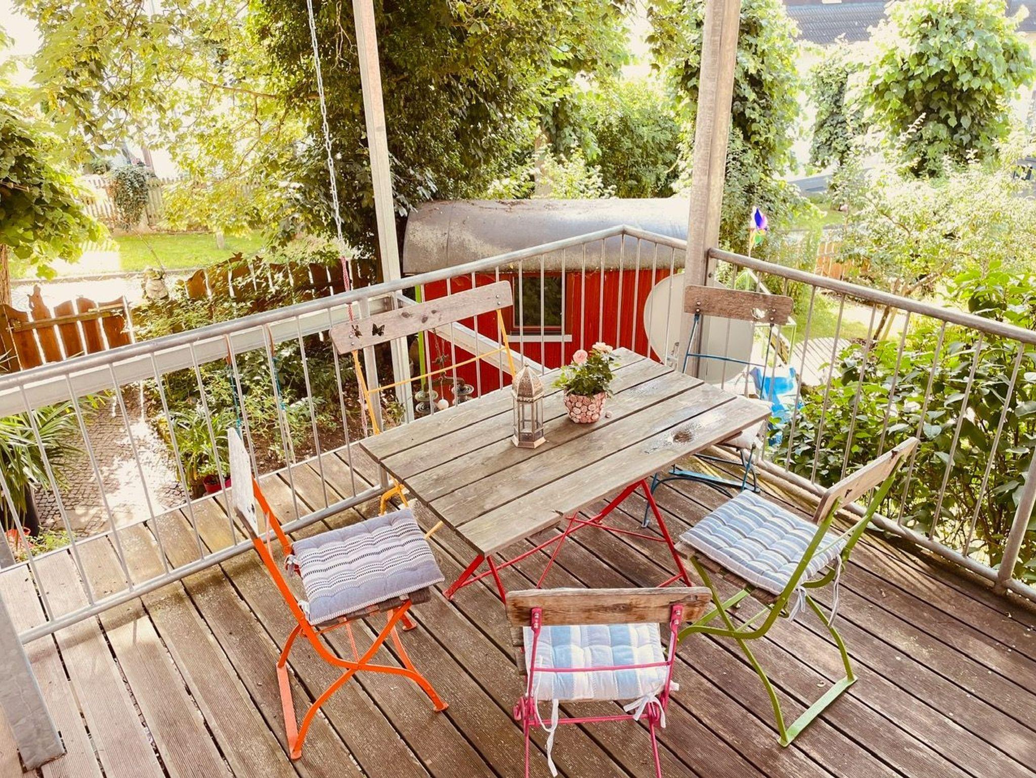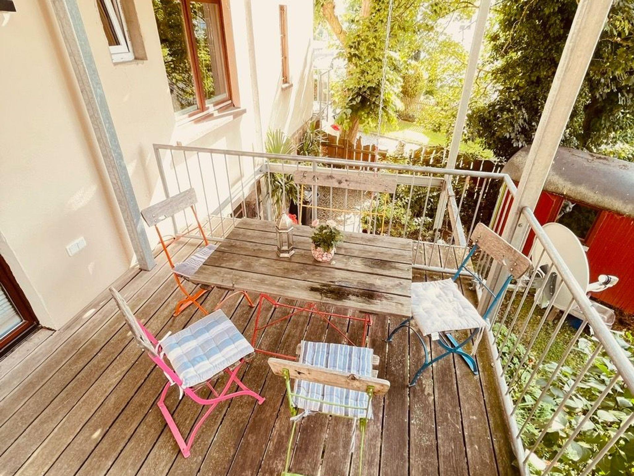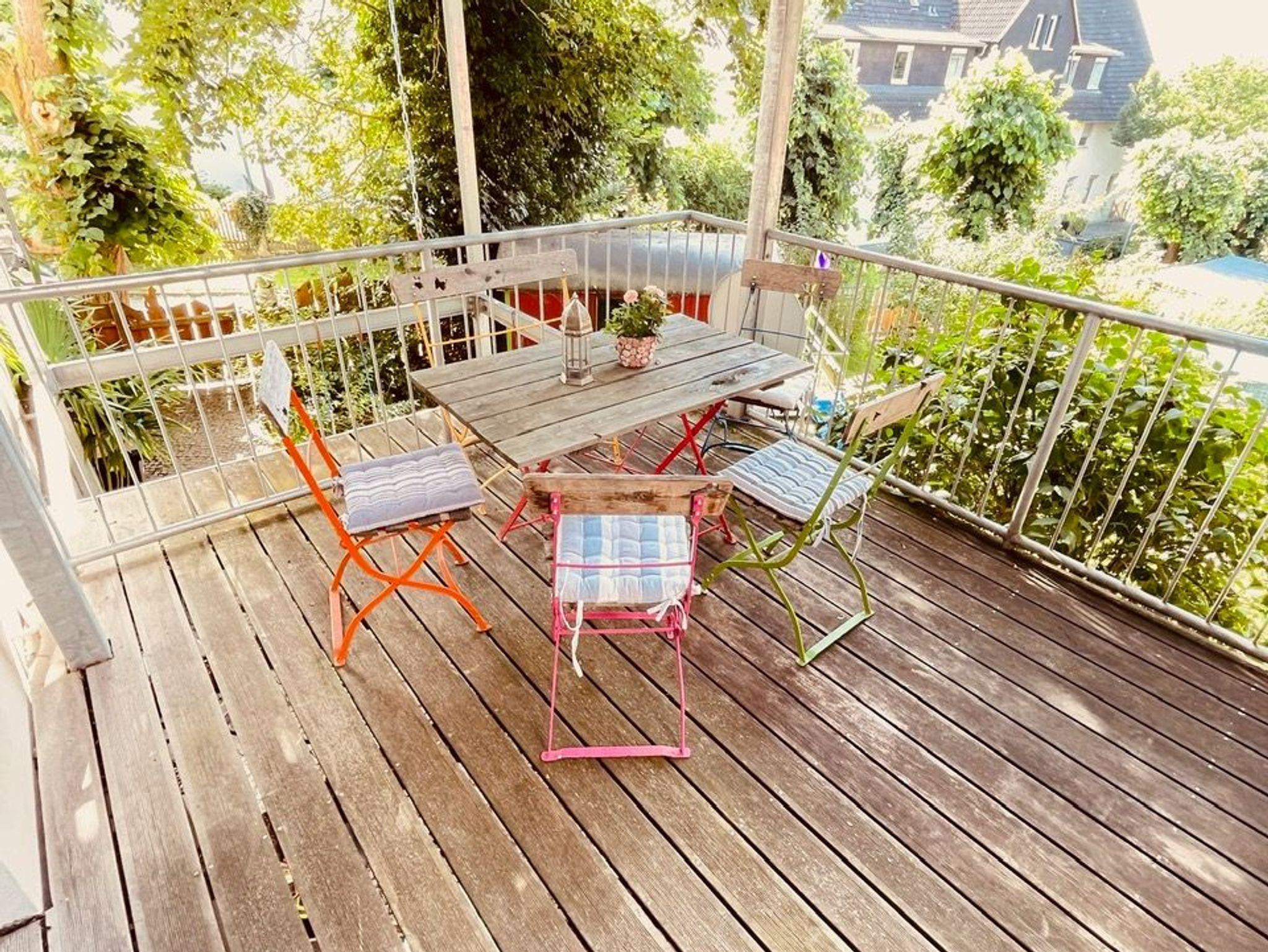 Die Wohnung erreicht man durch einen separaten Eingang im Erdgeschoss unseres Wohnhauses. Durch einen kleinen Eingangsflur mit Garderobe und Spiegel gelangt man in eine große und helle Wohnküche, die mit liebevollen Details eingerichtet zum Verweilen bei jedem Wetter einlädt. Dieser nach hinten angebaut ist ein 10m² großer Balkon mit Blick in den Garten, wo man baumhausartig im Grünen sitzt. Hier stellt sich bei gutem Wetter spontan ein Urlaubsgefühl ein.
