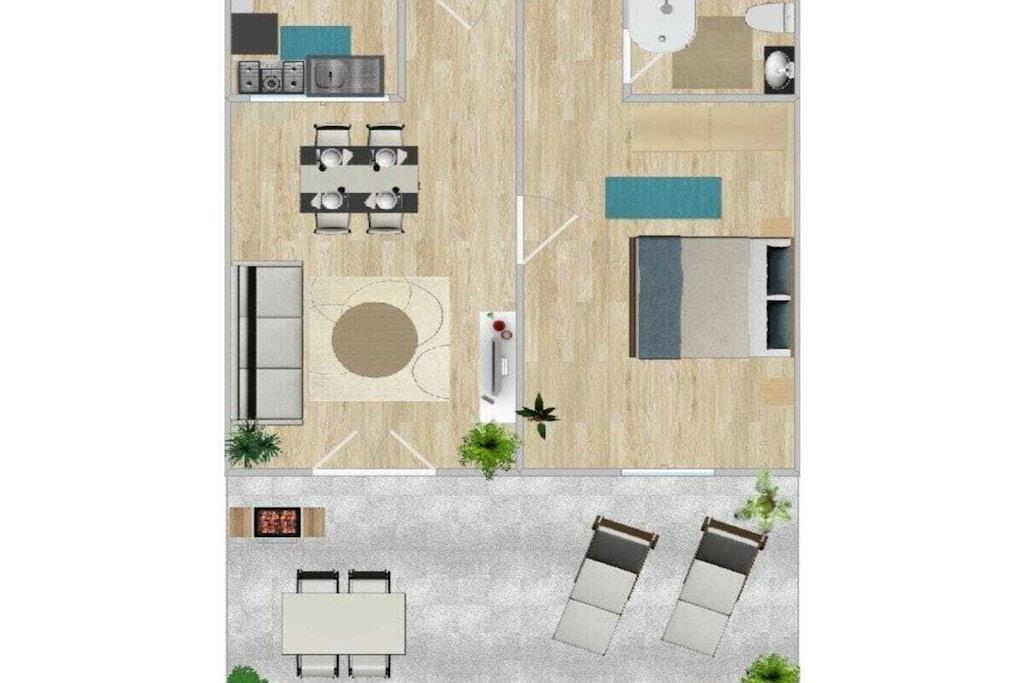 Stueetage: (Køkken(komfur, ovn, opvaskemaskine , køleskab), stue / spisestue(, Fjernsyn, Fjernsyn, spisebord), soveværelse(, , dobbeltseng), badeværelse(, toilet, bruser, håndvask)) , , , , Førstehjælp, vaskemaskine, varme, terrasse(, havemøbler, solstole), parkering, strygebræt, strygejern, tørreskab, Vaskeripakke mod et gebyr