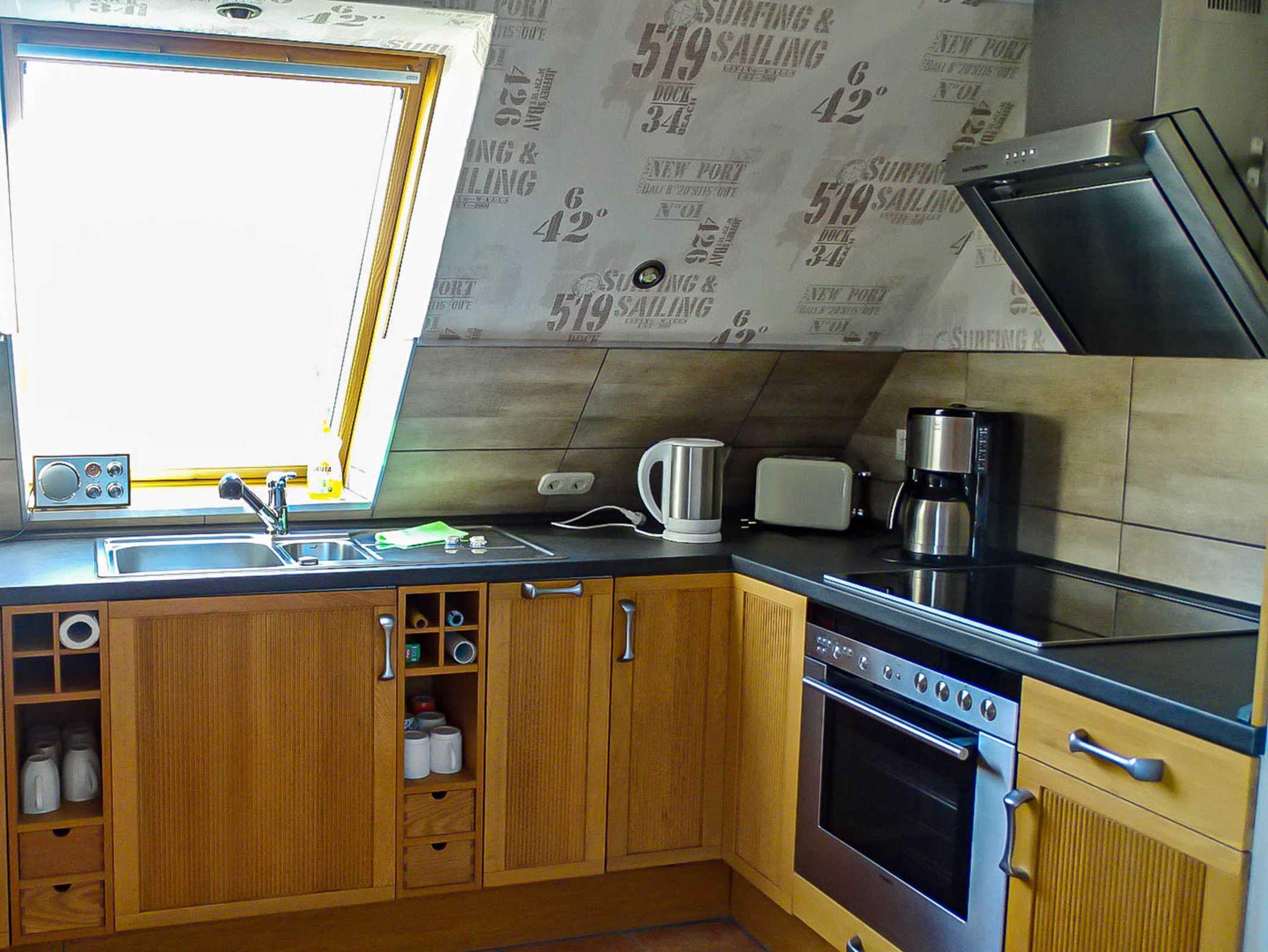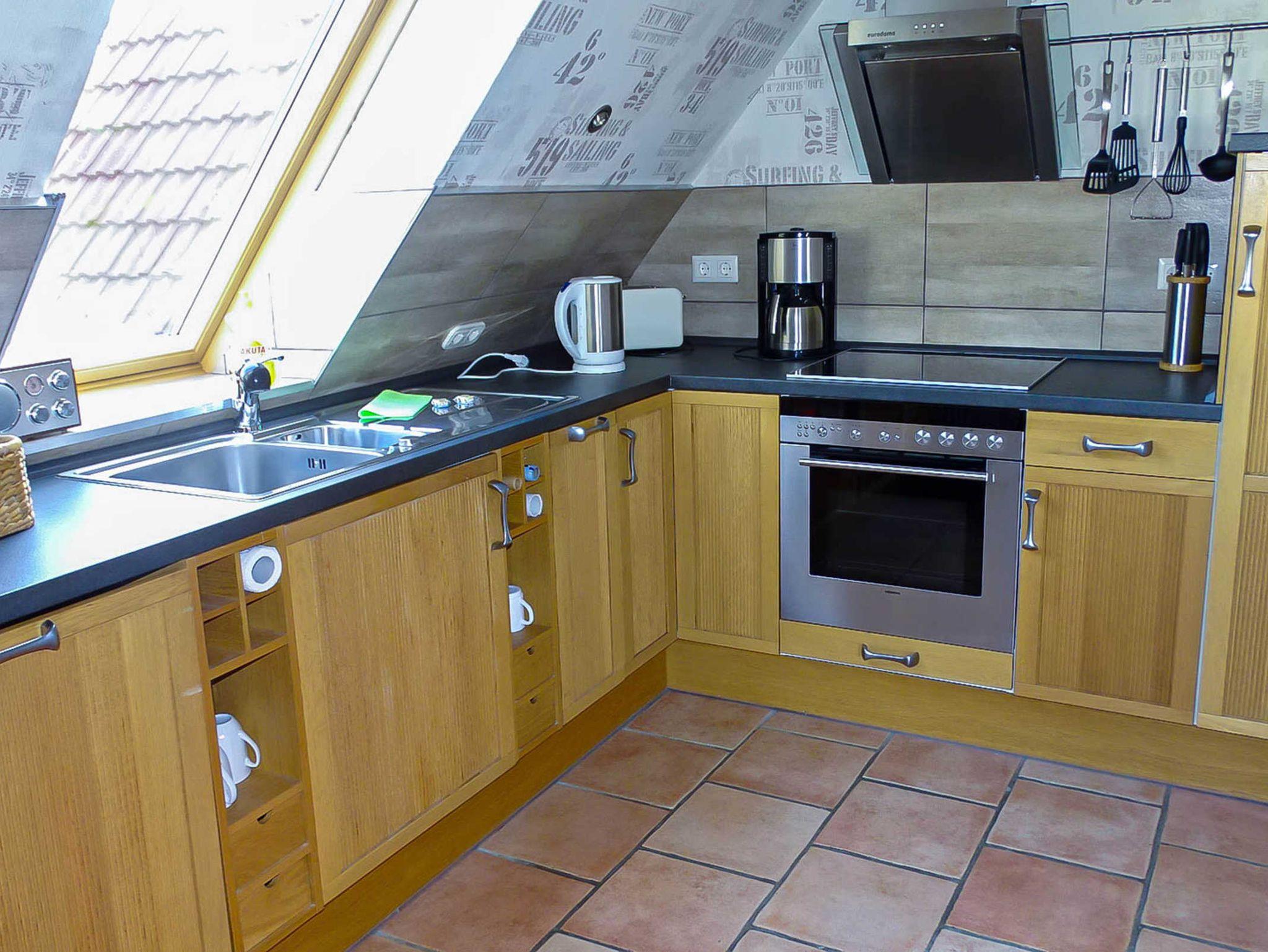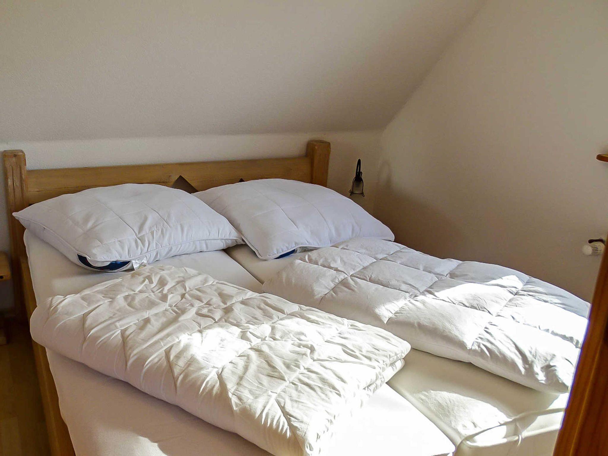 Die gemütlich eingerichtete Maisonettewohnung verfügt über 2 Schlafzimmer sowie einen kombinierten Wohn-Schlafraum mit Schlafcouch und offenen Küchenbereich. Ein Schlafzimmer verfügt über ein Doppelbett (2x80x200) und das andere fanzösische Doppelbett (140x200) befindet sich im offenen Spitzboden und ist nur durch einen Vorhang vom Wohnraum getrennt. Das Bad verfügt über Badewanne und Dusche.