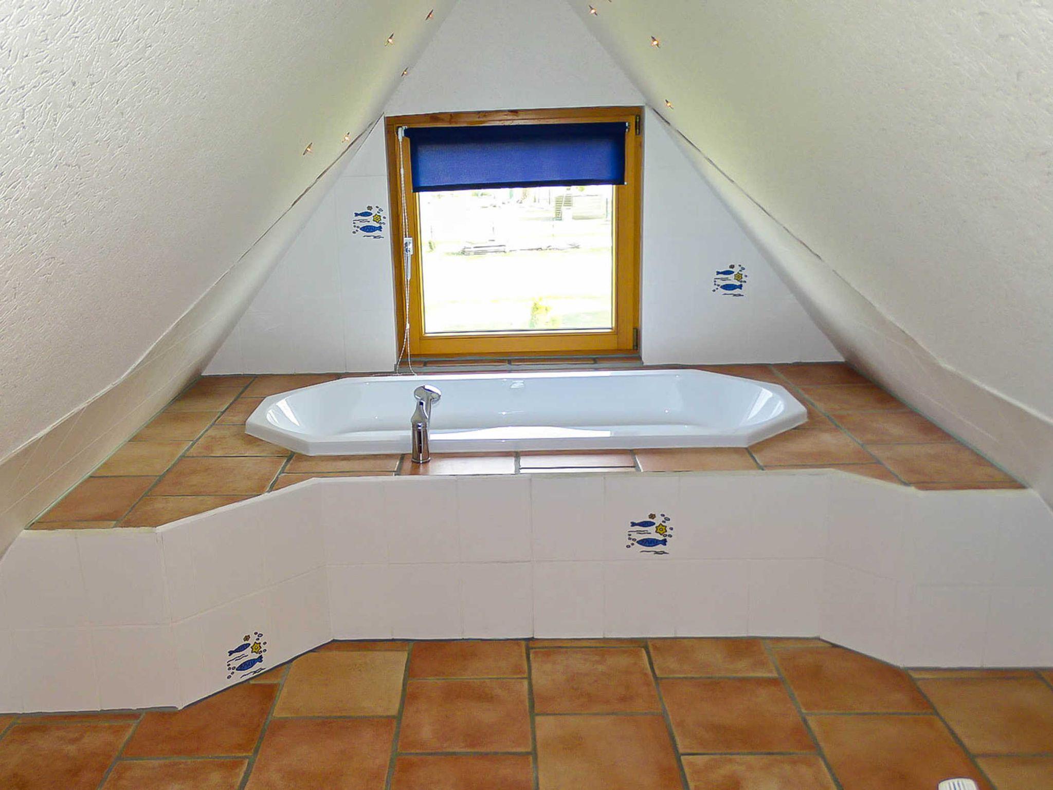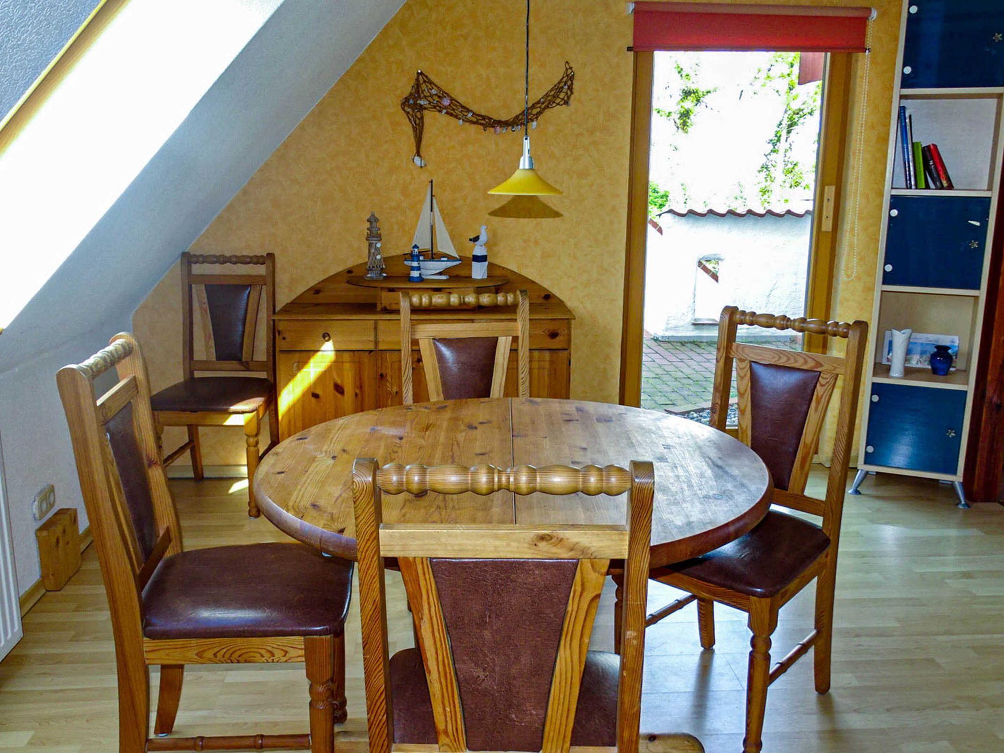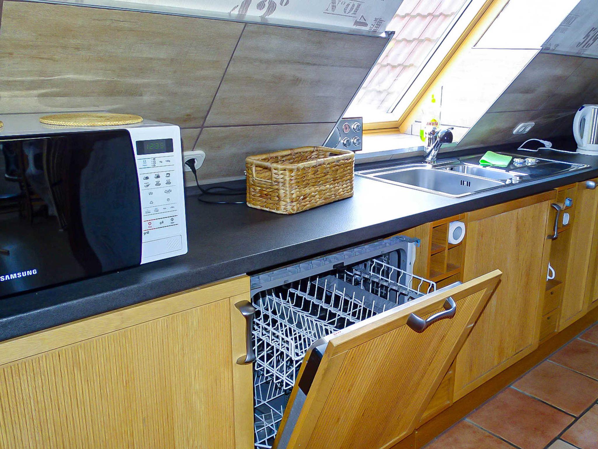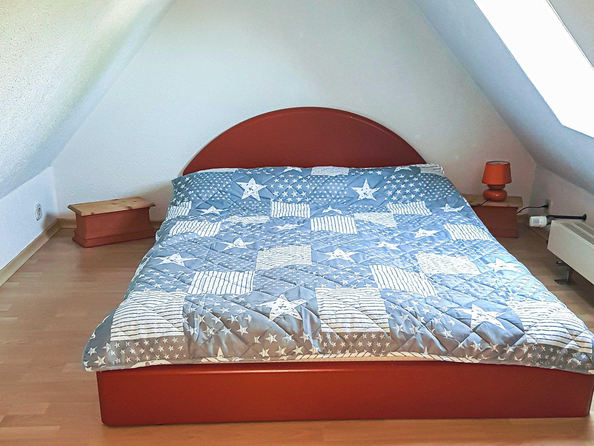 Die gemütlich eingerichtete Maisonettewohnung verfügt über 2 Schlafzimmer sowie einen kombinierten Wohn-Schlafraum mit Schlafcouch und offenen Küchenbereich. Ein Schlafzimmer verfügt über ein Doppelbett (2x80x200) und das andere fanzösische Doppelbett (140x200) befindet sich im offenen Spitzboden und ist nur durch einen Vorhang vom Wohnraum getrennt. Das Bad verfügt über Badewanne und Dusche.