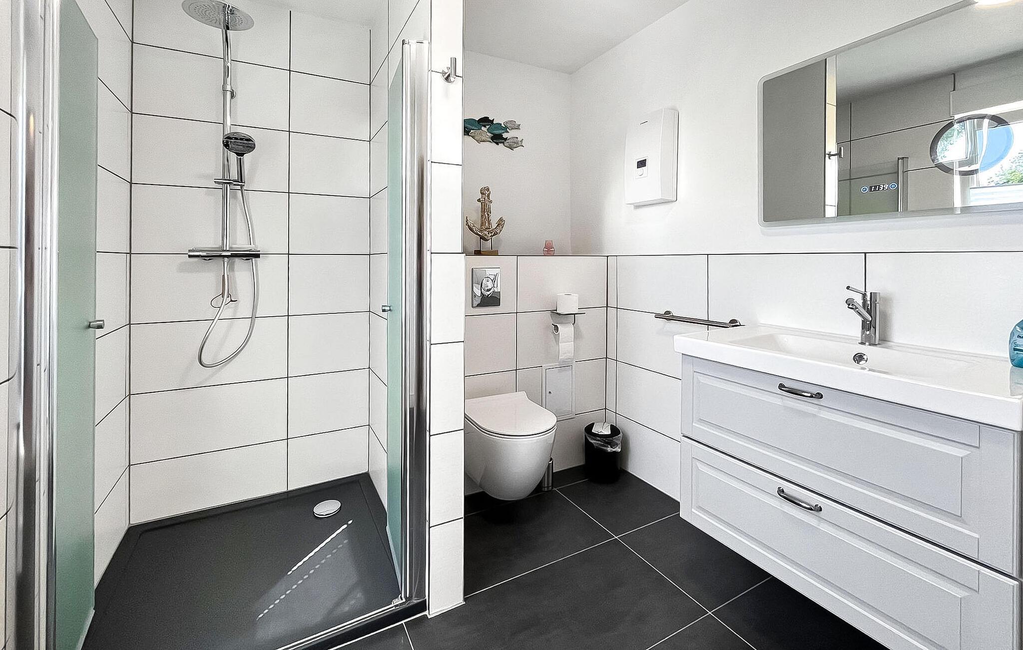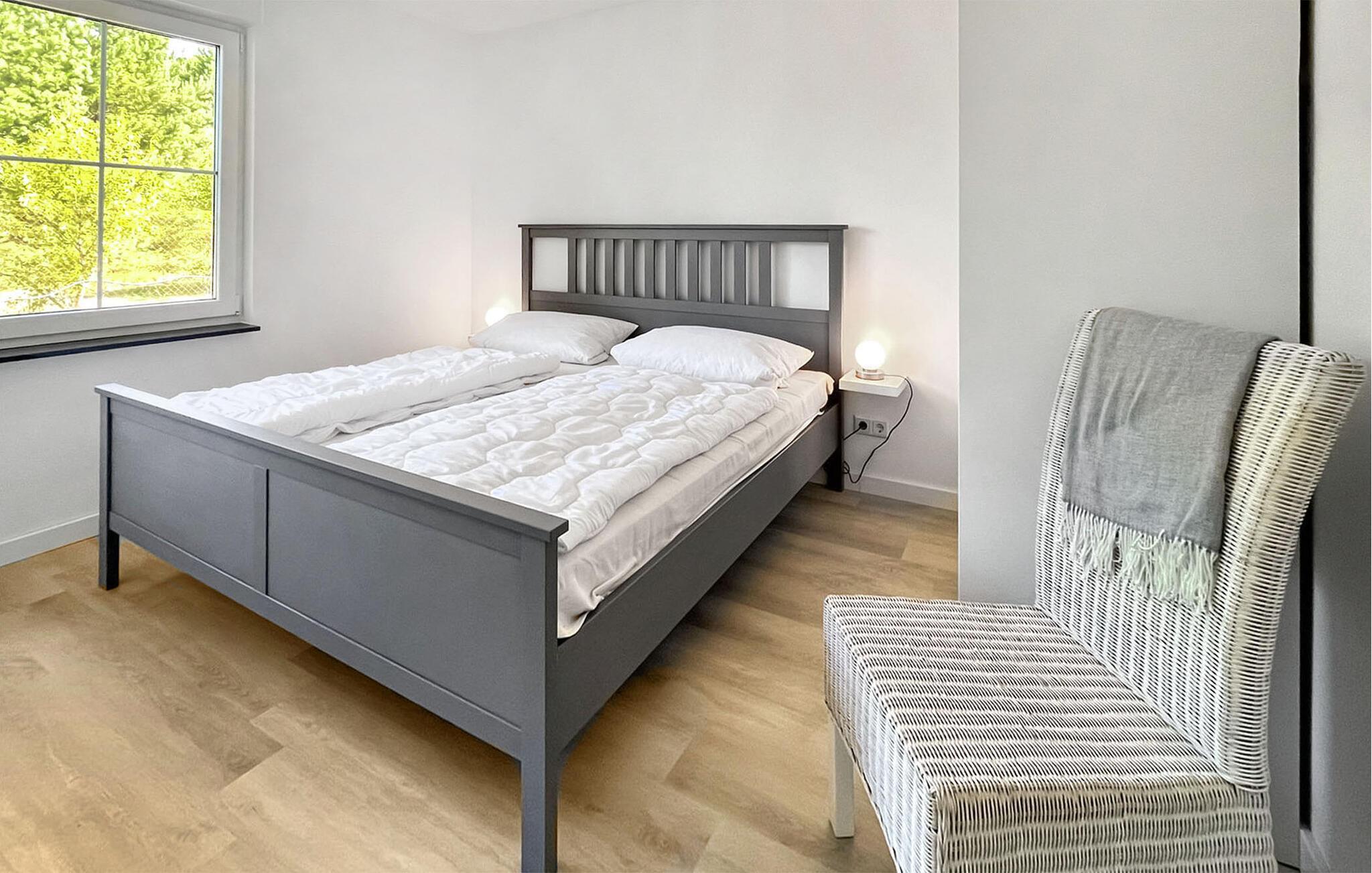 Sommerhuset, som er totalrenoveret og nyindrettet i 2022, ligger på en separat og helt indhegnet fritidsejendom på ca 500 kvadratmeter med en rolig beliggenhed i udkanten af landsbyen og i udkanten af skoven. Bodstedter Bodden med strand og havn ligger ca. 500 m væk. Der er cirka 10 km til Østersøstranden i Zingst. Feriehuset med åben grundplan er udstyret til en høj standard med opholdsstue (polstrede møbler, internetaktiveret fladskærms-tv, radio), tekøkken (elektrisk komfur med ovn, køleskab med fryser, opvaskemaskine, mikroovn, diverse køkkenmaskiner, spisebord), 1. soveværelse (1 x dobbeltseng, TV), 2. soveværelse (2 enkeltsenge) samt badeværelse med brus/toilet, hårtørrer, vask. maskine og tørretumbler. Boligen kan opvarmes med el-varme Der er terrasse med siddepladser, 2 liggestole, grill, cykelrum (redskabsskur) og parkeringsplads til fri afbenyttelse. En høj stol og en rejseseng er til rådighed for små børn. WiFi er også tilgængeligt.