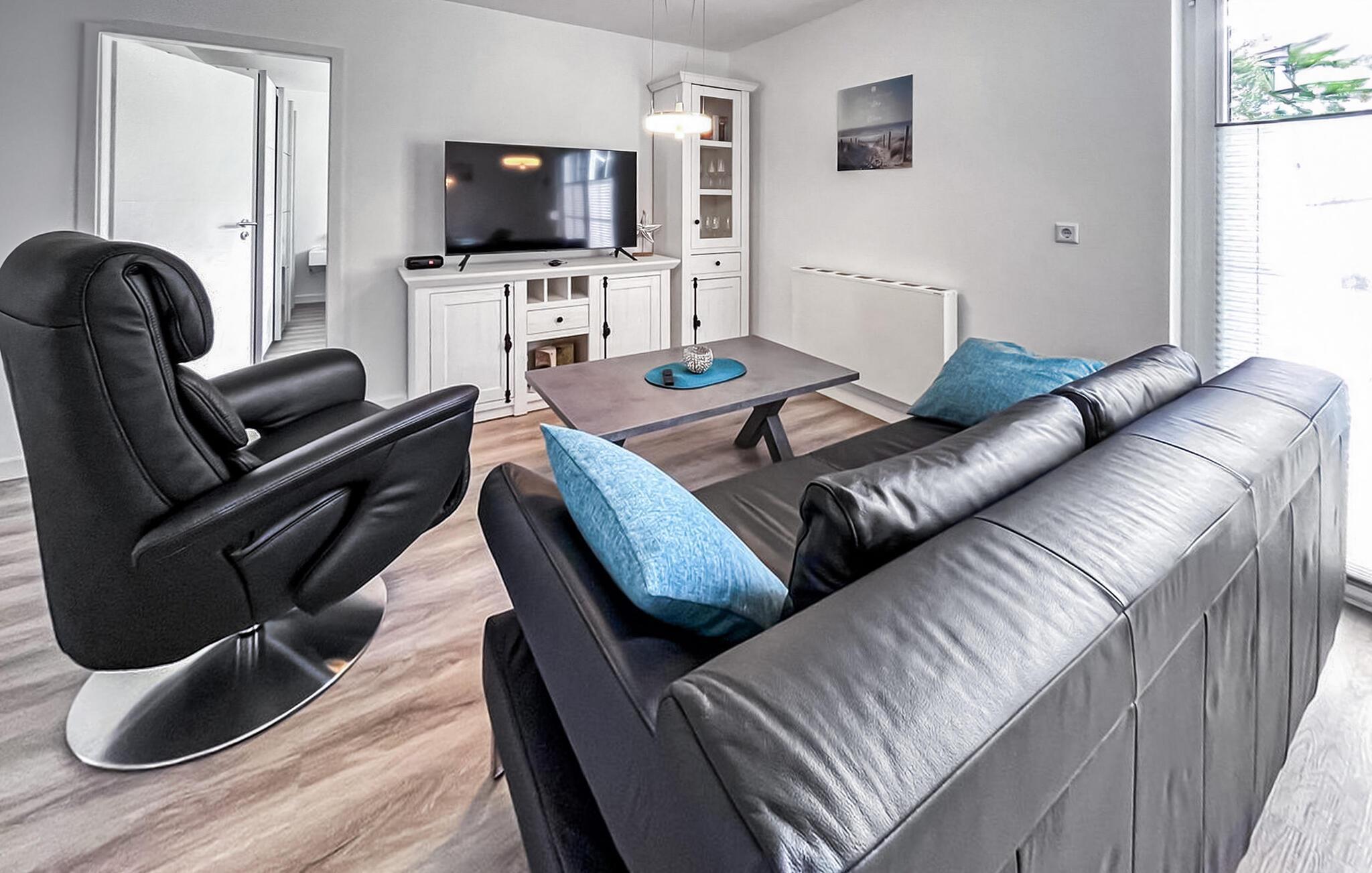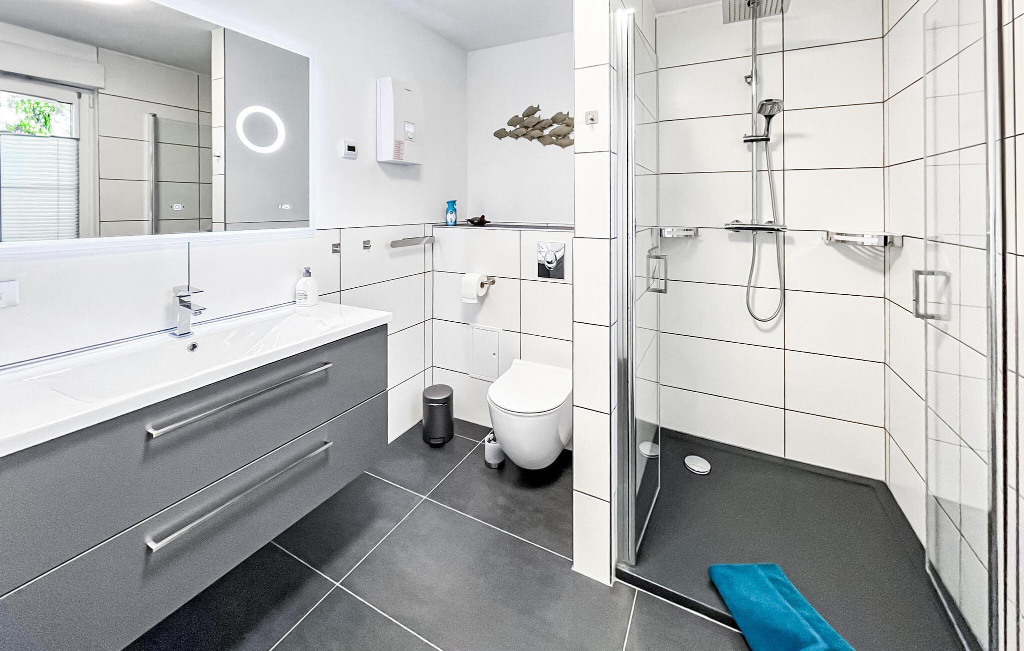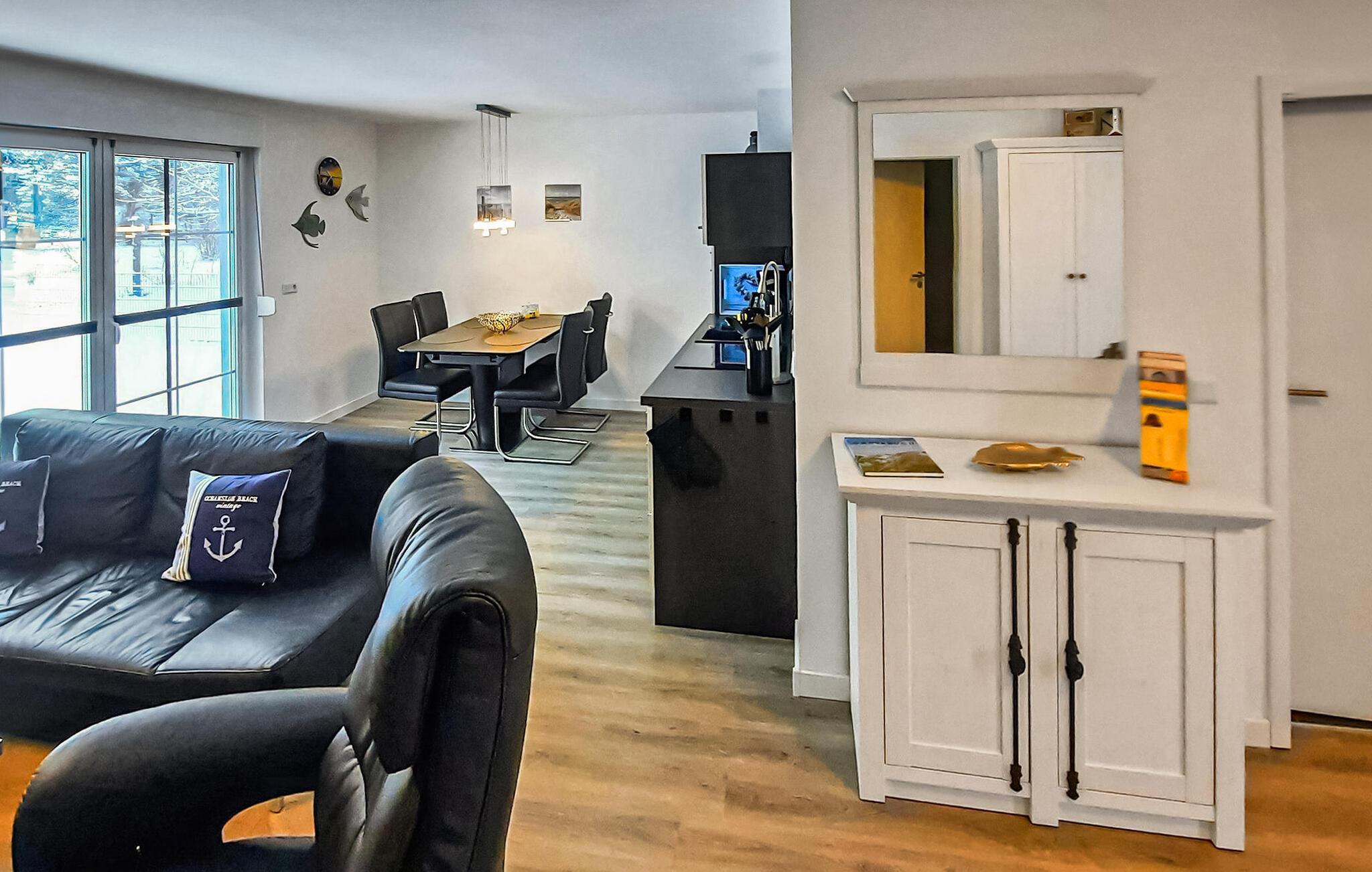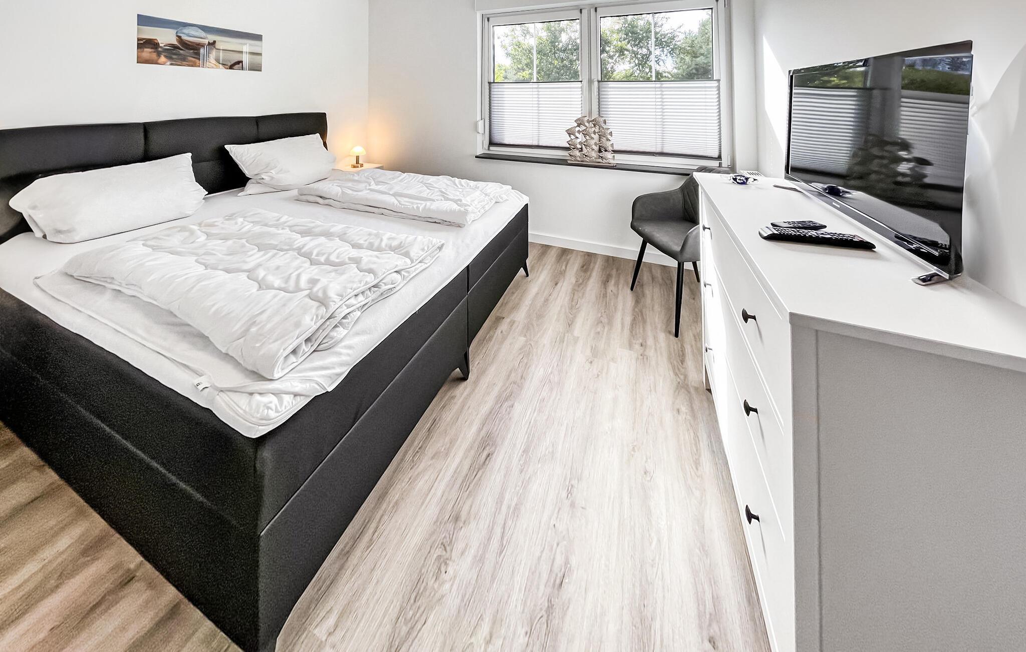 Sommerhuset, der er totalrenoveret og nyindrettet i 2022, ligger på en separat og helt indhegnet rekreativ ejendom på ca 250 kvadratmeter med en rolig beliggenhed i udkanten af landsbyen og i udkanten af skoven. Bodstedter Bodden med strand og havn ligger ca. 500 m væk. Der er cirka 10 km til Østersøstranden i Zingst. Feriehuset med åben grundplan er udstyret til høj standard med opholdsstue (polstrede møbler, internetaktiveret fladskærms-tv, Bluetooth-højttaler med radio), tekøkken (elkomfur med ovn, køleskab med fryser, opvaskemaskine, mikroovn, diverse køkkenmaskiner, spisebord), 1. soveværelse (1 x dobbeltseng, TV), 2. soveværelse (2 enkeltsenge) og et badeværelse med brus/toilet, hårtørrer, vaskemaskine. Boligen kan opvarmes med el-varme Der er terrasse med siddepladser, 4 liggestole, grill, cykel/rum og parkeringsplads til fri afbenyttelse. En høj stol og en rejseseng er til rådighed for små børn. WiFi er også tilgængeligt. Den samlede pris inkluderer vand- og energiforbrug samt slutrengøring. Sengelinned og håndklæder kan medbringes eller lejes på stedet. Der må højst være 2 hunde (ingen katte!) med en skulderhøjde på maks. 40 cm i denne ejendom. Ansvarsforsikring for kæledyr er påkrævet. Fuhlendorf er et statsanerkendt feriested. Det betyder, at du er forpligtet til at betale en spaskat (på stedet). Fuhlendorf ligger syd for halvøen Fischland-Darß-Zingst på Bodstedter Bodden. Der er cirka 10 km til feriestedet Zingst ved Østersøen og den lille by Barth. Der er to restauranter, shopping (minibutik), cykel- og bådudlejning og en tennisbane i landsbyen. Der er også en lille havn og en smuk naturstrand. Zeesboat-ture er mulige på Bodden, der er en surfskole og flere ridestalde i området. Regionen er et af de største rastepladser for trækfugle i Europa og byder på imponerende naturskuespil hvert forår og efterår. Det meget veludviklede netværk af cykelstier gør det nemt at udforske området på cykel.