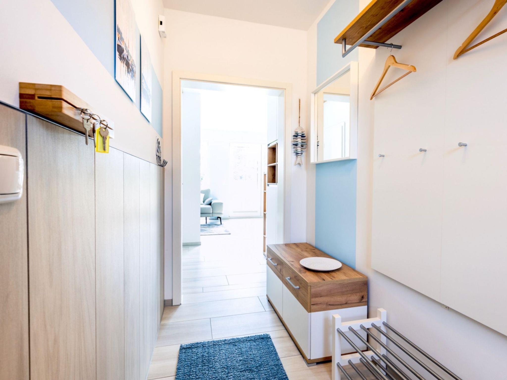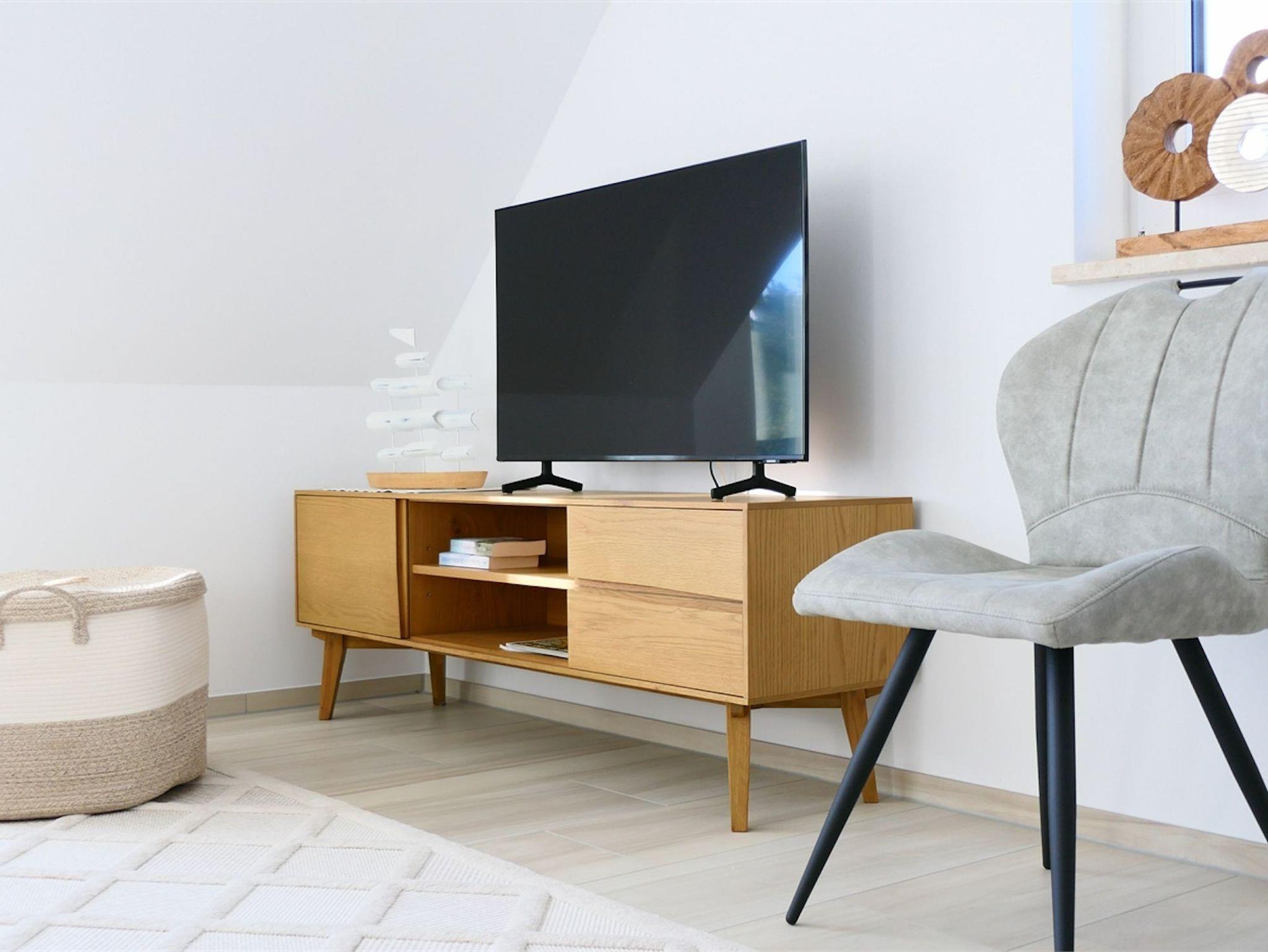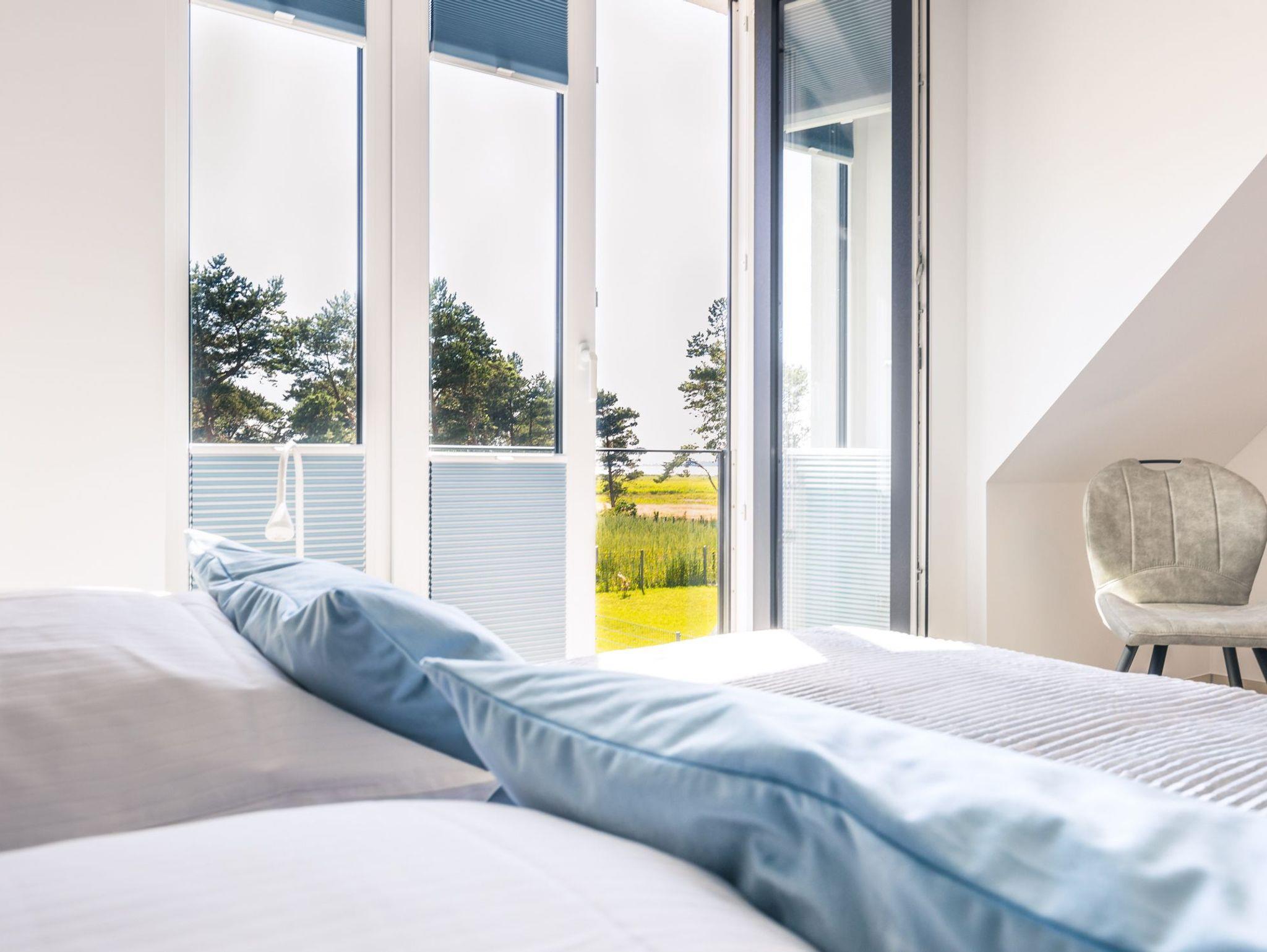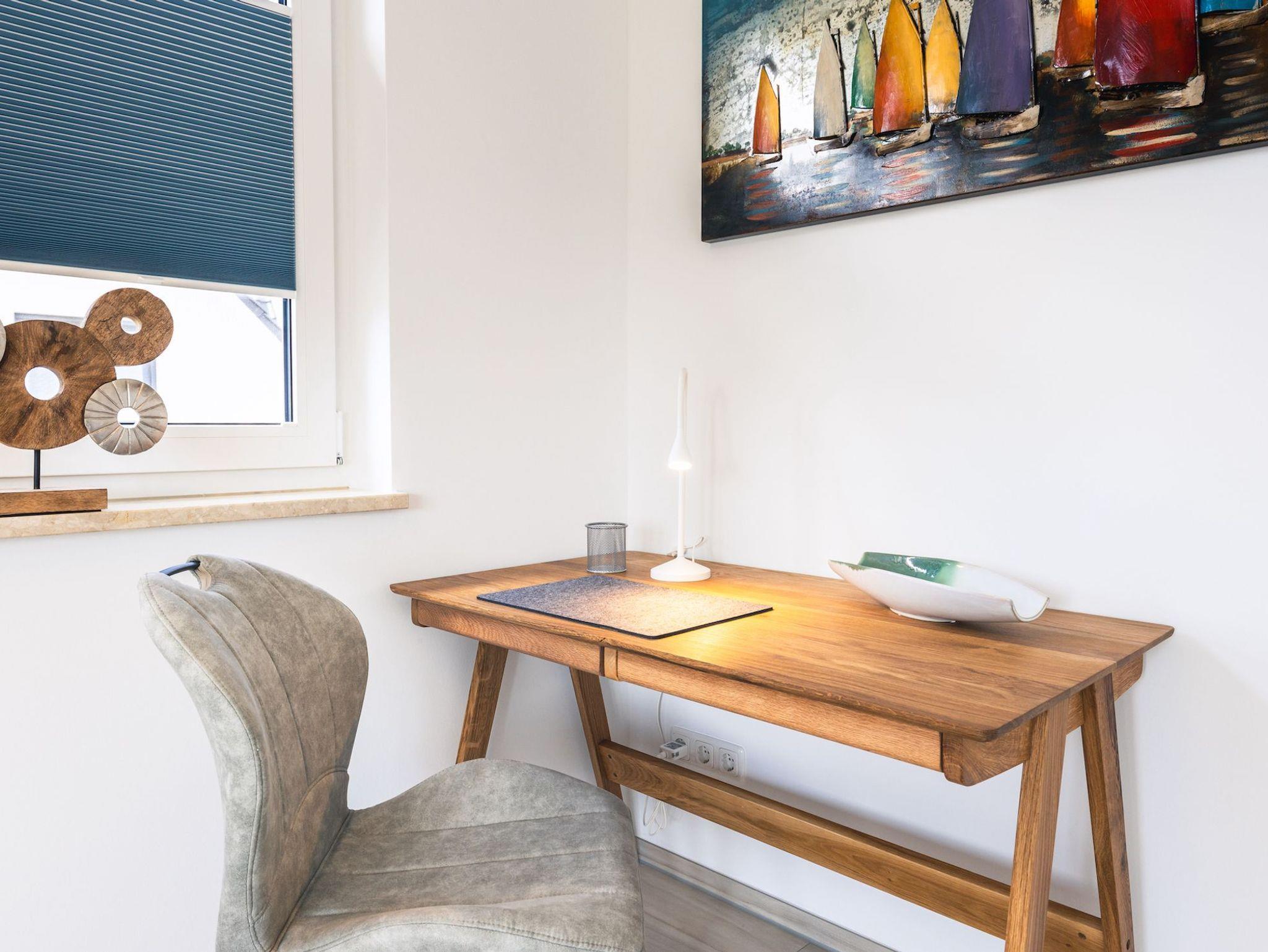 Das Obergeschoss des Hauses verfügt über zwei Schlafzimmer. In dem einen befindet sich ein bequemes, hochwertiges Boxspringbett mit angrenzendem begehbaren Kleiderschrank sowie ein Schreibtisch und Smart-TV. Im zweiten sind zwei Einzelbetten mit Einbauschrank und ebenfalls Smart-TV vorhanden. Das großzügige Badezimmer mit Fenster und ebenerdiger Dusche in moderner Beton-Optik runden den hohen Standard der Unterkunft ab.
