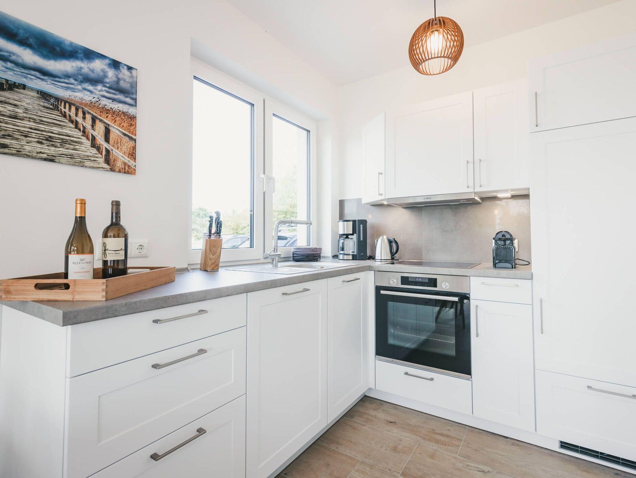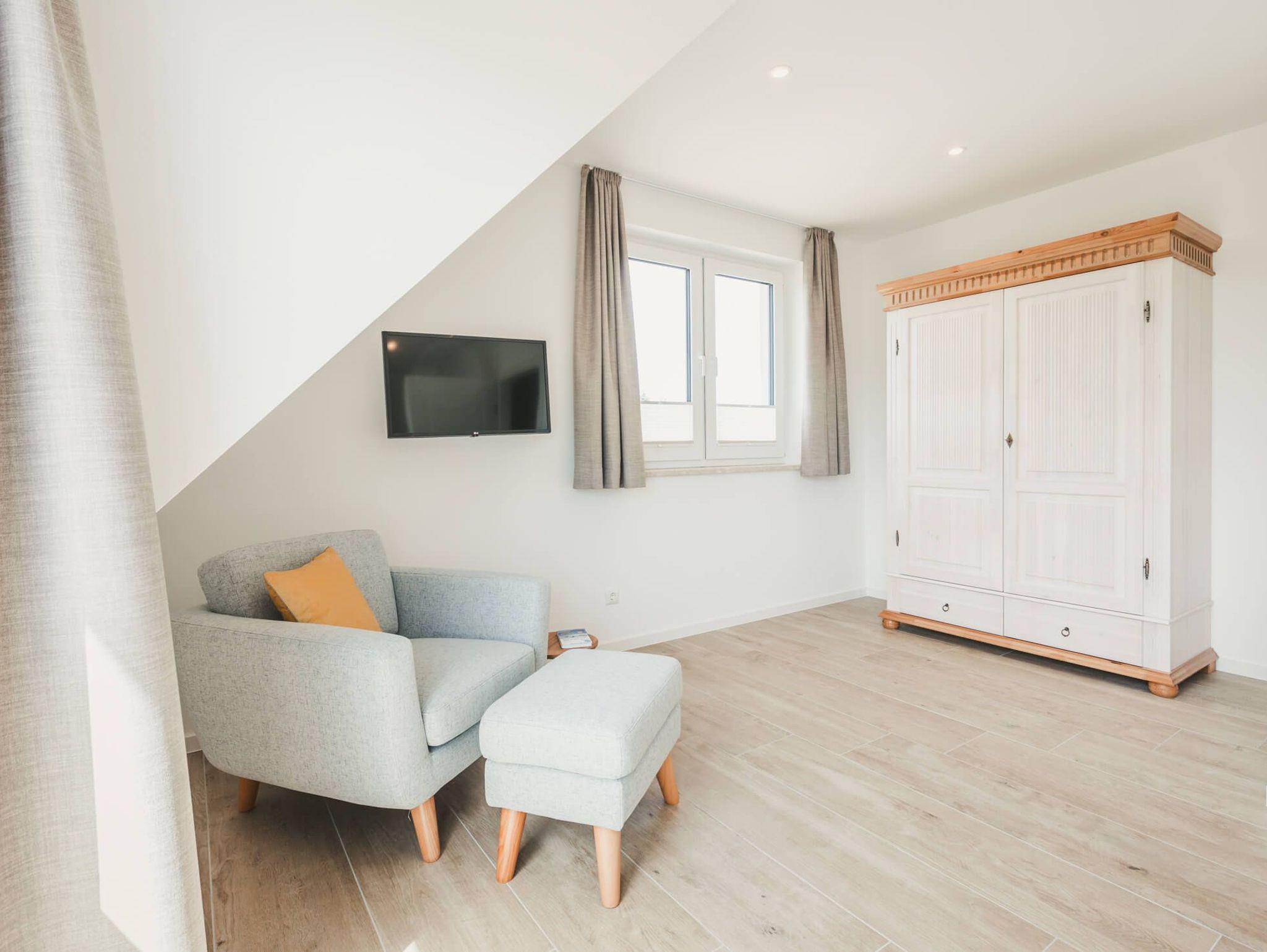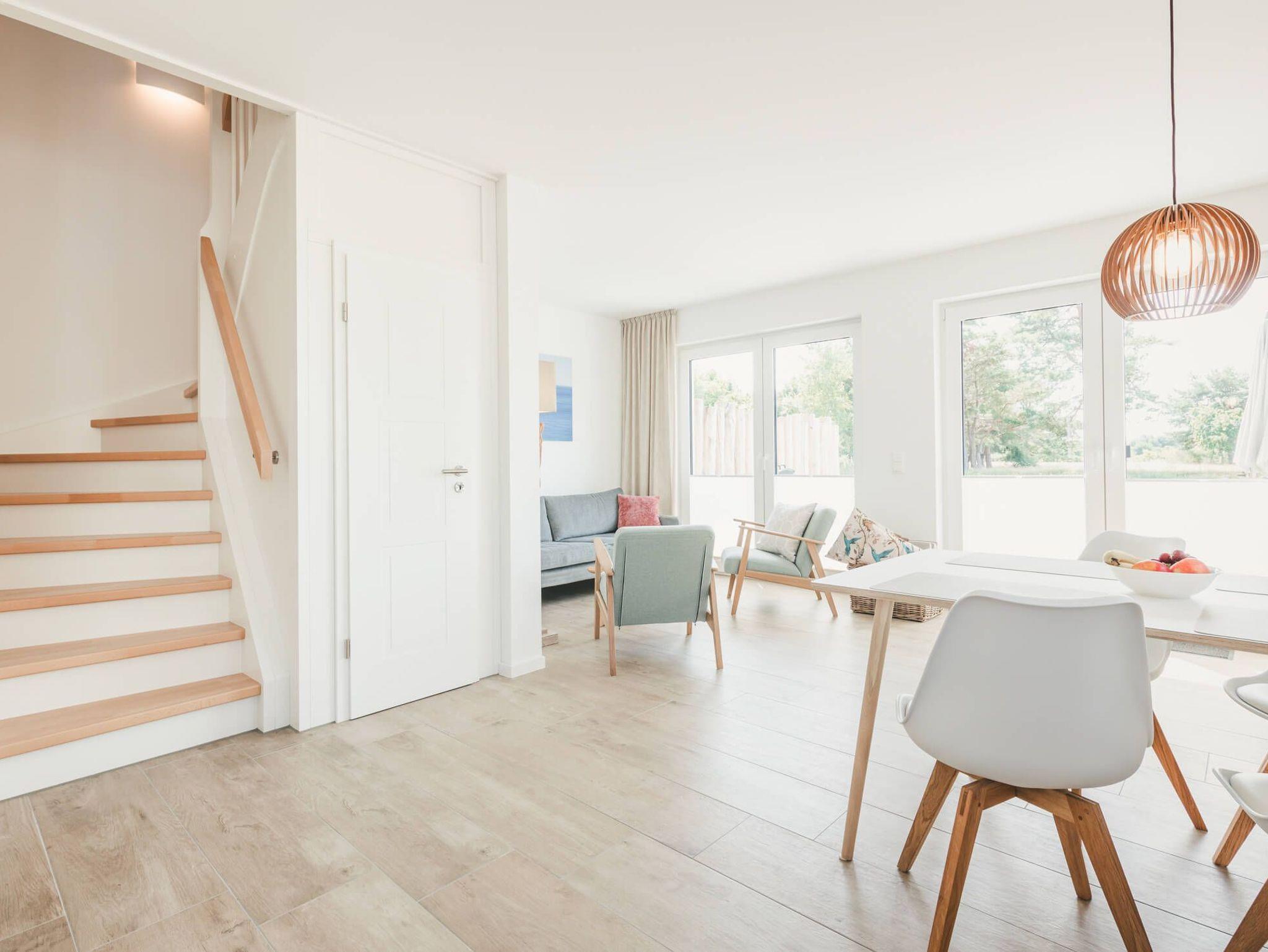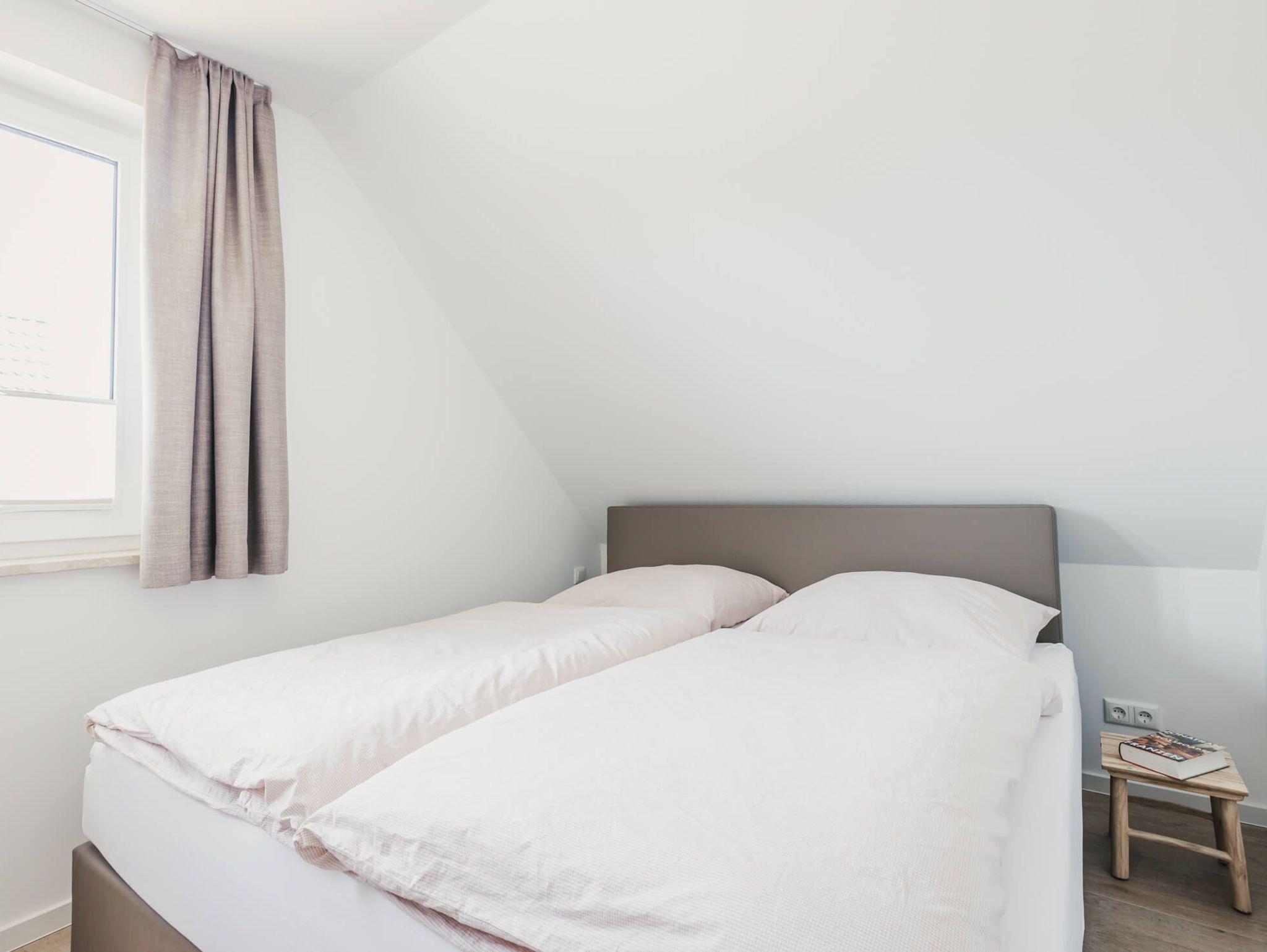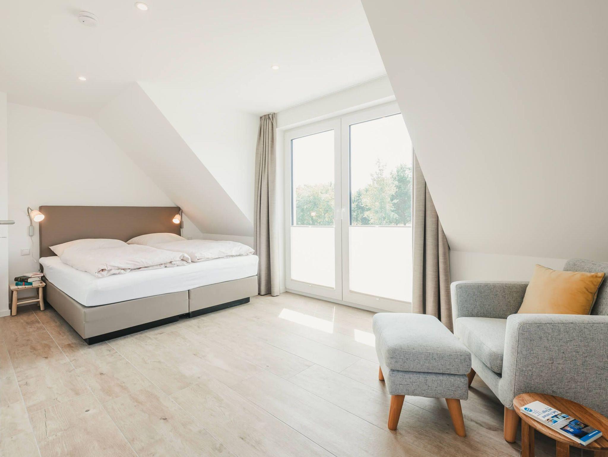 Im Obergeschoß befinden sich zwei Schlafzimmer mit jeweils einem großen, 1,80 Meter breiten, Boxspringbett und einem Kleiderschrank. Aus beiden Zimmern haben Sie einen traumhaften Blick auf die umgebende Natur und den Bodden. Das größere Zimmer verfügt über bodentiefe Fenster, ein Smart TV und einen gemütlichen Sessel.