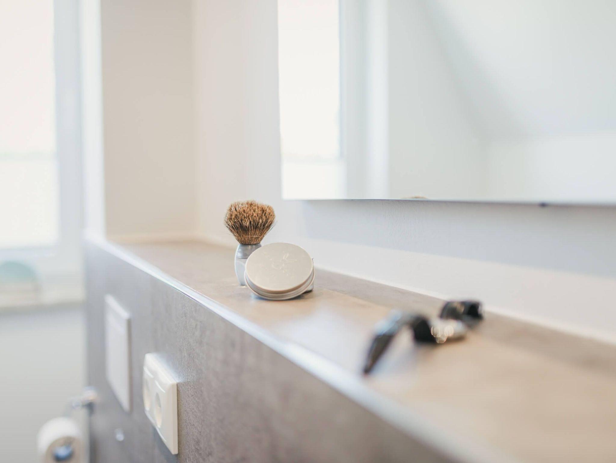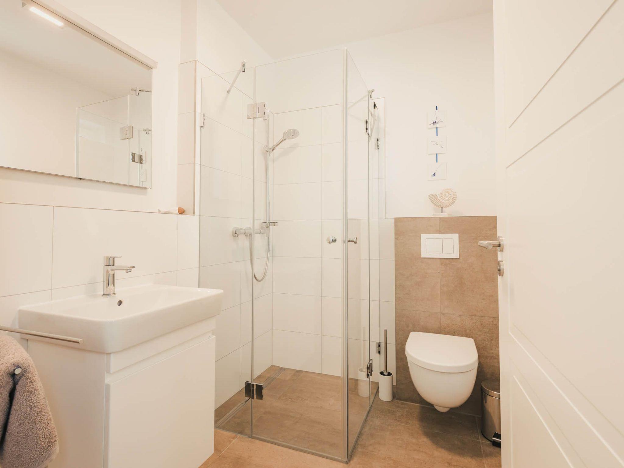 Das Badezimmer im Erdgeschoß hat eine ebenerdige Dusche und ein großes Waschbecken. Die warmen Sandtöne spiegeln das maritime Umfeld wider.