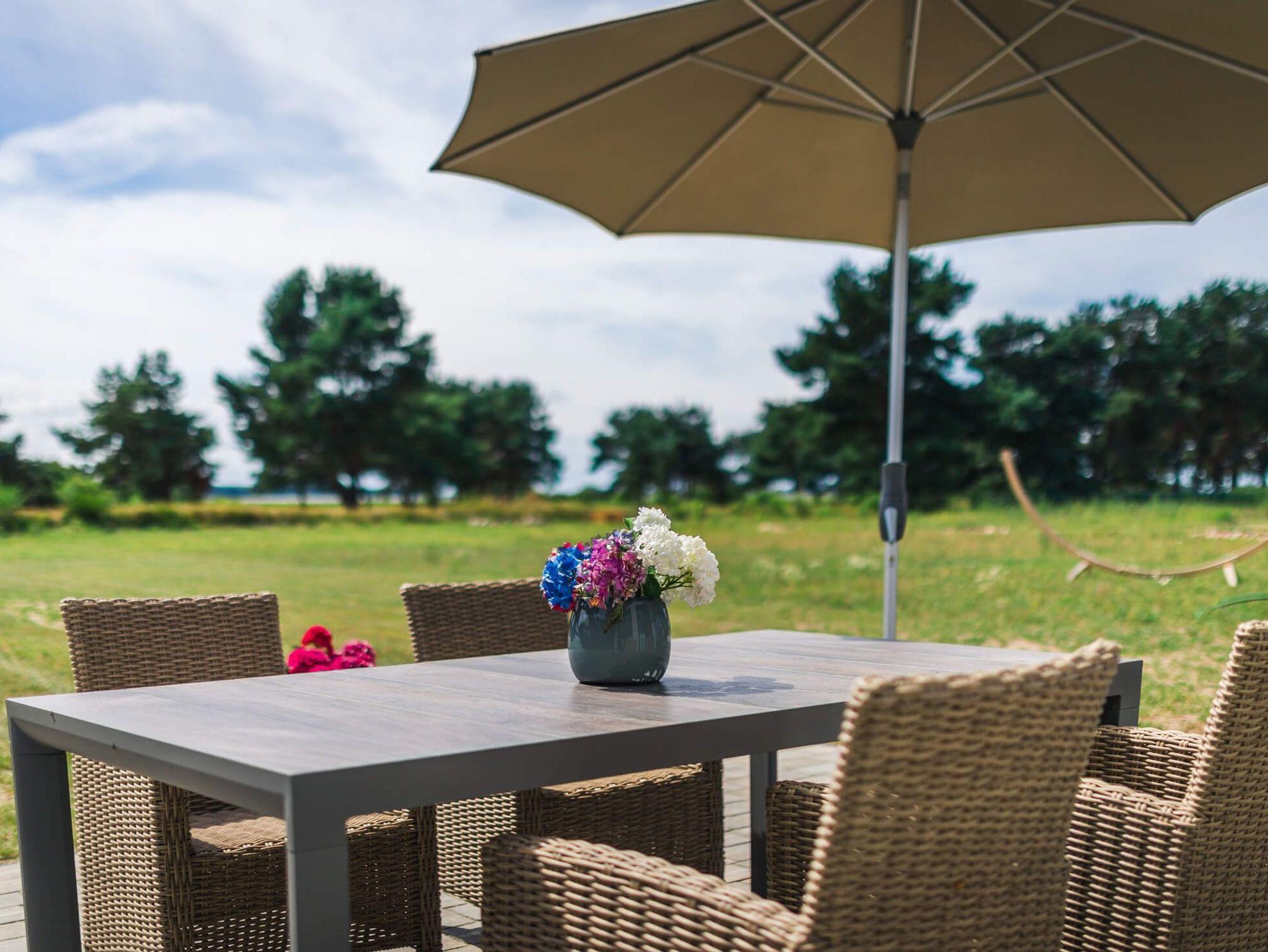 Die Terrasse bietet Ihnen von morgens bis abends Sonne. Die hochwertigen Gartenmöbel und der Sonnenschirm geben Ihnen die Möglichkeit, das Leben draußen zu genießen.