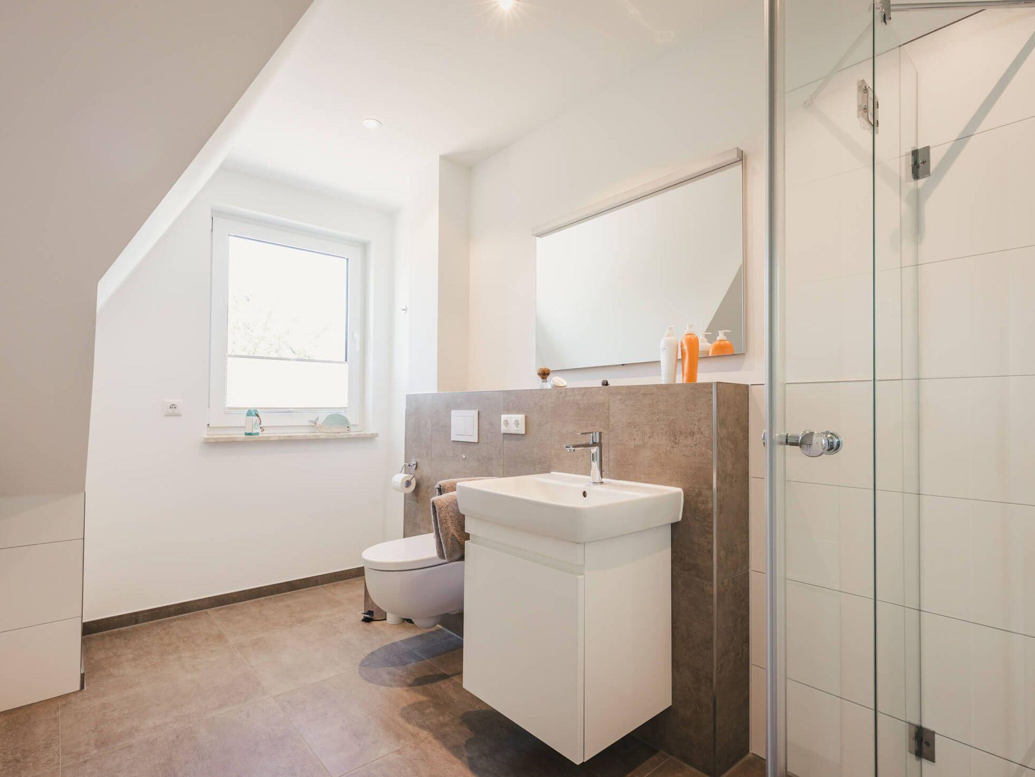 Das Badezimmer im Obergeschoß bietet neben einer ebenerdigen Dusche zusätzlich eine große Badewanne. Hier entspannen Sie nach langen Spaziergängen in der Natur.
