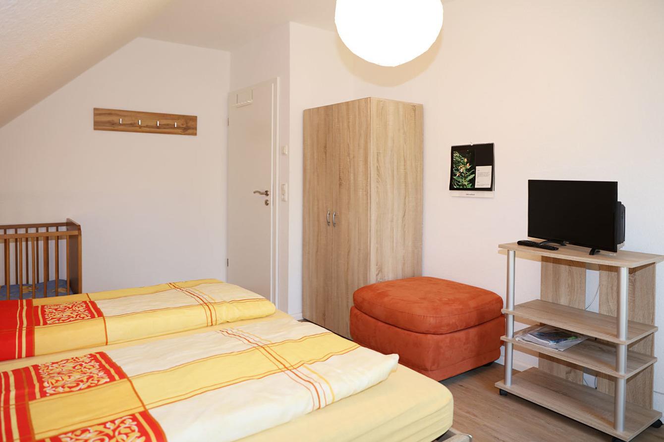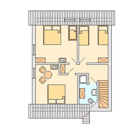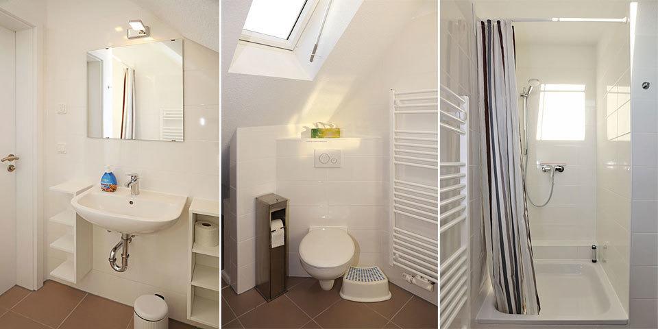 Oben gibt es drei weitere Schlafräume, ein Bad mit Dusche und einen Hometrainer.