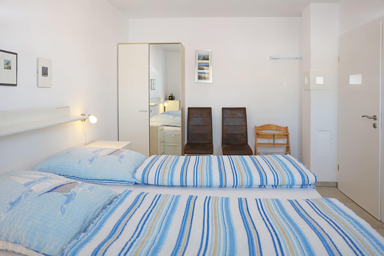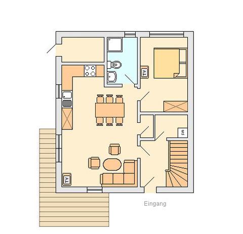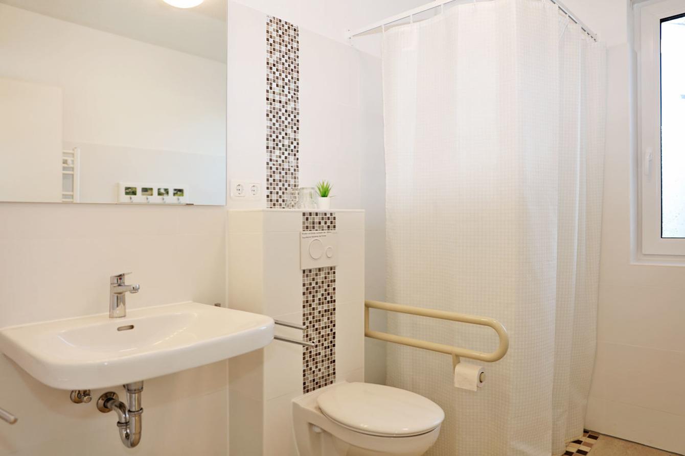 Mittelpunkt der Ferienhauses ist der 35 m² große Wohnbereich mit offener Küche und gemütlichem Essplatz. Außerdem befinden sich auf der unteren Ebene ein Schlafzimmer (1 Doppelbett , 180 x 200) und ein Duschbad. Auch Gäste, die gehbehindert oder auf einen Rollstuhl angewiesen sind, können hier gut zurecht kommen: unterfahrbares Waschbecken, erhöhtes WC, bodengleiche Dusche, ausreichende Abstände und erhöhte Betten.