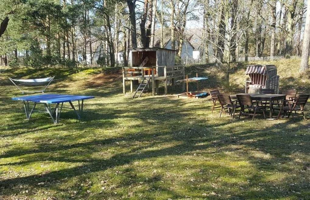 Ein Spielplatz mit einer Joop-Outdoor-Tischtennisplatte, Sitzmöglichkeiten, einem Spielhaus, einer Tellerschaukel und einer Hängematte laden zum Verbleiben auf dem großen Grundstück ein.