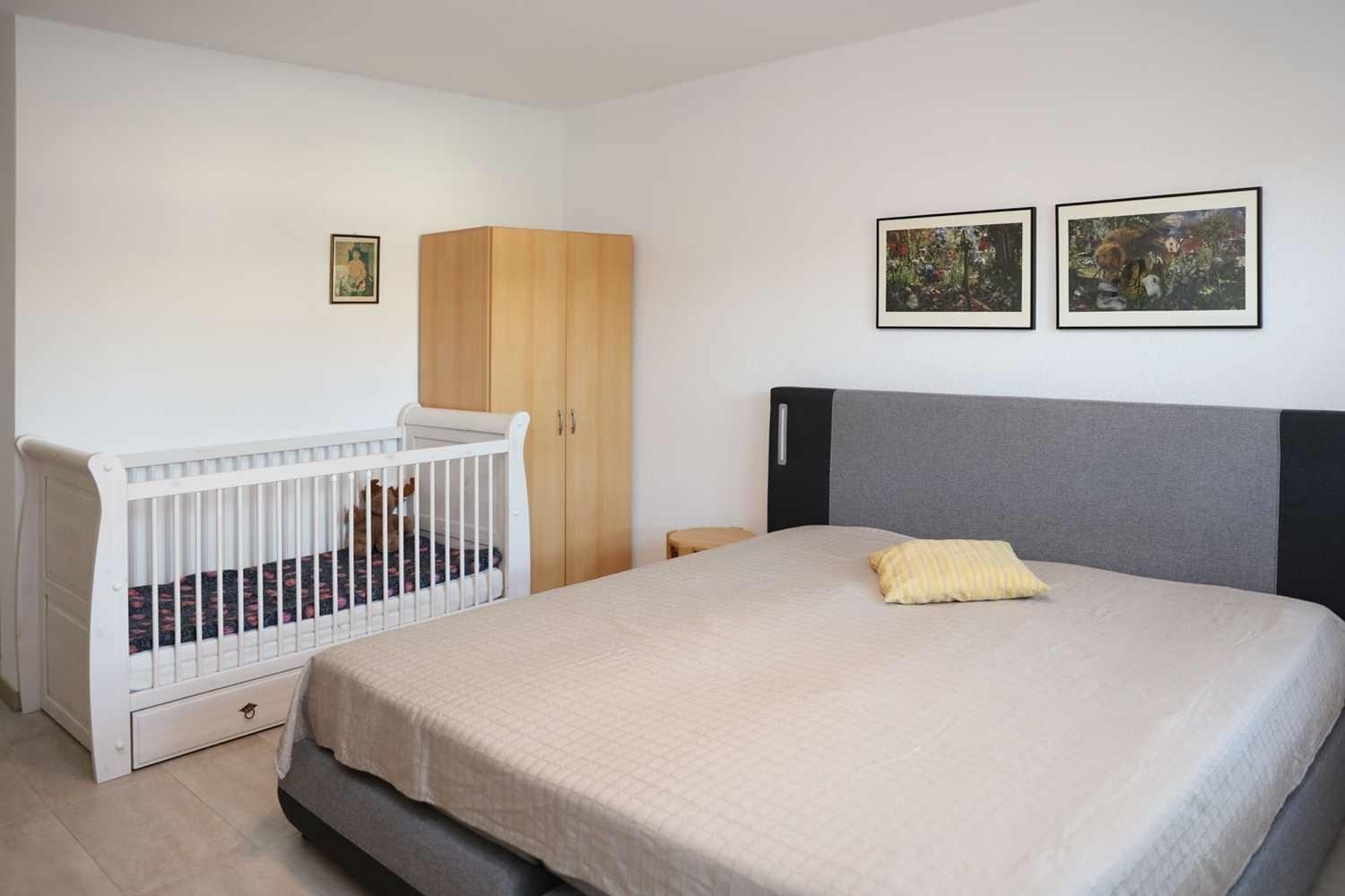 Bei 8 Erwachsenen kommt zu den zuvor genannten Räumen noch ein großes Schlafzimmer mit Boxspringbett und Kinderbett sowie einem eigenen Duschbad hinzu.