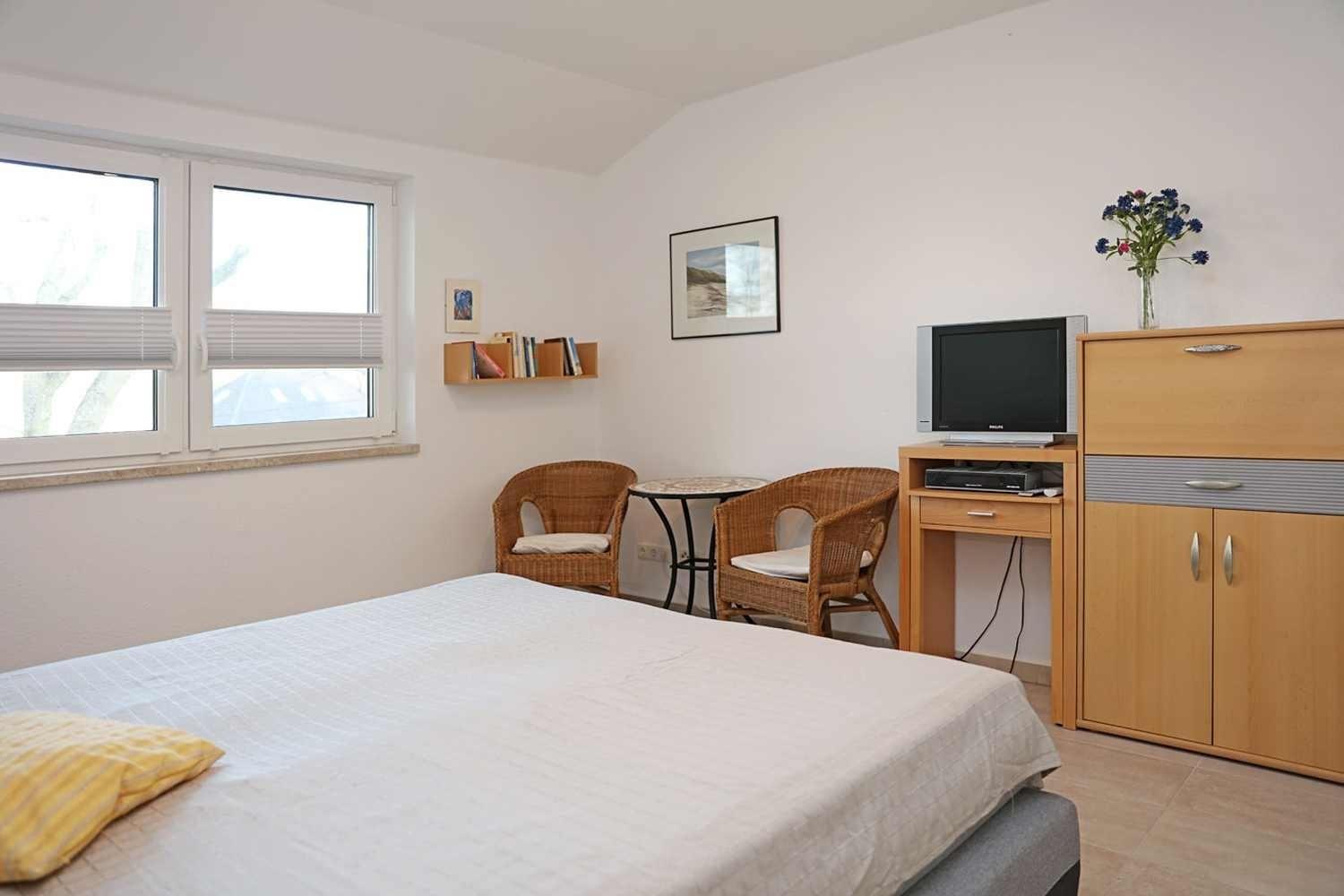 Bei 6 Personen haben Sie die Parterrewohnung und im Obergeschoss einen Schlafraum mit zwei einzeln stehende Betten und das große Wohn-Schlafzimmer mit einer 1,40 m breiten Schlafcouch sowie ein Bad mit Badewanne und Dusche.