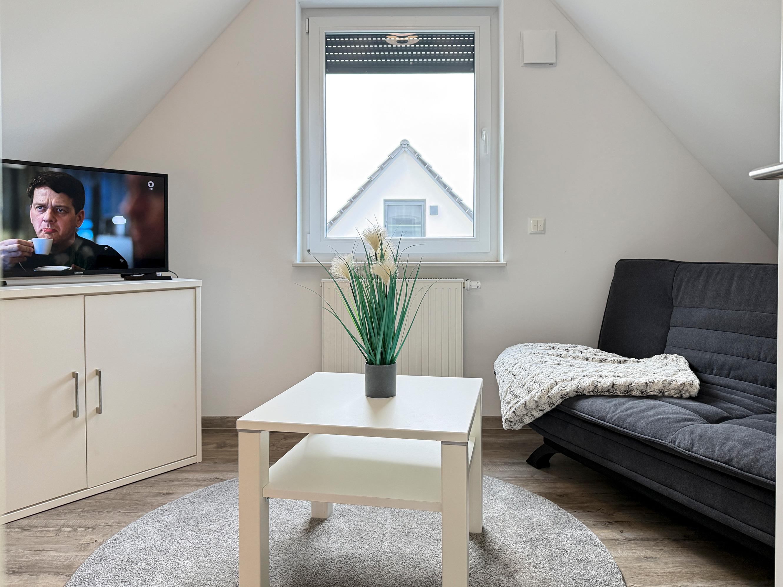 Wohnbereich: Heller, offener Raum mit gemütlicher, wandelbarer Couch, HD-TV und viel Tageslicht durch bodentiefe Fenster