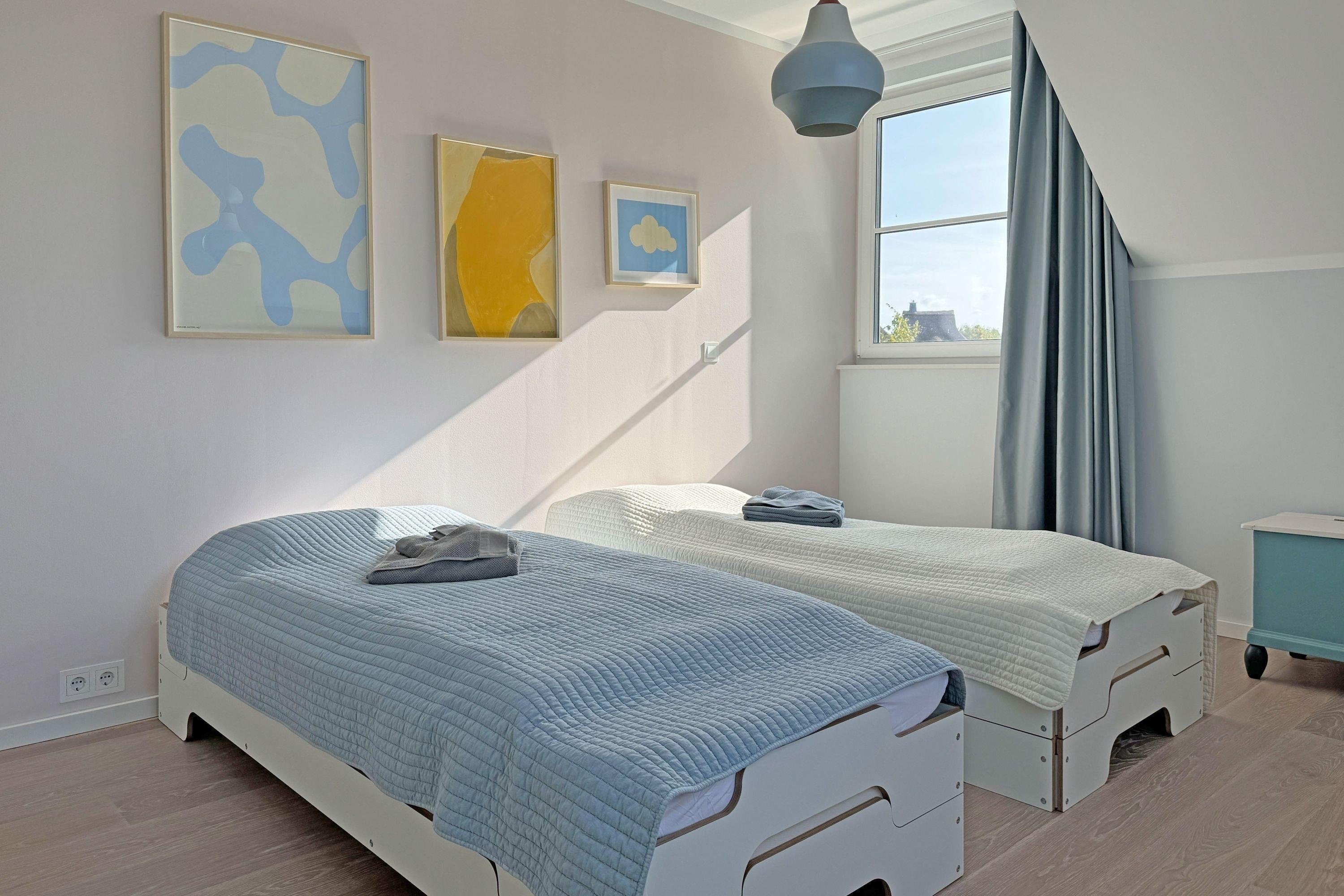 Schlafzimmer 2: Zwei Einzelbetten (90 x 200 cm) mit Verdunklungsmöglichkeiten und Fliegengittern