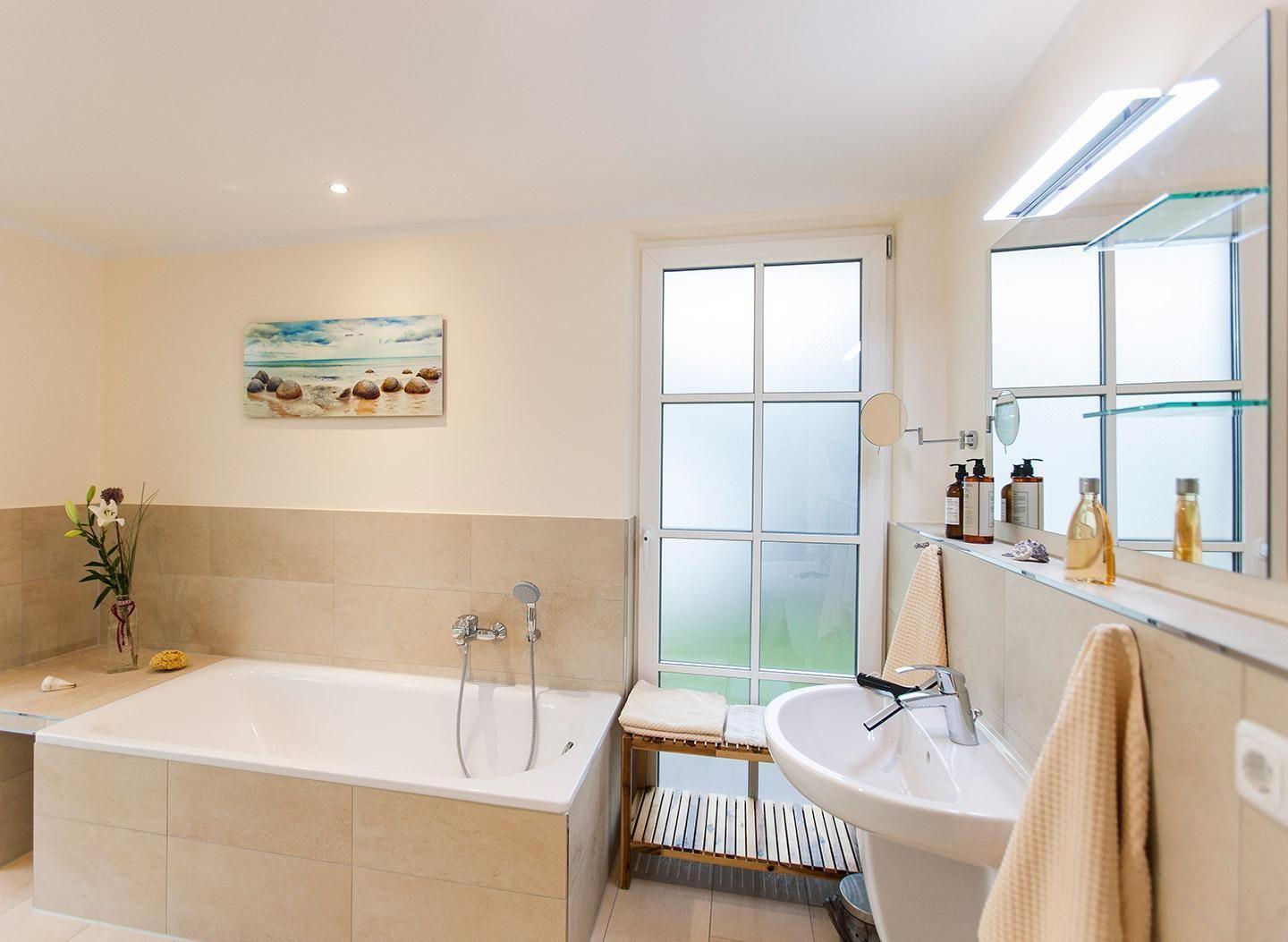 Dieses wunderschöne Ferienhaus mit traditionellem Reetdach, Fensterläden, ortstypischer Feldsteineinfriedung und 900 m2 großem Grundstück liegt in einer neuen Ferienhausanlage. Es bietet großzügig Platz für sechs Feriengäste (drei Schlafzimmer mit Doppelbett, davon eins im EG) und verfügt über zwei hochwertige Bäder und ein Gäste-WC, davon ein Bad mit Badewanne und Dusche, ein Bad mit Dusche und Sauna.