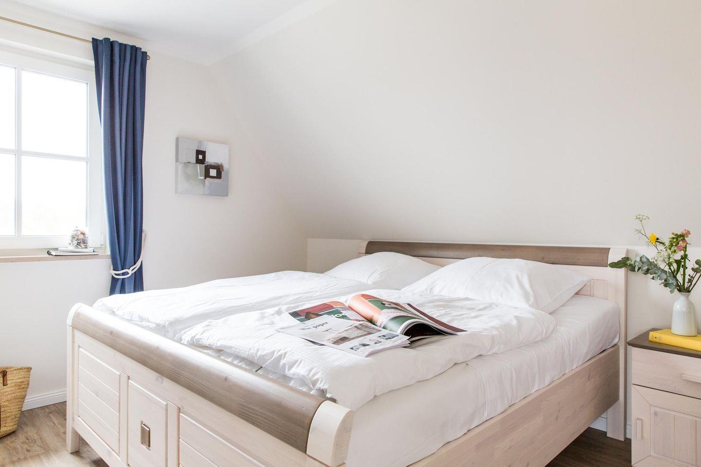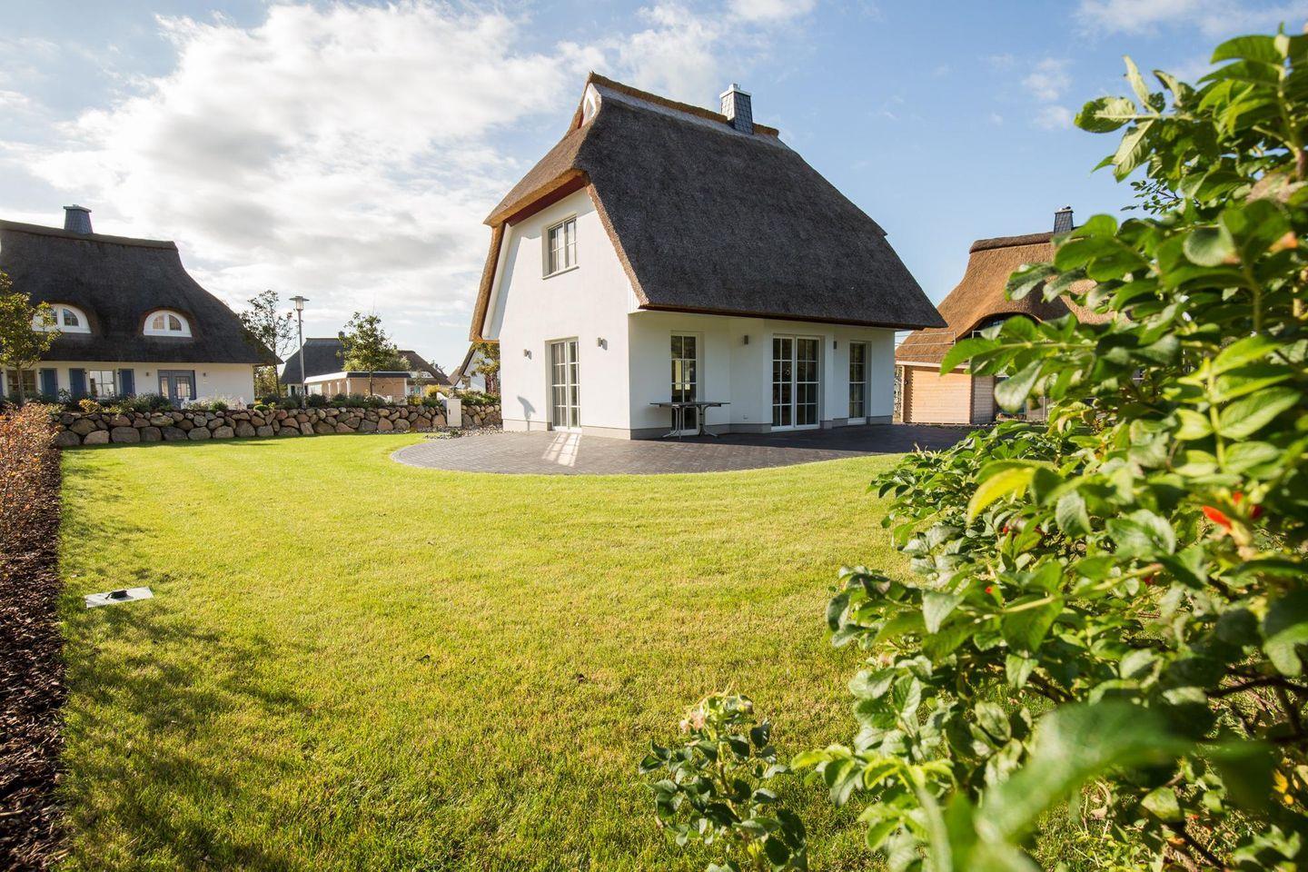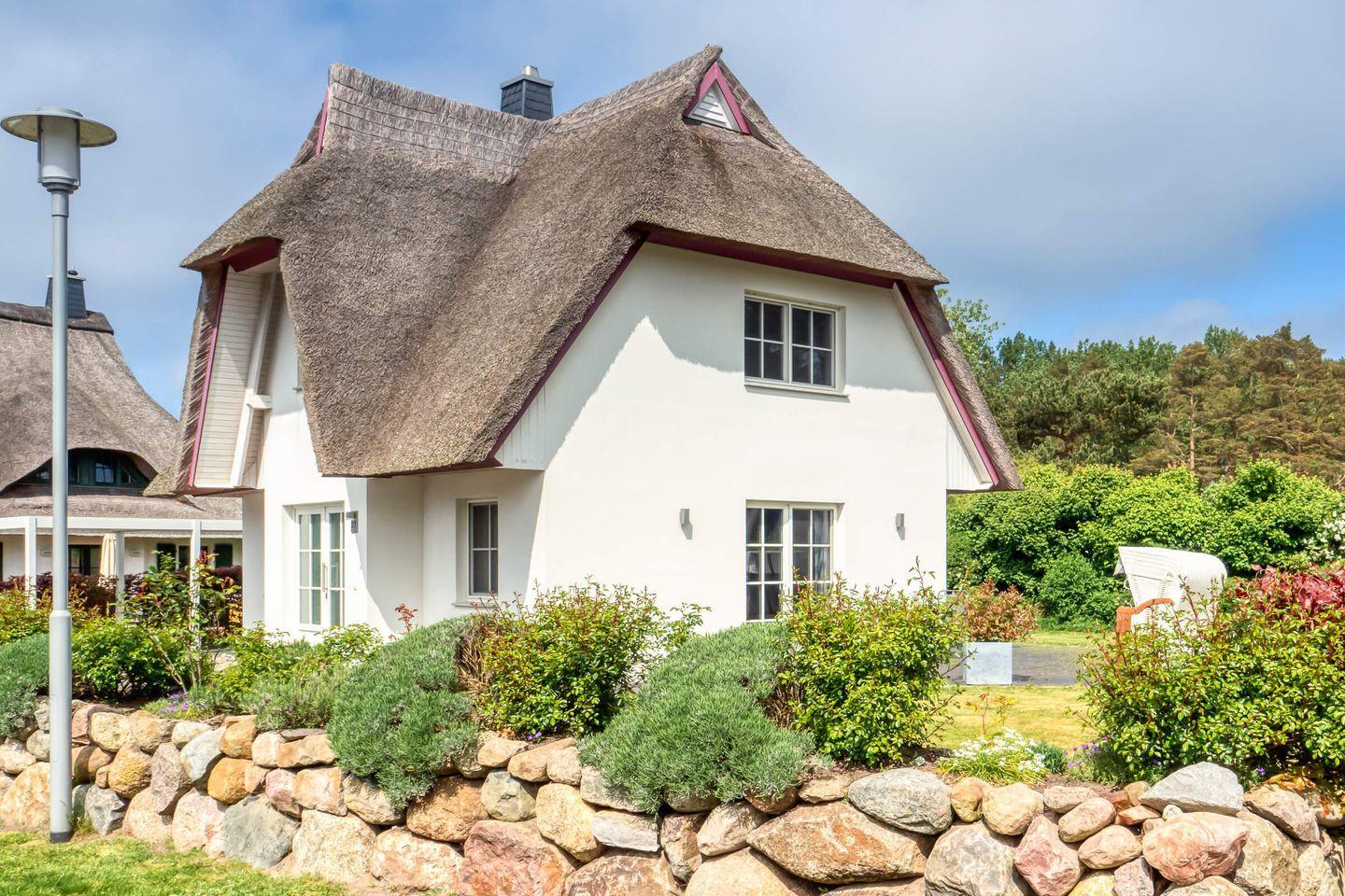 Dieses modern ausgestattete Ferienhaus mit traditionellem Reetdach, ortstypischer Feldsteineinfriedung und 754 m2 großem eingezäuntem Grundstück liegt in einer neuen entstehenden Ferienhausanlage. Es bietet viel Platz für vier Feriengäste (zwei Schlafzimmer mit Doppelbett und TV) und verfügt über einen großzügigen Wohn-Essbereich, ein einladendes Wannen-/Duschbad mit WC und Sauna im OG sowie ein Gäste-WC im EG.
