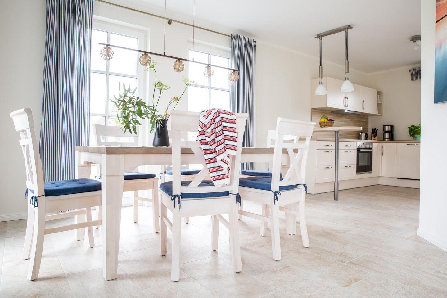 Im EG befindet sich ein ca. 30 qm großer Wohn-Essbereich mit gemütlicher Couchecke, Kaminofen, SAT-TV mit Sky und neben einer komplett ausgestatteten Küche ist ein Esstisch für 6 Personen vorhanden. Die großzügige Terrasse bietet einen herrlichen Blick auf den Teich und viel Morgen- und Abendsonne.