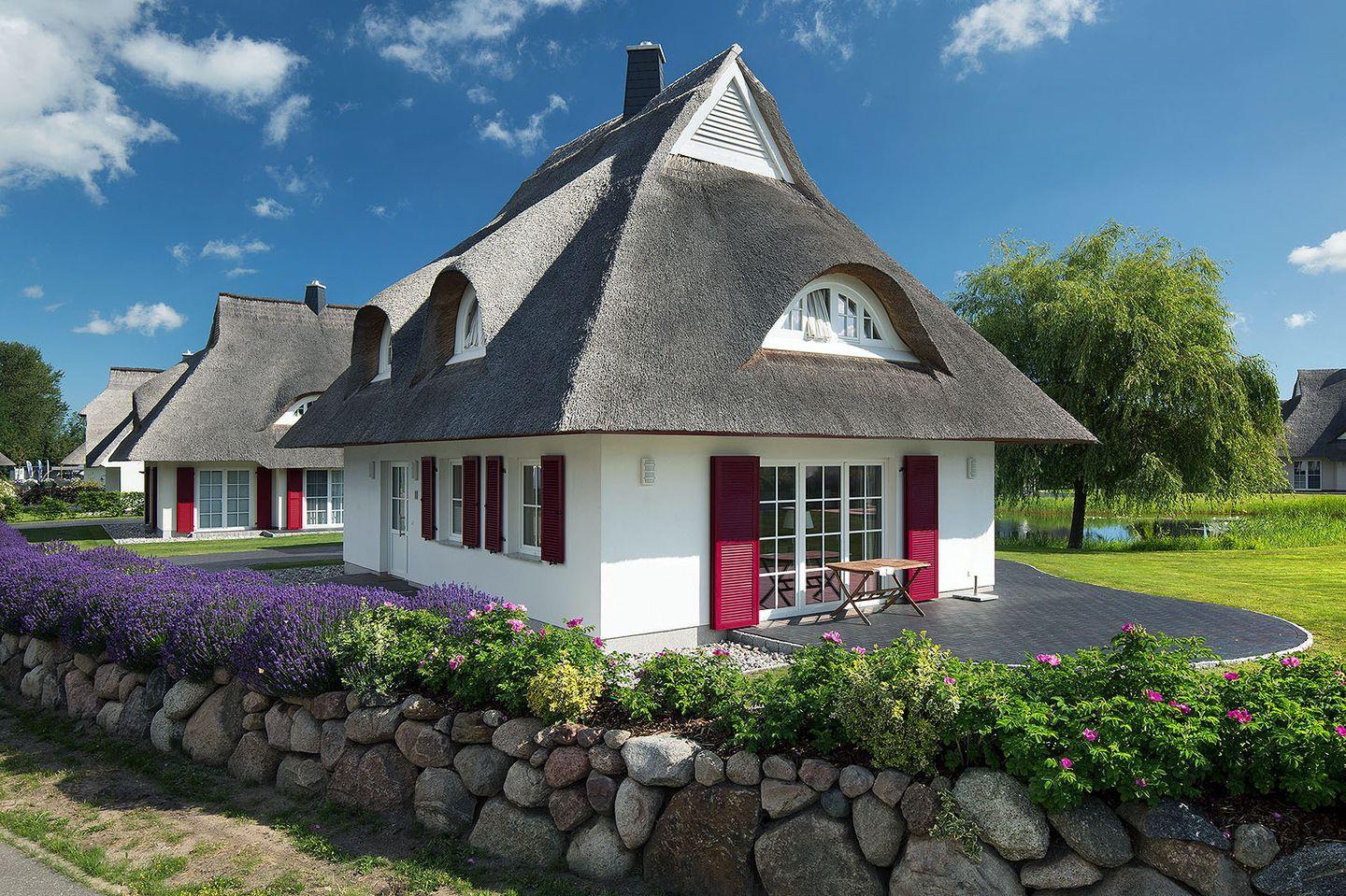 Dieses wunderschöne Ferienhaus mit traditionellem Reetdach, Fensterläden, ortstypischer Feldsteineinfriedung und 706 m2 großem Grundstück am Teich liegt in einer neuen Ferienhausanlage. Es bietet großzügig Platz für sechs Feriengäste (drei Schlafzimmer mit Doppelbett, davon eins im EG) und verfügt über zwei hochwertige Bäder und ein Gäste-WC, davon ein Bad mit Badewanne und Dusche, ein Bad mit Dusche und Sauna.