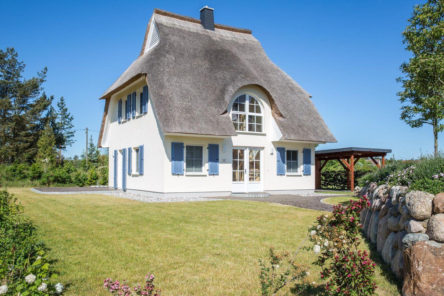 Das wunderschöne Ferienhaus mit traditionellem Reetdach, Fensterläden, ortstypischer Feldsteineinfriedung und 731 m2 großem Grundstück liegt in einer neuen Ferienhausanlage. Es bietet großzügig Platz für fünf Feriengäste (zwei Schlafzimmer mit Doppelbett, eins mit Einzelbett) und verfügt über ein Duschbad mit WC im EG sowie ein Bad mit Badewanne und Dusche im OG.