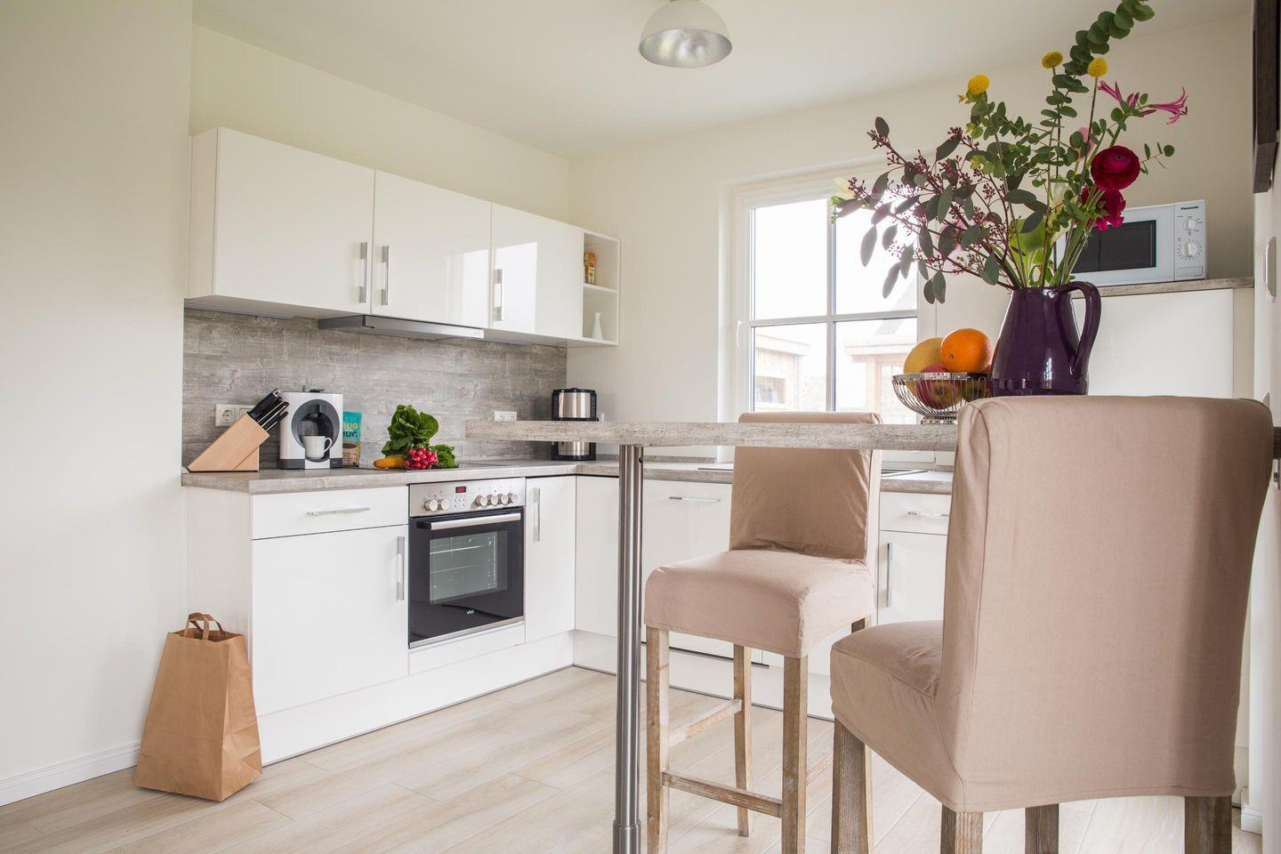 Im EG befindet sich ein ca. 30 qm großer Wohn-Essbereich mit gemütlicher Couchecke, Kaminofen, SAT-TV mit Sky und neben einer komplett ausgestatteten Küche ist ein Esstisch für 4 Personen vorhanden. Die Terrasse bietet viel Morgen- und Abendsonne.