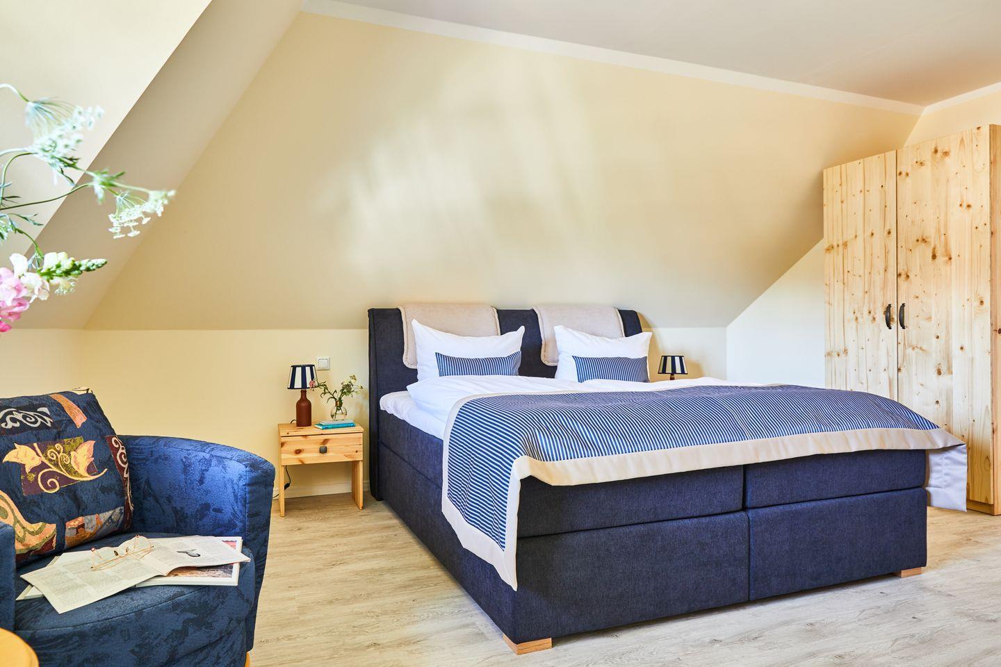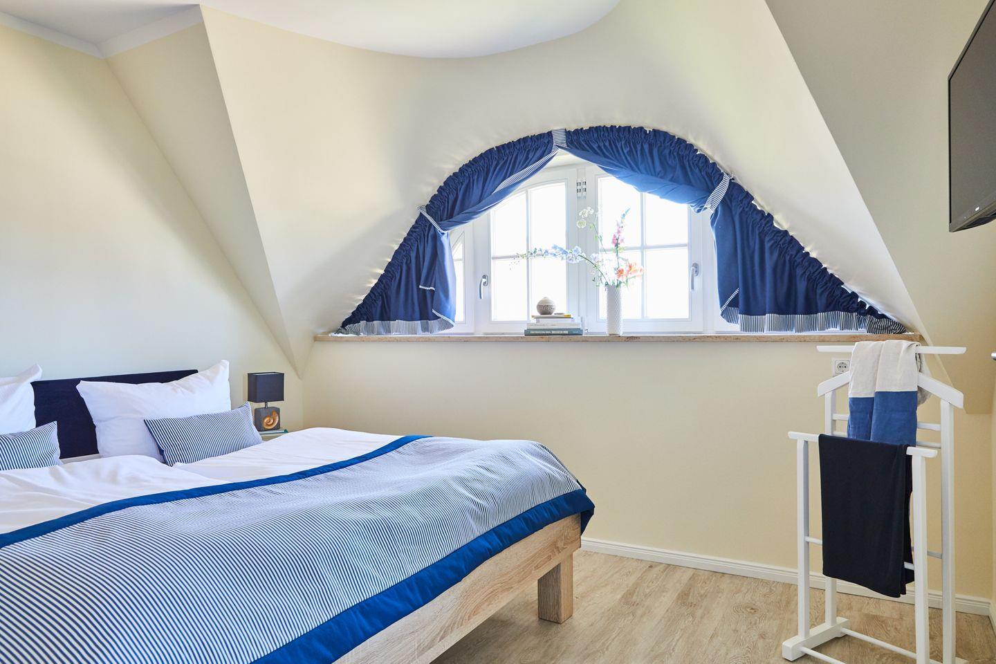 Dieses wunderschöne Ferienhaus mit traditionellem Reetdach, ortstypischer Feldsteineinfriedung und 1.468 m2 großem Grundstück liegt in einer neuen Ferienhausanlage. Es bietet großzügig Platz für acht Feriengäste (vier Schlafzimmer mit Doppelbetten (zwei Boxspringbetten), davon eins im EG) und verfügt über drei hochwertige Bäder und ein Gäste-WC, davon ein ein Bad mit Dusche im Erdgeschoss, Bad mit Badewanne und ein Bad mit Dusche und Sauna im Obergeschoss.