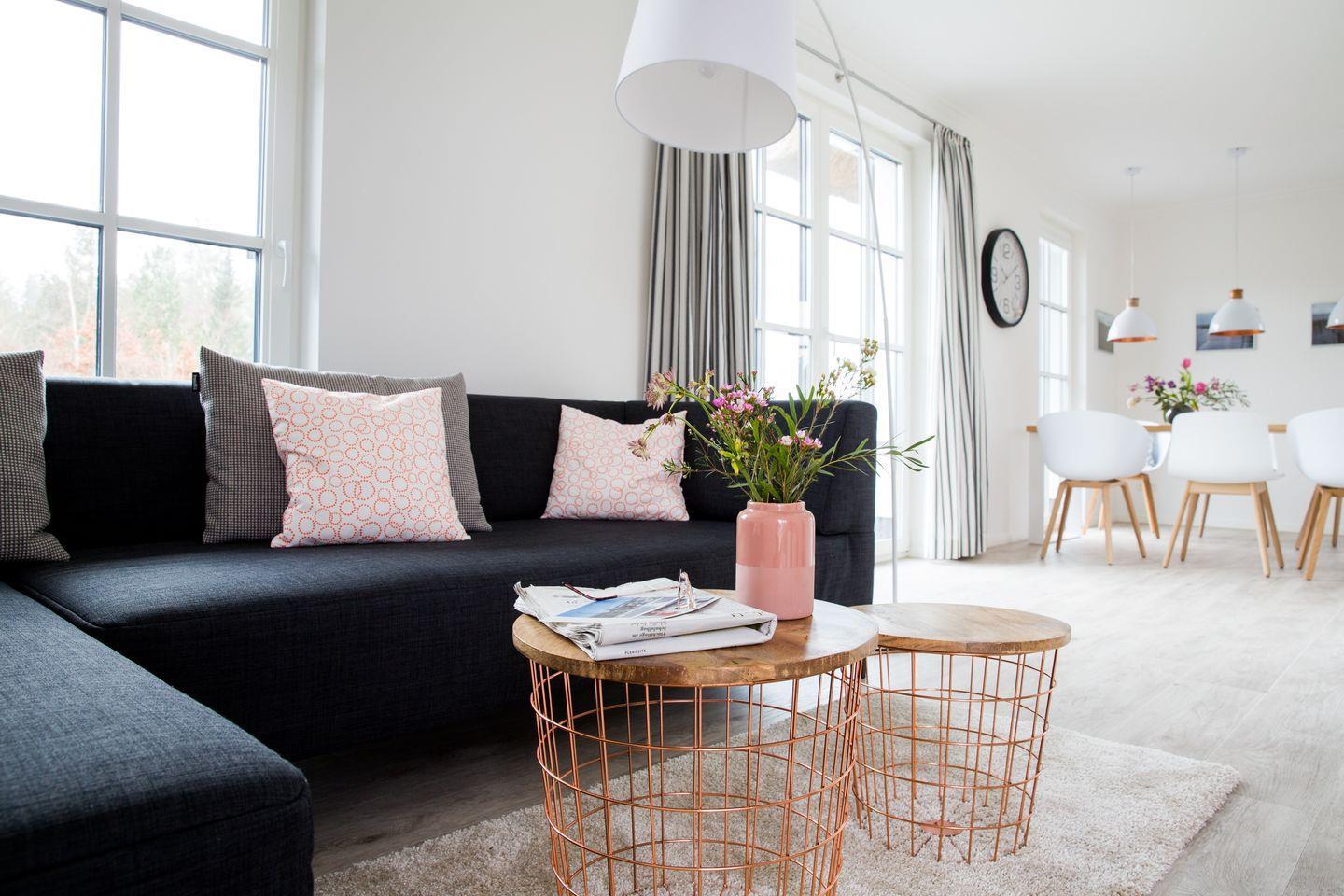 Im EG befindet sich ein ca. 30 qm großer Wohn-Essbereich mit gemütlicher Couchecke, Kaminofen, SAT-TV mit Sky und neben einer komplett ausgestatteten Küche mit Küchenmaschine ist ein Esstisch für 6 Personen vorhanden. Die großzügige Terrasse bietet viel Morgen- und Abendsonne.