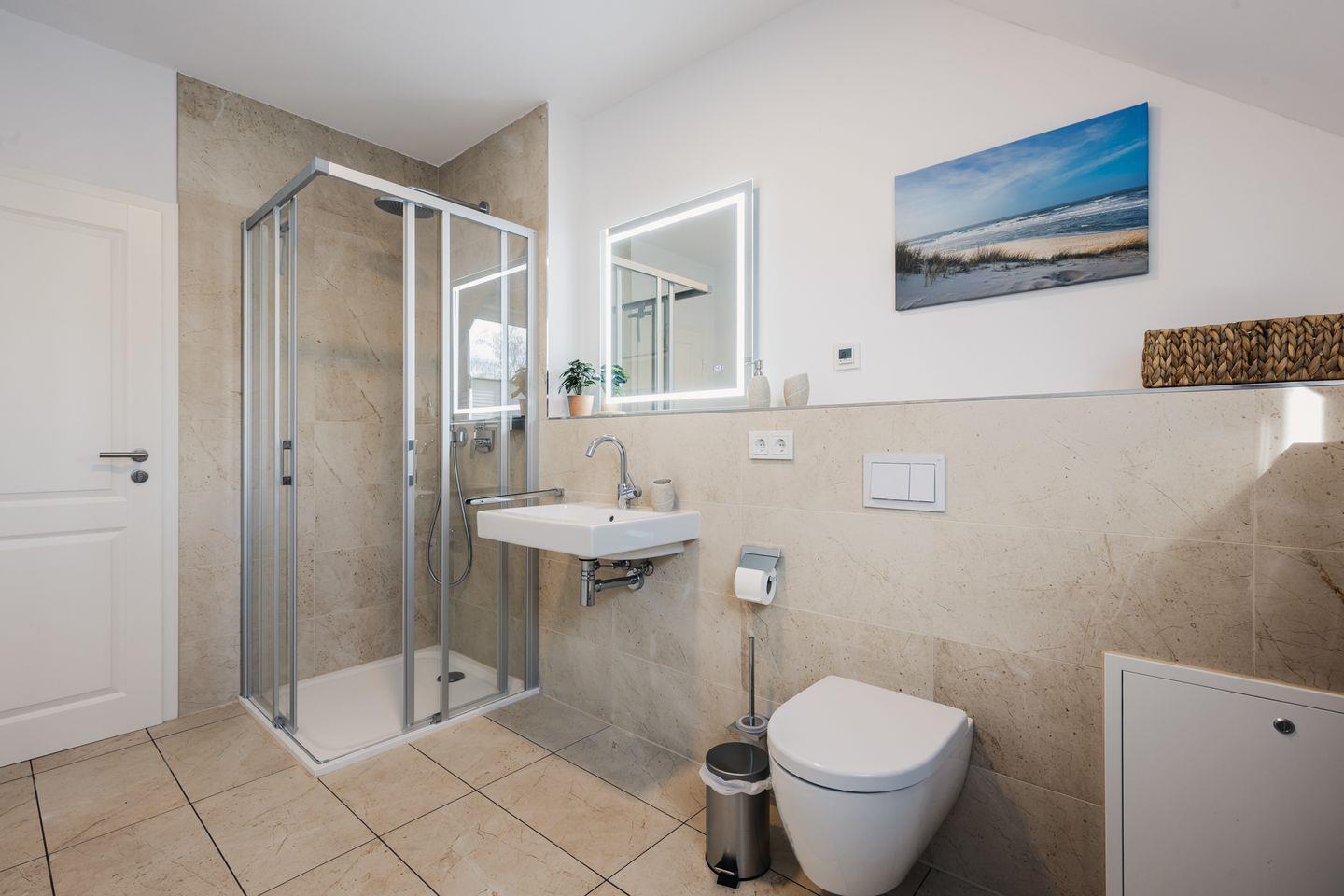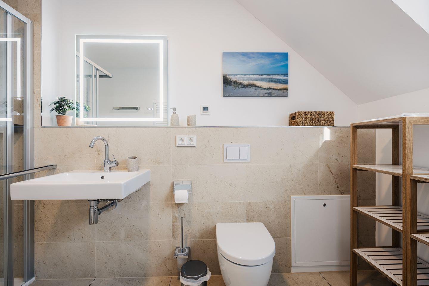 Die offene Küchenzeile mit anliegendem Essbereich ist mit einen Geschirrspüler, Kühlschrank mit Gefrierfach, Kaffeemaschine, 4-Platten-Induktionsherd, Backofen-Mikrowellen-Kombination und Wasserkocher ausgestattet. Natürlich finden Sie hier auch Geschirr und Besteck sowie weitere Küchengeräte und Utensilien.