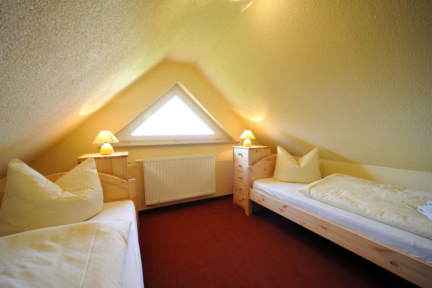 Das Obergeschoss beherbergt zwei Schlafzimmer: Ein großes Schlafzimmer mit einem komfortablen Doppelbett und einem großzügigen Kleiderschrank sowie ein Kinderschlafzimmer mit zwei Einzelbetten. Das dazugehörige Bad ist mit einer Badewanne, einer Dusche, einem WC und zwei Waschtischen ausgestattet, was zusätzlichen Komfort bietet. Im Dachgeschoss finden Sie ein weiteres Schlafzimmer mit zwei Einzelbetten, das zusätzlichen Platz für Ihre Mitreisenden bietet.