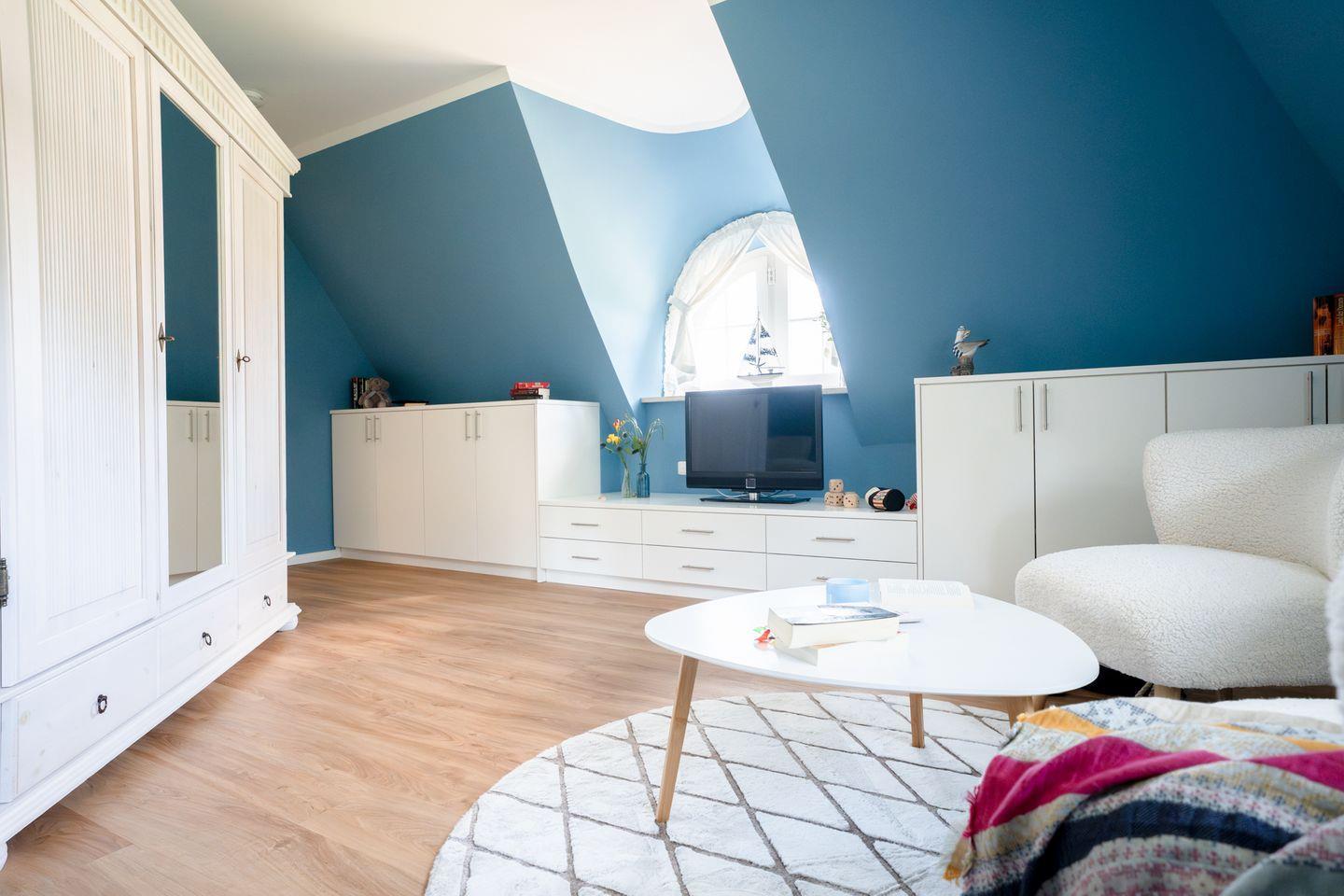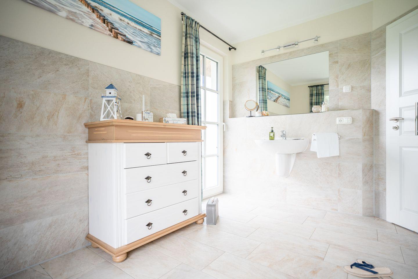 Dieses wunderschöne Ferienhaus mit traditionellem Reetdach, Fensterläden, ortstypischer Feldsteineinfriedung und großem, eingezäuntem Grundstück liegt in einer neuen Ferienhausanlage. Es bietet großzügig Platz für sechs Feriengäste (drei Schlafzimmer mit Doppelbett, davon eins im EG) und verfügt über zwei hochwertige Bäder und ein Gäste-WC, davon ein Bad im Erdgeschoss mit Dusche, ein Bad im Obergeschoss mit Dusche und Sauna.
