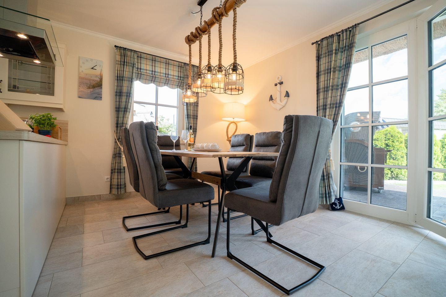 Im Erdgeschoss befindet sich ein ca. 30 qm großer Wohn-Essbereich mit gemütlichen Sitzmöglichkeiten, Kaminofen, SAT-TV mit Sky und neben einer komplett ausgestatteten Küche ist ein großer Esstisch für sechs Personen vorhanden.