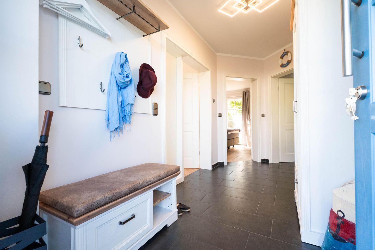 Dieses wunderschöne Ferienhaus mit traditionellem Reetdach, ortstypischer Feldsteineinfriedung und eingezäuntem Grundstück liegt in einer neuen Ferienhausanlage. Es bietet großzügig Platz für sechs Feriengäste, davon 2 Kinder. (zwei Schlafzimmer mit Doppelbett, davon eins im EG, ein Schlafzimmer mit Kinderetagenbett) und verfügt über zwei hochwertige Bäder und ein Gäste-WC, davon ein Bad mit Badewanne und Dusche, ein Bad mit Dusche und Sauna. Im Erdgeschoss befindet sich ein ca. 30 qm großer Wohn-Essbereich mit gemütlichen Sitzmöglichkeiten, Kaminofen, SAT-TV mit Sky und neben einer komplett ausgestatteten Küche ist ein großer Esstisch für sechs Personen vorhanden.