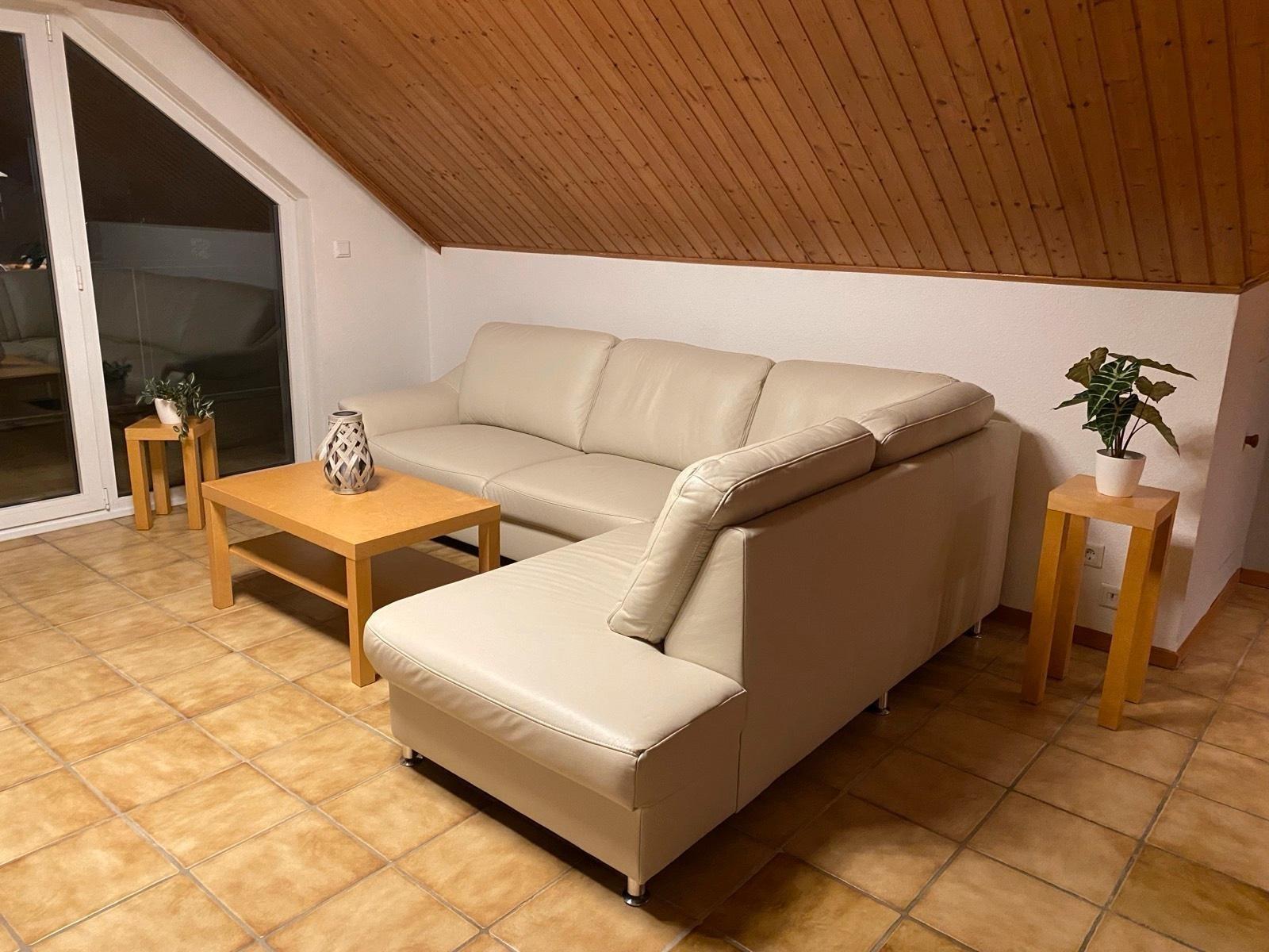 Auf ca. 63 qm gibt es in dieser Dachgeschosswohnung eine kleine Küche mit Ceranfeld, Backofen und Dunstabzugshaube, Kühlschrank mit Gefrierfach, Geschirrspüler und Esstisch für drei Personen. Toaster, Entsafter und Eierkocher sowie ein Handmixer und diverse Küchenhelfer stehen zur Zubereitung gesunder Mahlzeiten oder Snacks zur Verfügung.