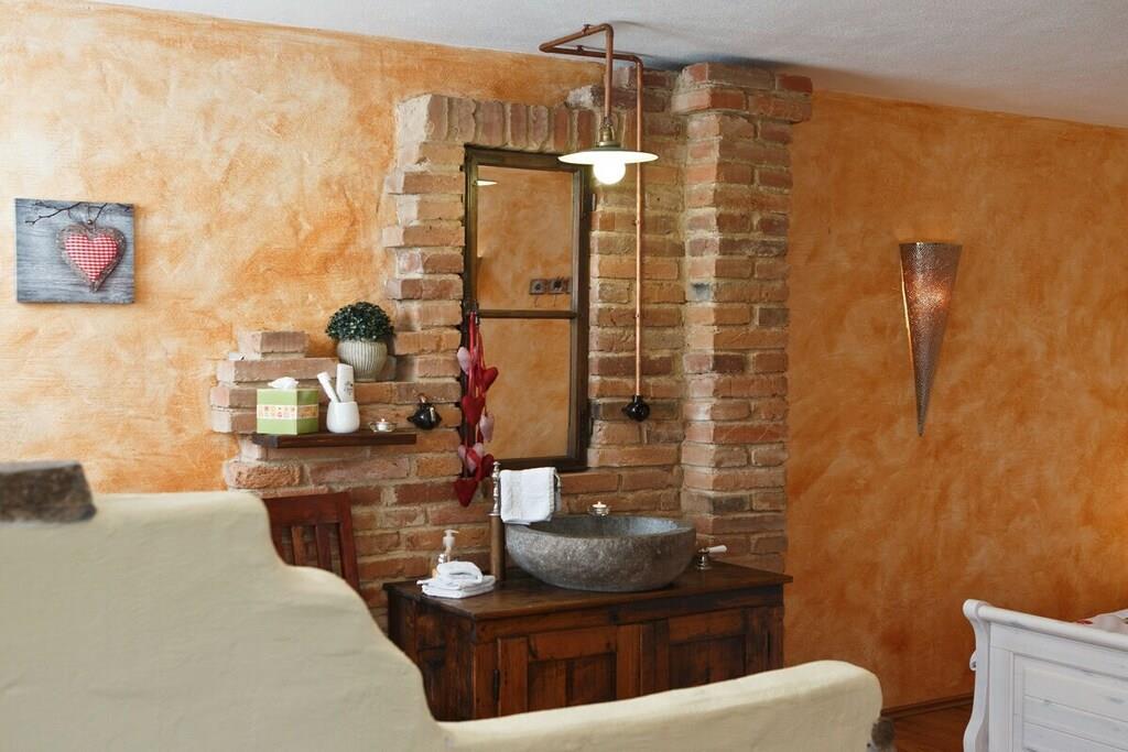 Vores romantiske ferielejlighed er et lyst rum på 45 kvm, indrettet i en moderne landlig stil med originale byggematerialer i forskellige jordfarver. Et slående træk er stenvasken. Der er også et moderne tekøkken i landlig stil med en hyggelig spiseplads og en komfortabel opholdsstue med en sovesofa. Det romantiske soveområde fuldender lejligheden. På den store terrasse kan du nyde morgenmaden i morgensolen eller endda tage dit første slag fra golfbanen lige før morgenmaden.