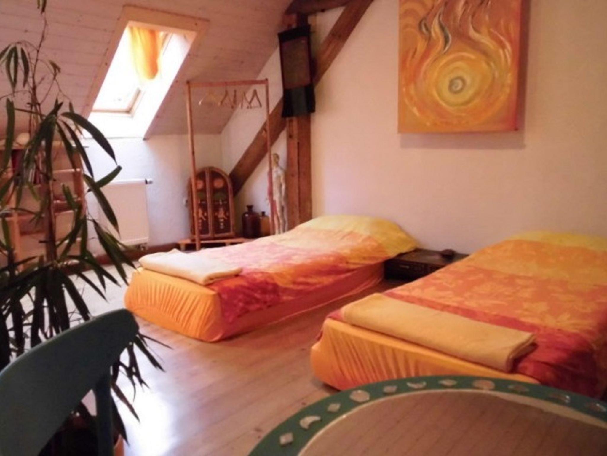 Idyllisches Anwesen mit begrüntem Innenhof und Gartenpark zum Entspannen. Direkte Anbindung an Mainradweg, B26 und A70. Auf dem Gelände: Gäste- und Seminarhaus, euraisches Cafe und Bazar, Flohmarkt, Kunstausstellungen. Im Garten: Hängematten, Seen, Feuerstelle. Frühstück auf Wunsch a 6,5 € pro Person (Kinder bis 6 zahlen die Hälfte). Von Mai bis September wochenends mit eurasischem Cafe (Snacks aus Asien, Süßes aus dem Biogarten) - Verköstigung für Kleingruppen auch auf Anfrage möglich. Auf Anfrage kann die Küche im Seminarhaus angemietet werden. Wlan kostenlos, Kinderfreundlich (es gibt viel Spielzeugs, Sandkasten, Schaukel. Familienbetrieb.