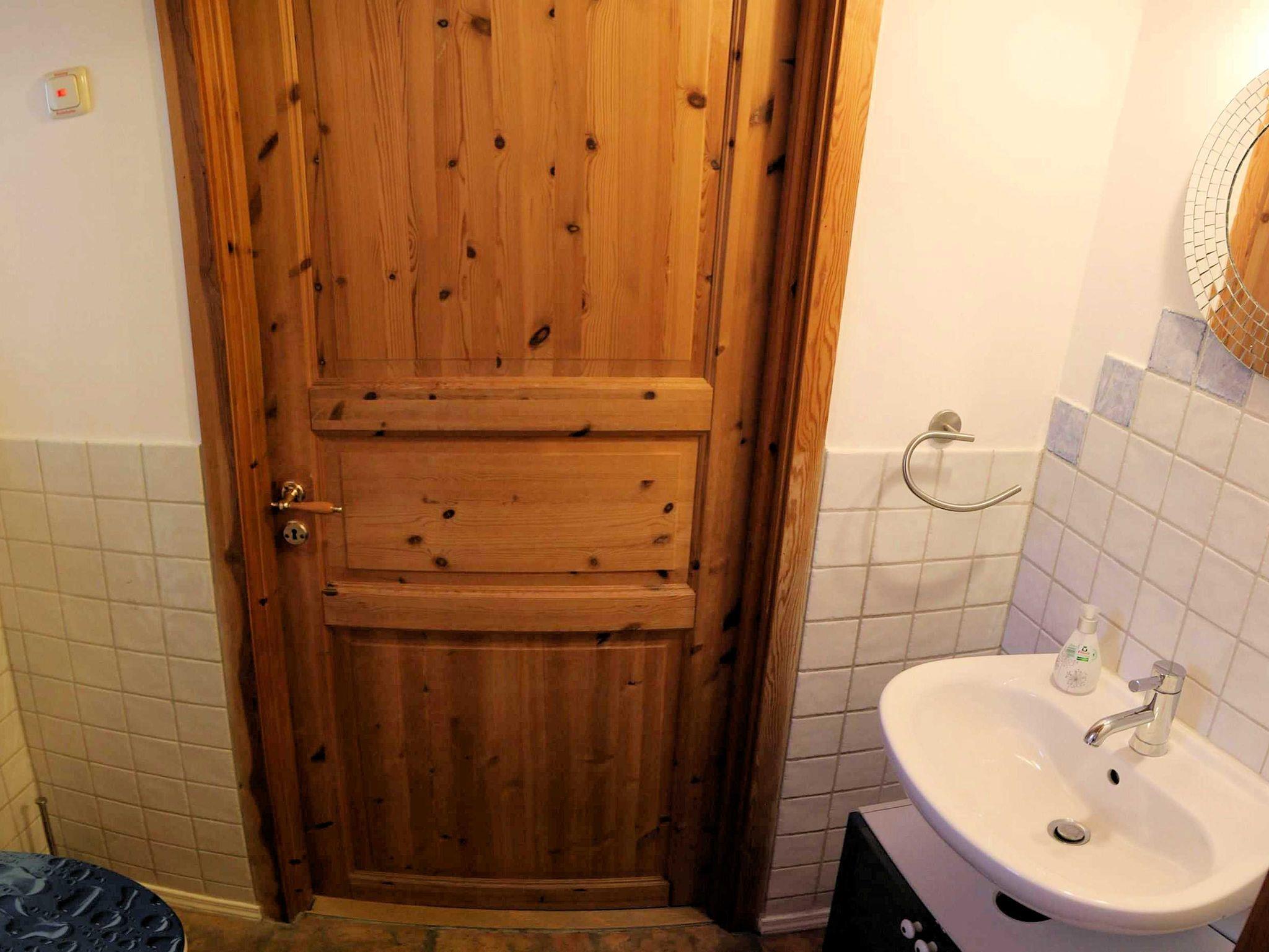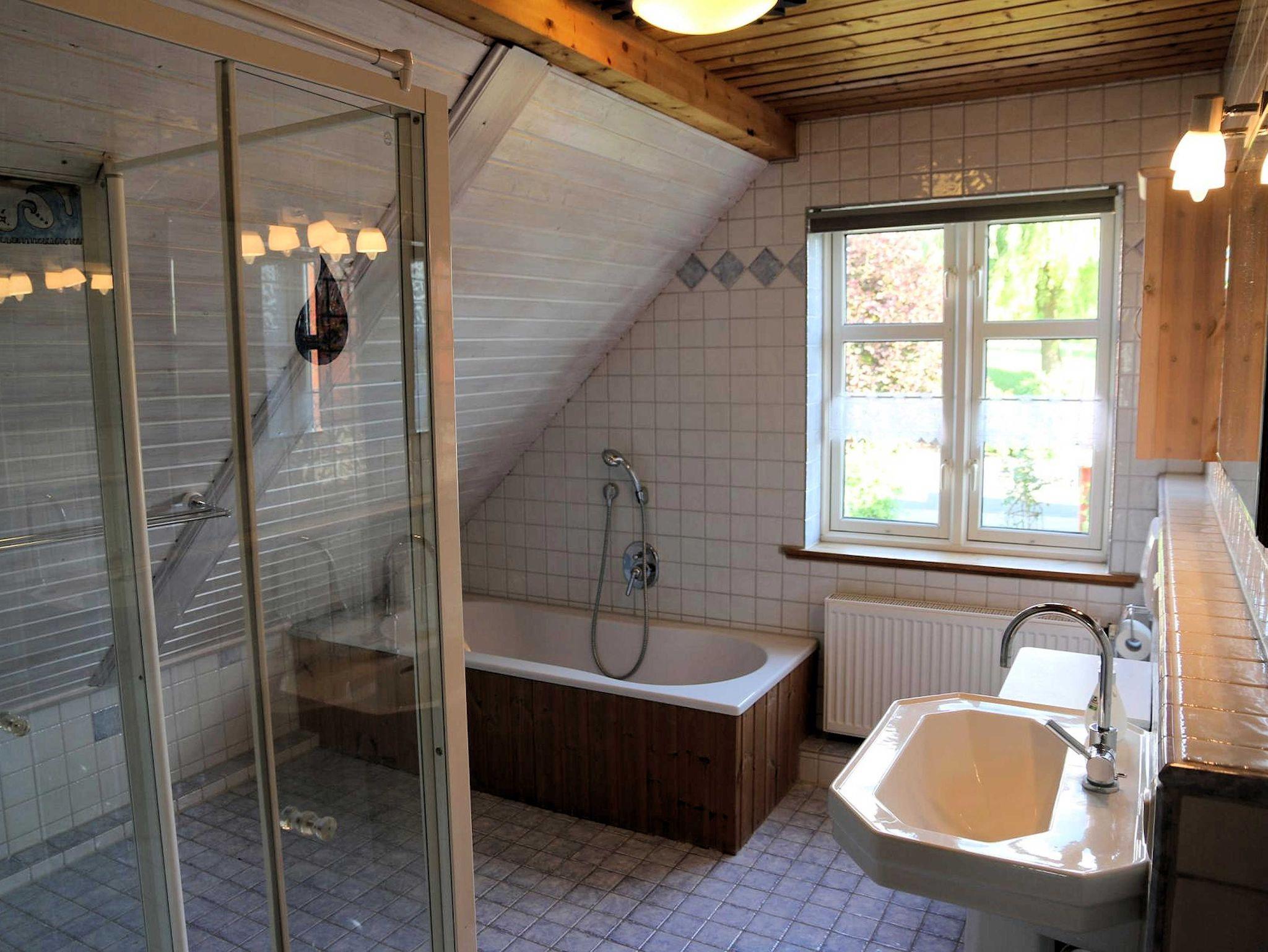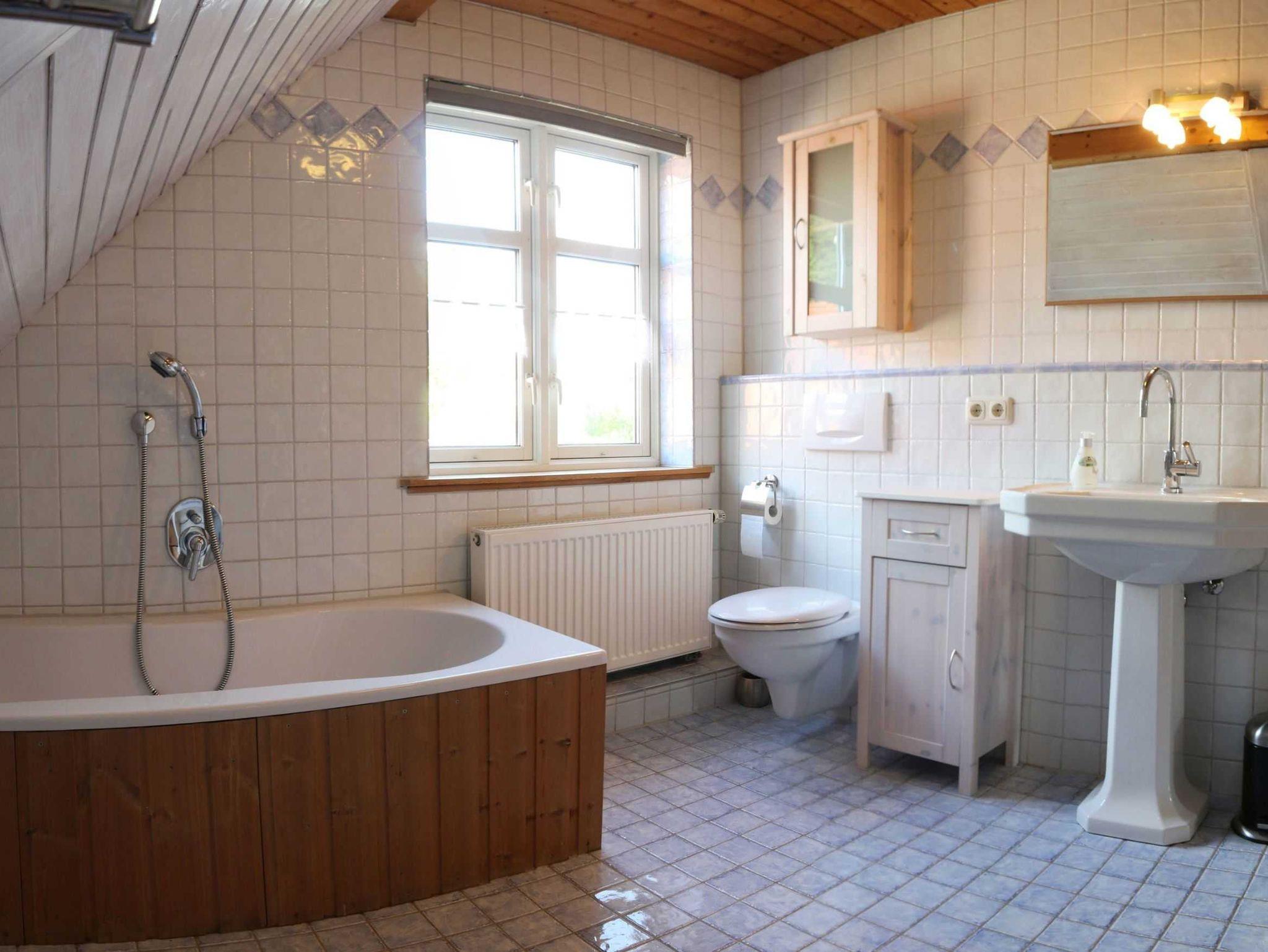 Im oberen Stock liegt das Badezimmer mit Duschkabine, Badewanne, WC und Waschbecken und drei Schlafräume. Ein Zimmer mit einem Einzelbett, ein Zimmer mit Doppelbett und ein Zimmer mit Doppelbett und einem Einzelbett.