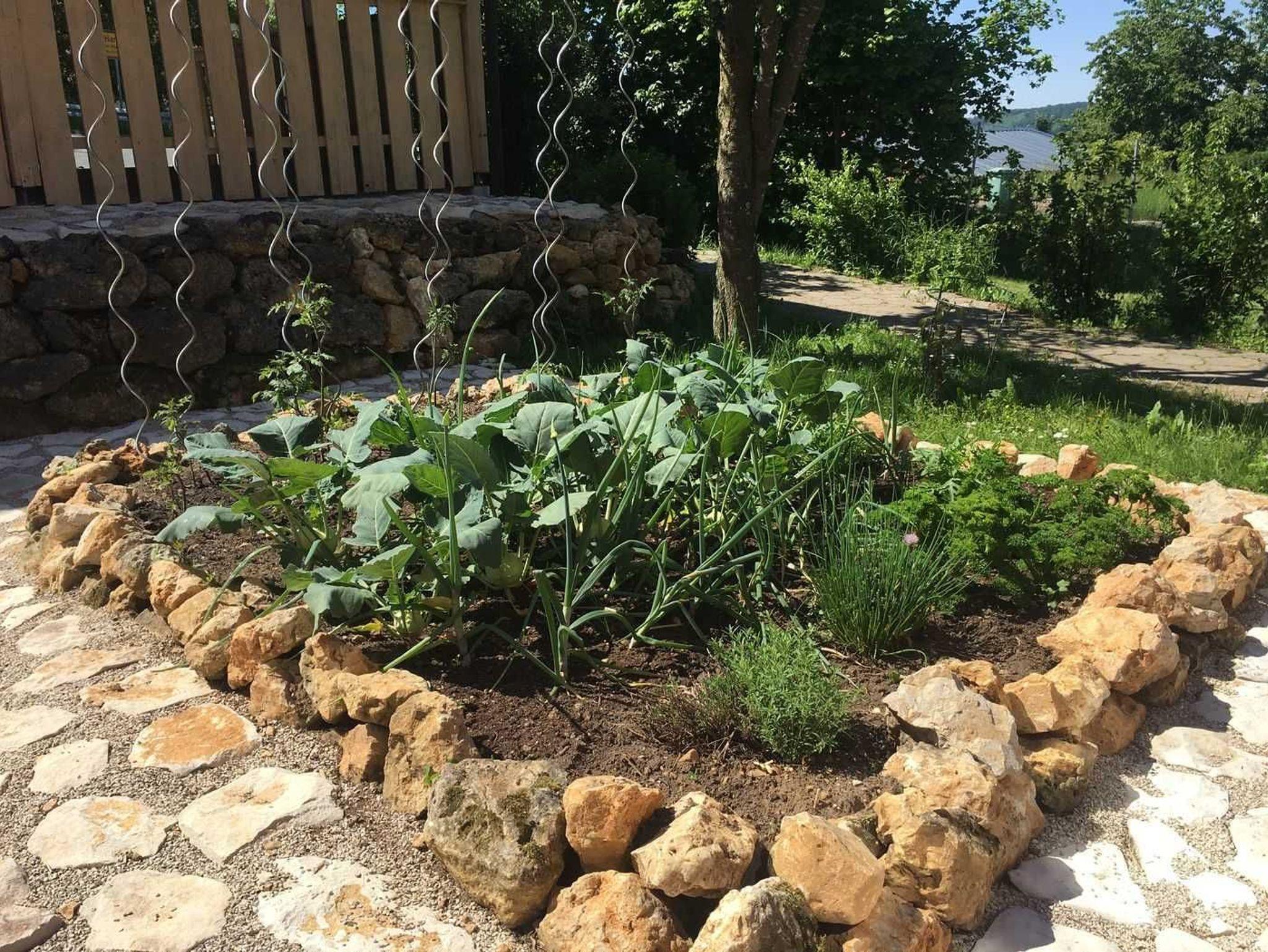 Der Garten bietet ein großes Wiesengrundstück mit Gartengrill, ein Gemüsebeet und Obstbäume, Je nach Jahreszeit können dort auch die Früchte geerntet werden.