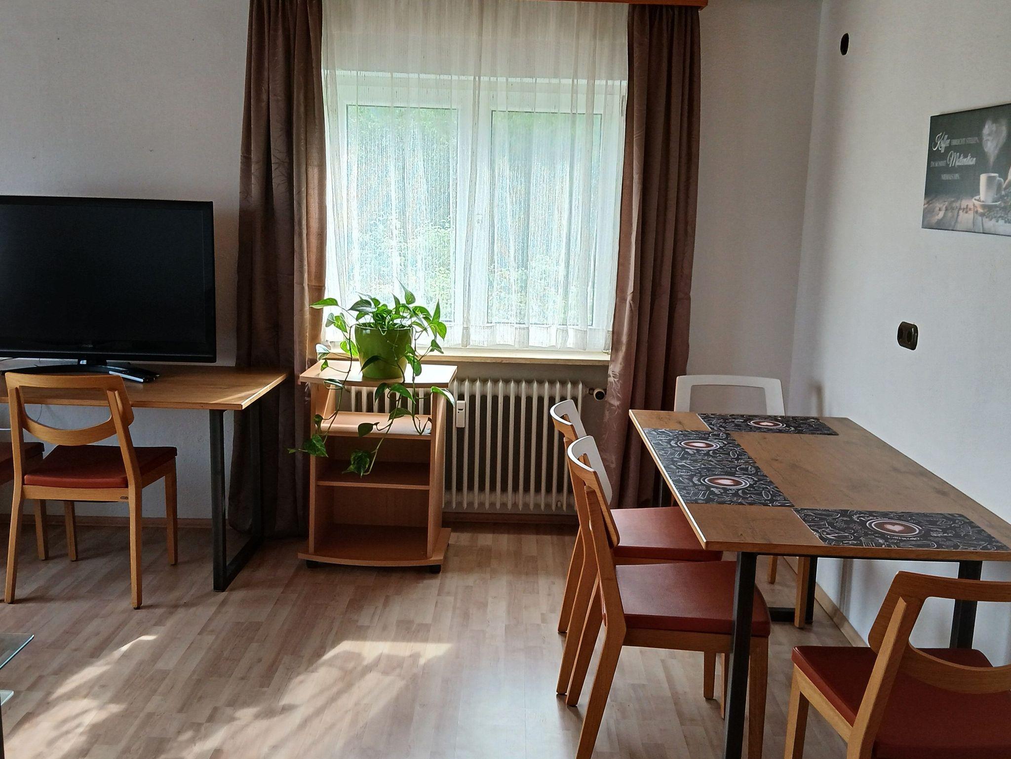 Im Wohnzimmer ist neben dem Sitzbereich ein Essbereich und ein TV vorhanden.