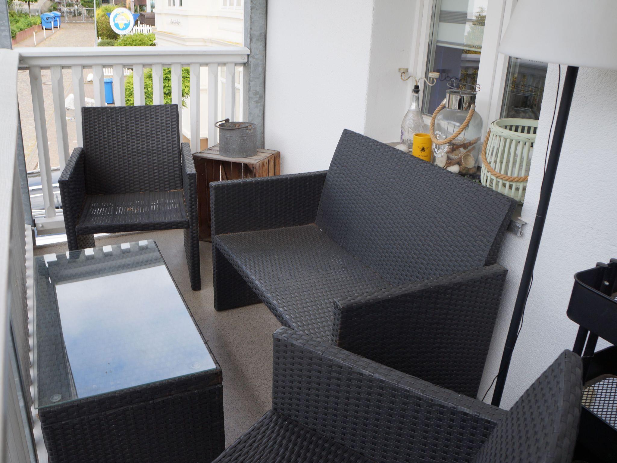 Die 2-Raum-Maisonette-Fewo ist ca. 75 qm gross und hat einen Südbalkon. Sie verfügt über ein Schlafzimmer mit Doppelbett und Einzelbett, ein Wohnzimmer mit komplett eingerichteter Küchenzeile, Sitzecke mit Schlafsofa und Essecke und über ein Bad mit Dusche und WC.