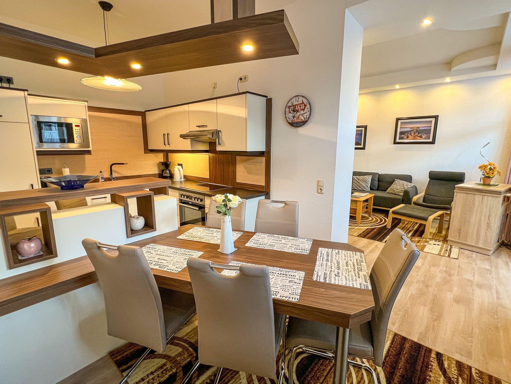 Die helle und geräumige Ferienwohnung (75 m²/1.Etage)) mit einem großen Balkon vor allen Zimmern, einer komfortablen Küche mit Essecke (Spülmaschine), großem Schlafzimmer mit Doppelbett und Aufbettung auf einer Schlafcouch für eine weitere Person, Wohnzimmer mit Doppelschlafcouch (1,90 x 1,35) und DU/WC steht für die Gäste zur Verfügung.