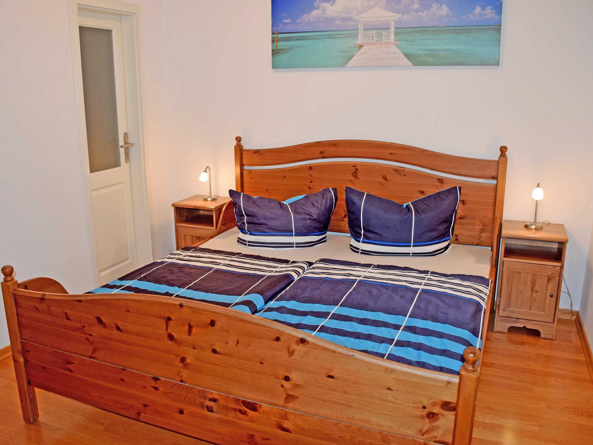 1 offenes Schlafzimmer mit Doppelbett (180 x 200 cm), Nachttischen und Flat-TV 32 sowie CD-Radio-Anlage.