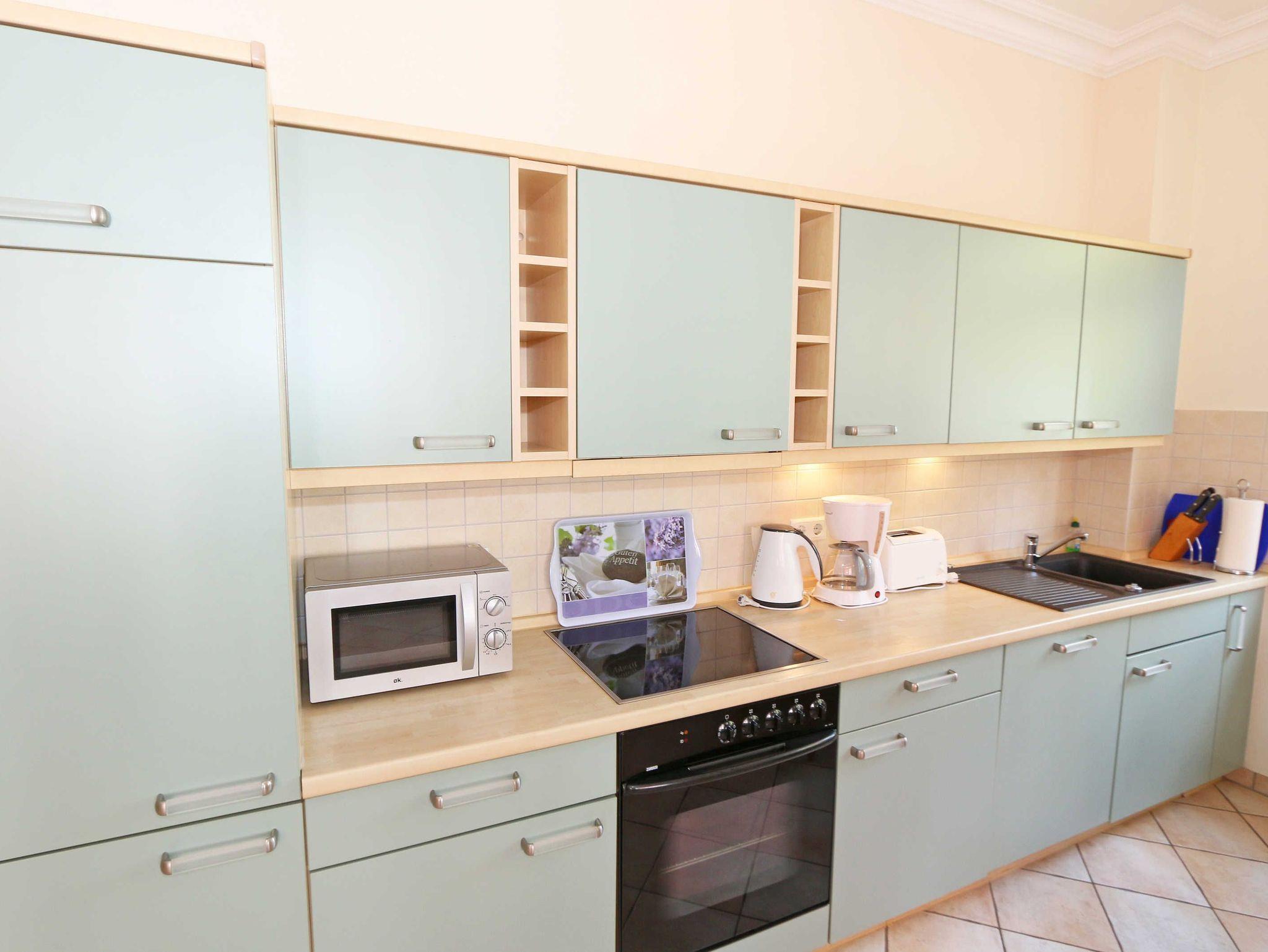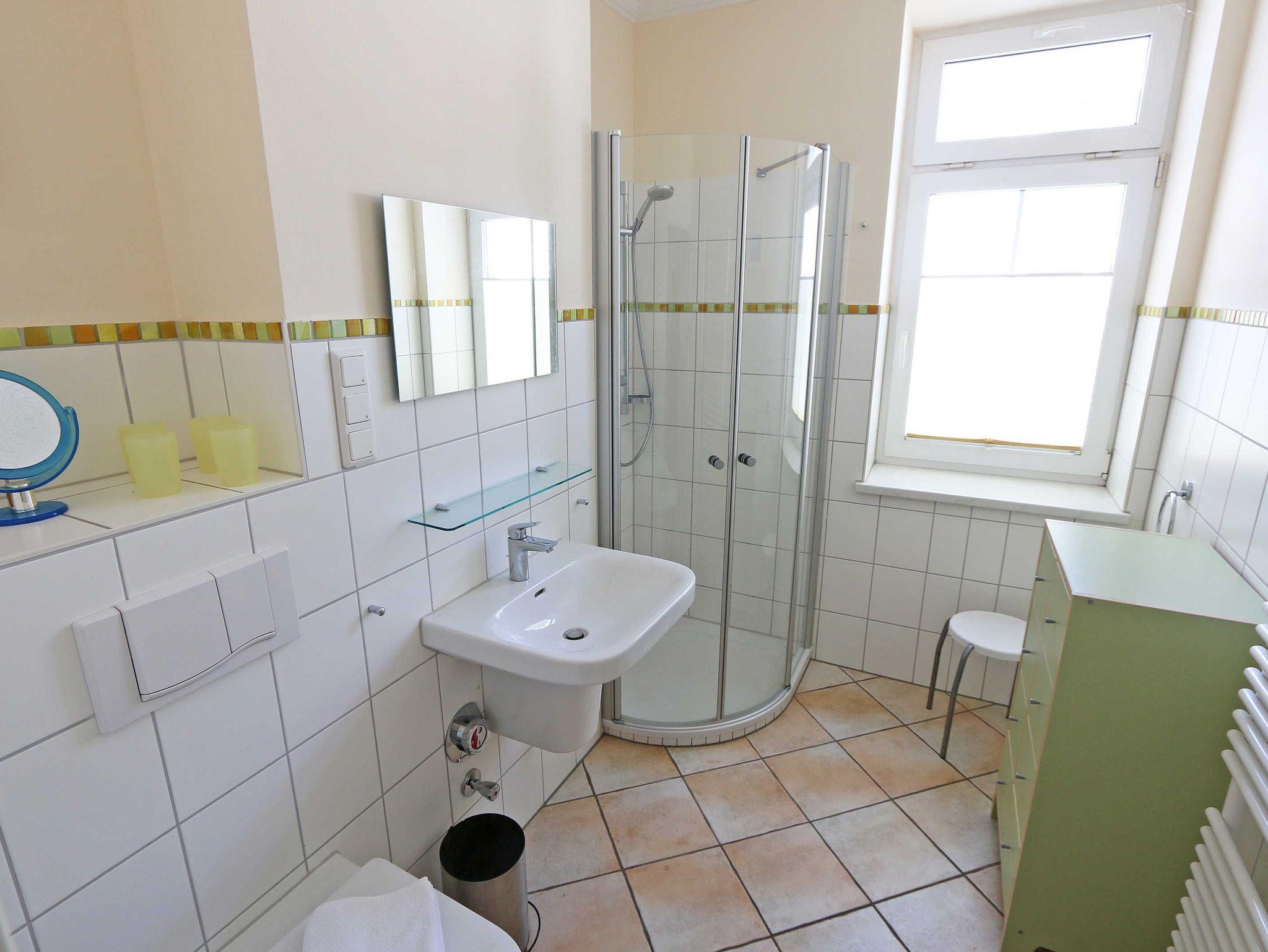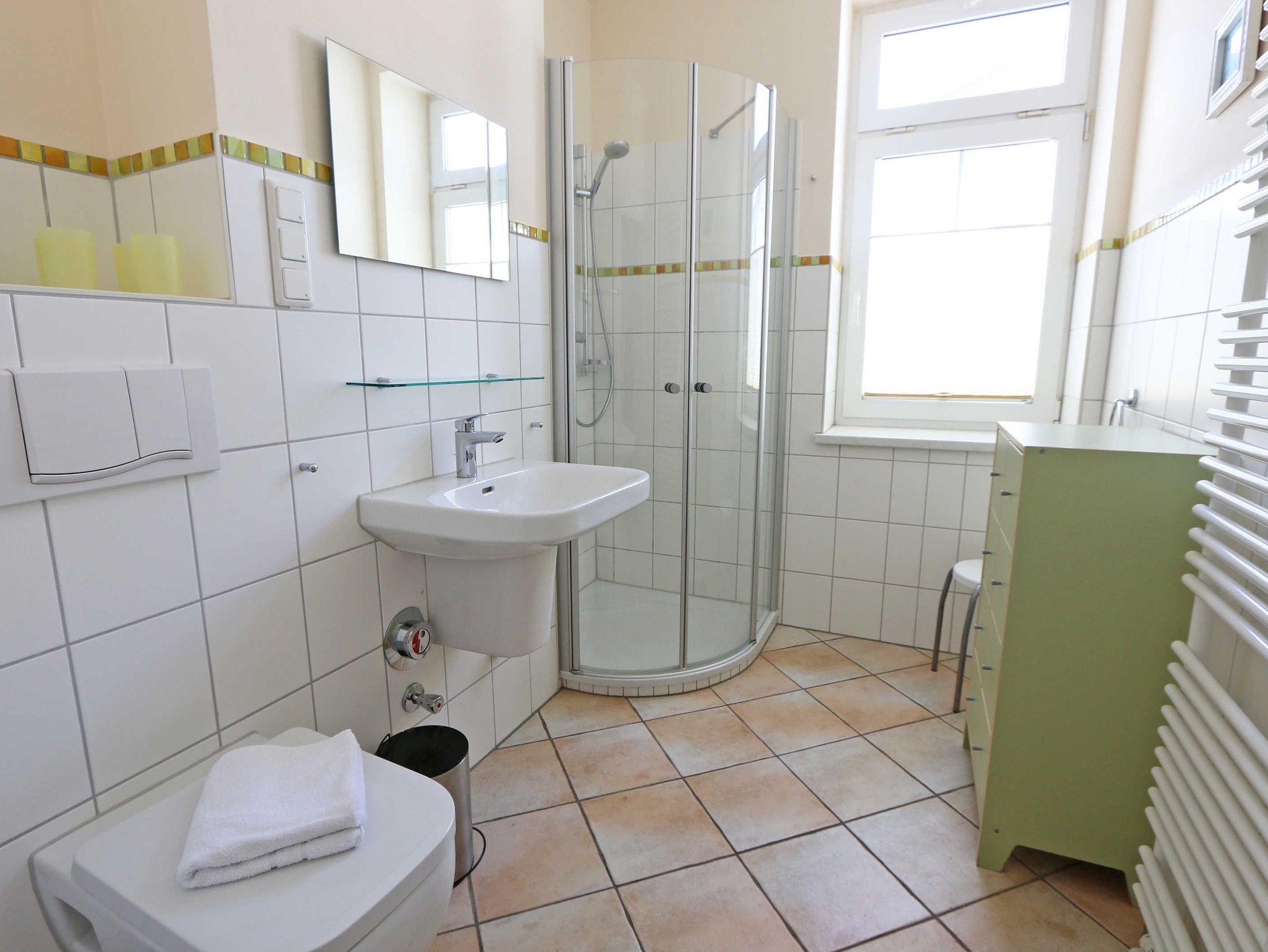 Die 2-Raumferienwohnung (Nichtraucher) liegt im 1. Obergeschoss und bietet mit Ihren ca. 50 qm genug Platz für 2-4 Personen. Durch die vollverglaste Veranda ist der kombinierte Wohn/Koch- und Essbereich sehr hell und freundlich. Die integrierte Küchenzeile mit Cerankochfeld, Backofen, Geschirrspüler, Mikrowelle, Kühlschrank, Gefrierfach, Kaffeemaschine, Wasserkocher, Toaster und diverse Küchenutensilien werden durch einen Essplatz für 4 Personen komplettiert. Der angrenzende und offene Wohnbereich besteht aus einem Sofa, welches zu einem Doppelbett (1,60m x 2,00m) ausgezogen werden kann, einem Sessel, Couchtisch und kleinem Beistelltisch. Abgerundet wird der Wohnbereich mit einem Flachbild-TV, DVD-Player und Mini-Stereo-Anlage mit USB-Anschluss. Auch auf einen Internetanschluss (WLAN) müssen Sie nicht im Urlaub verzichten. Ein Kleiderschrank bietet genügend Platz für Ihre Bekleidung. Das Schlafzimmer verfügt über ein Doppelbett (1,80m x 2,00m), Nachttischablagen, einer geräumigen Kommode und einem Wandspiegel. Das Tageslichtbad wird durch eine ebenerdige Dusche, Waschplatz, Handtuchtrockner, WC und Fön abgerundet. Alle Räumlichkeiten sind mit Raff-Plissees bzw. Lamellenstores versehen. Im Keller des Hauses können Sie eine Waschmaschine sowie ein Trockner gegen Gebühr nutzen. 1 Haustier (keine Katzen) ist gegen eine Gebühr ein gern gesehener Gast. Ein PKW-Stellplatz Nr. 04 befindet sich direkt hinter dem Haus. Ihre mitgebrachten Fahrräder oder auch geliehenen Räder können Sie im Fahrradschuppen verschließen. Die Erstausstattung eines Wäschepaketes (komplette Bettwäsche, 1 Duschhandtuch, 2 kleine Handtücher) können Sie bis 14 Tage vor Anreise gegen einen Aufpreis dazu buchen oder durch eigene ergänzen. Ab 2 gebuchten Paketen erhalten Sie einmalig 1 Geschirrhandtuch und 1 Duschvorleger hinzu.