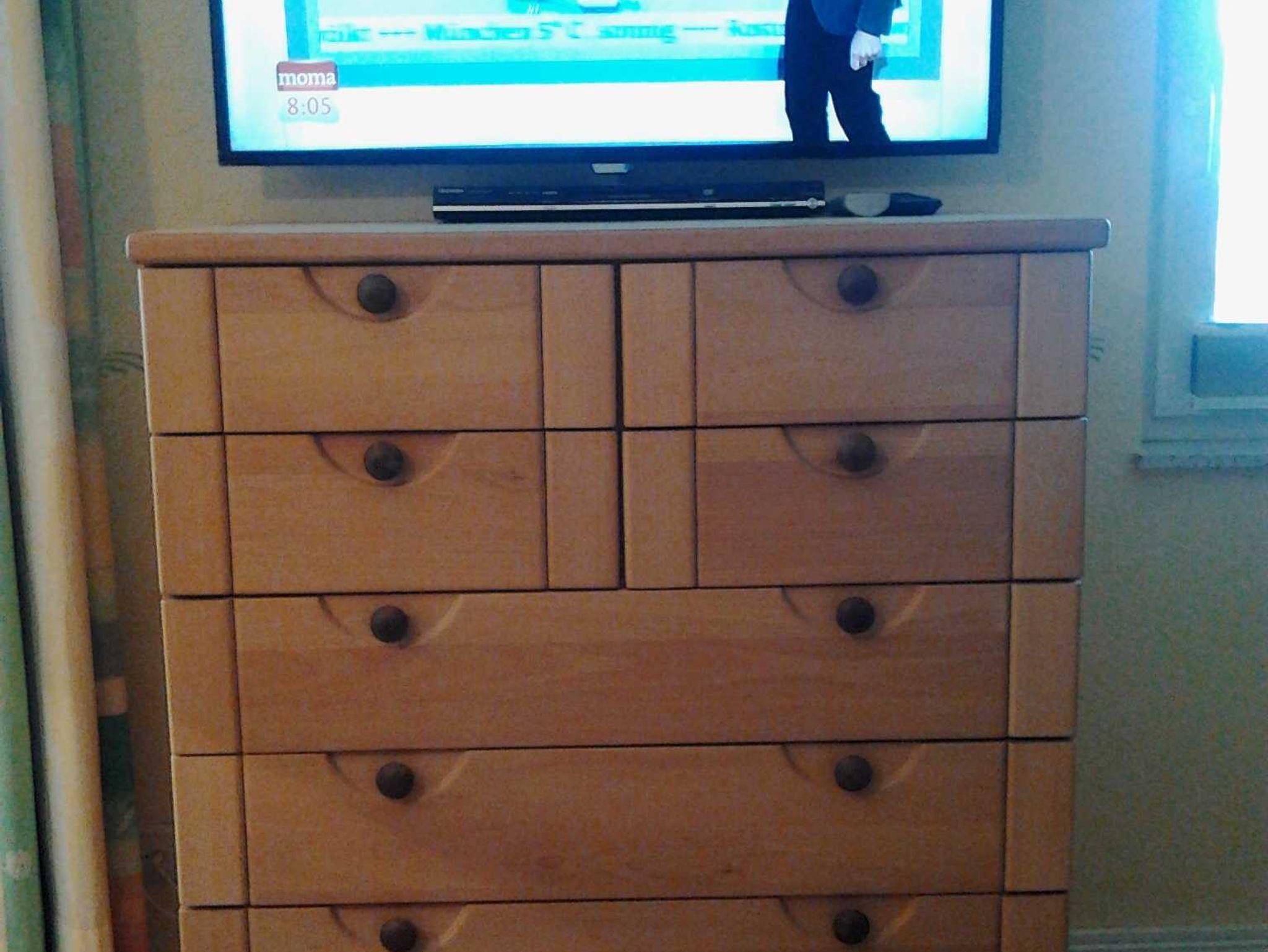 * den Wohnraum mit einem weiteren Schrank, Schlafsofa (Aufbettung für den 3. und 4. Gast), Sesseln, Couchtisch, Sideboard, Kommode, und TV, Stereoanlage mit CD-Player und Radio, sowie eine gemütliche Essecke;